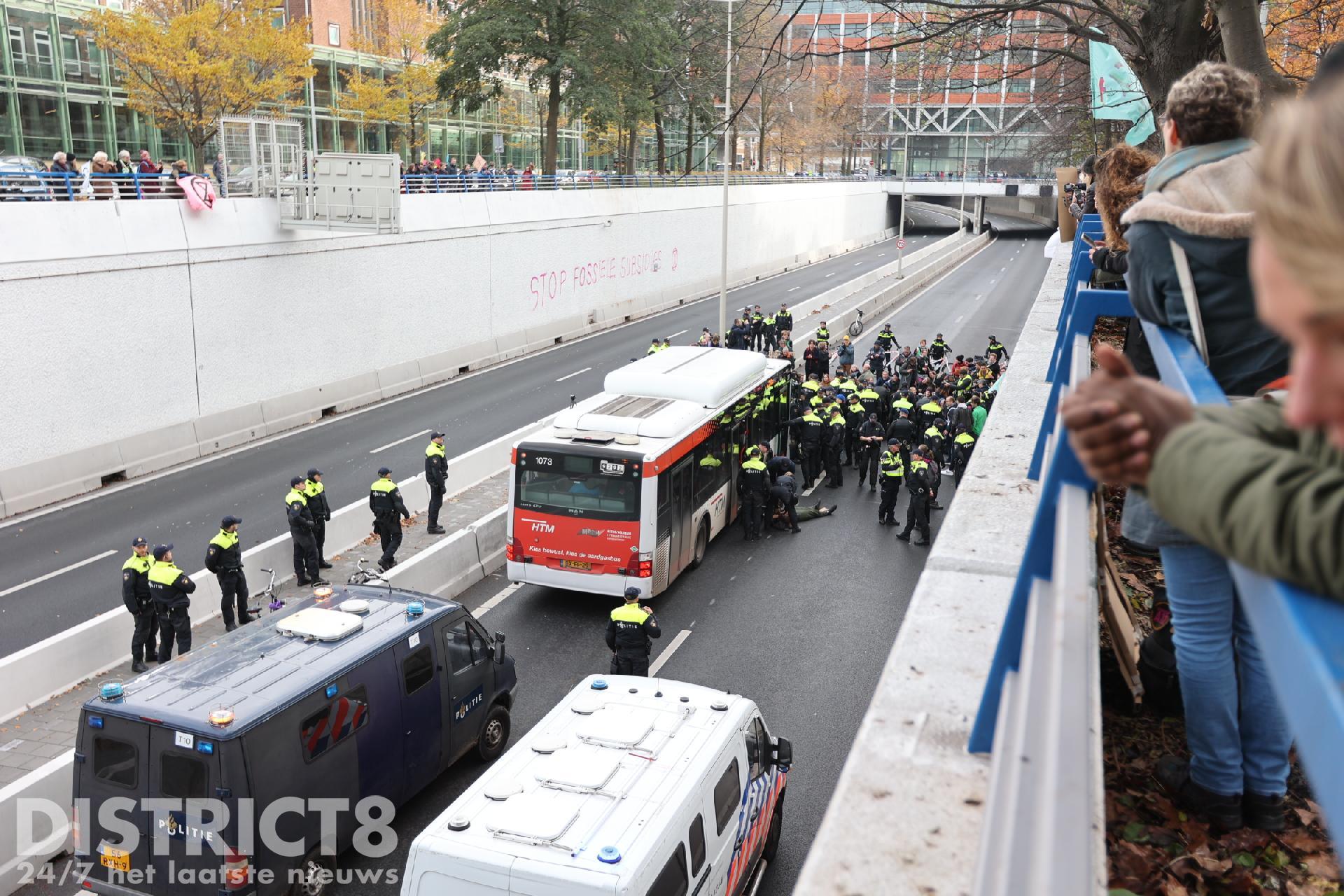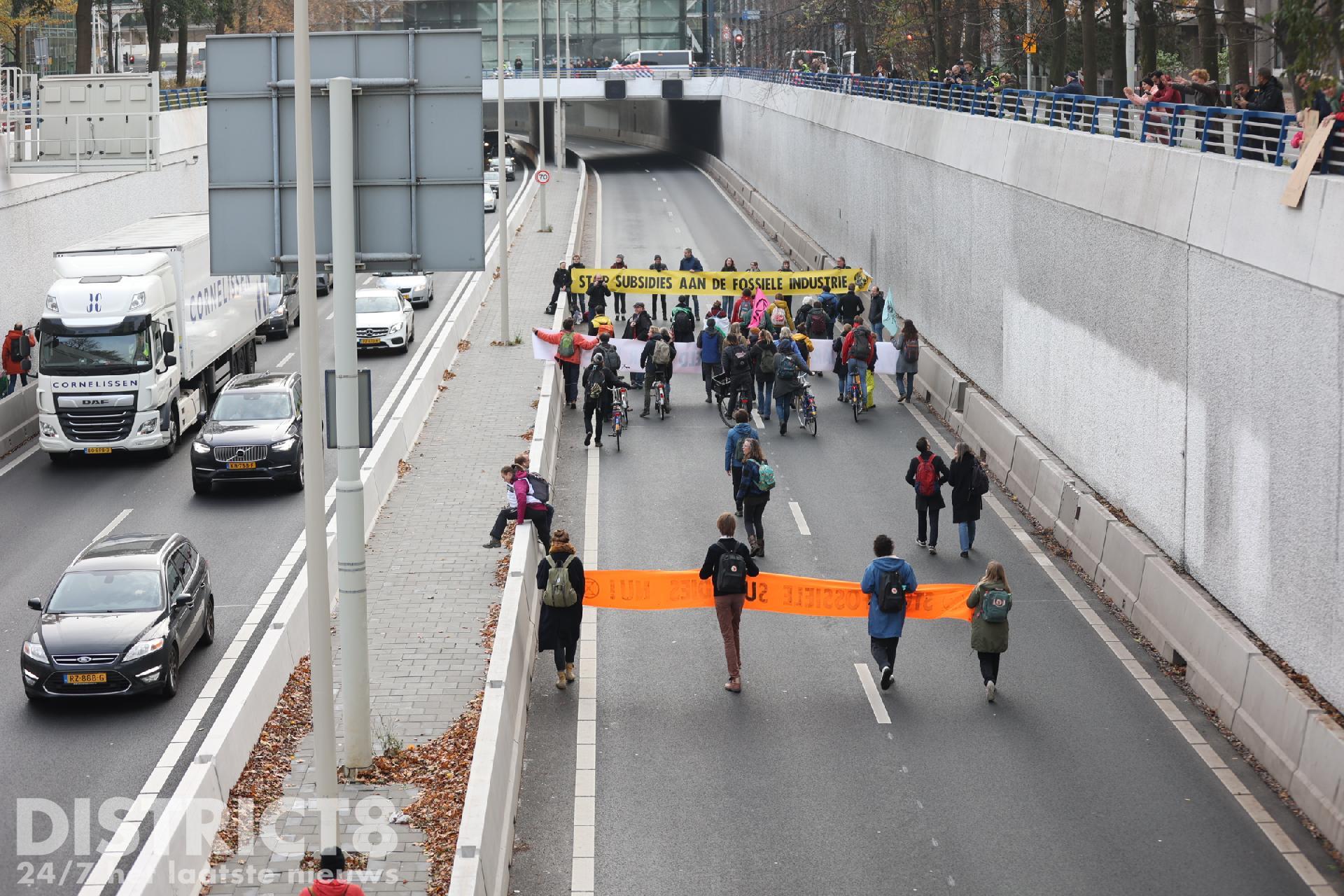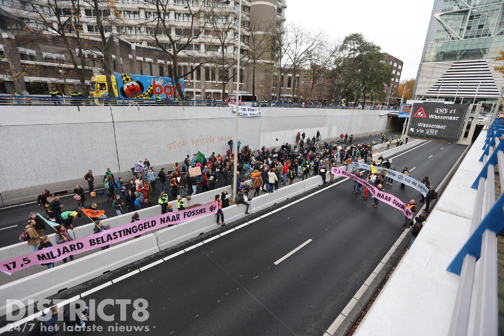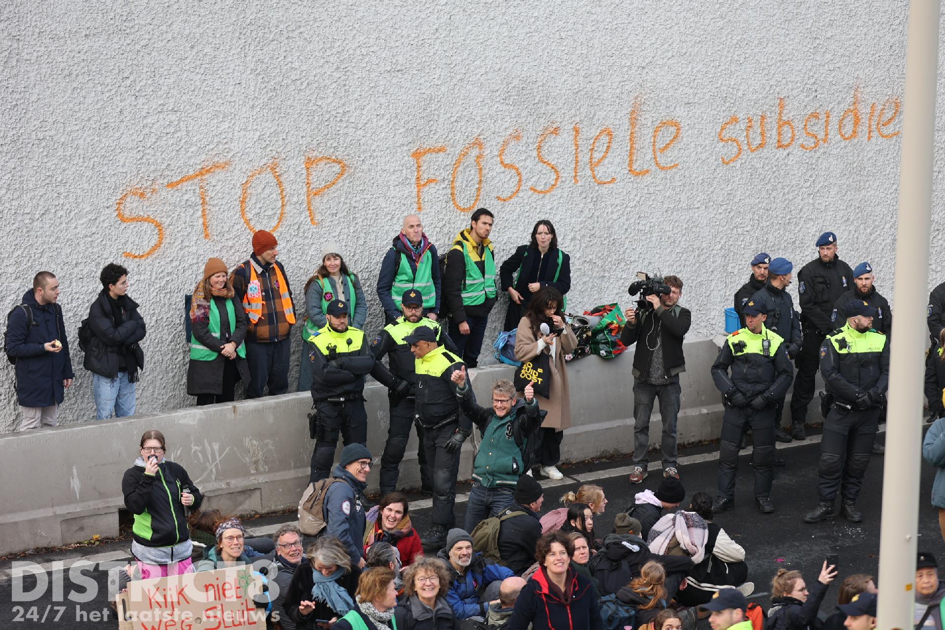 De actievoerders demonstreren tegen subsidies voor de fossiele industrie. De politie heeft op gegeven moment de actievoerders medegedeeld dat zij moesten vertrekken naar het Malieveld om daar verder te demonstreren. Een groot gedeelte van de actievoerders gaf hier geen gehoor aan, deze zijn hierna door de politie aangehouden. De TE (Technische Eenheid) van de politie is ter plaatse om onder andere vastgelijmde demonstranten los te krijgen, hierbij wordt gebruik gemaakt van onder andere cola.