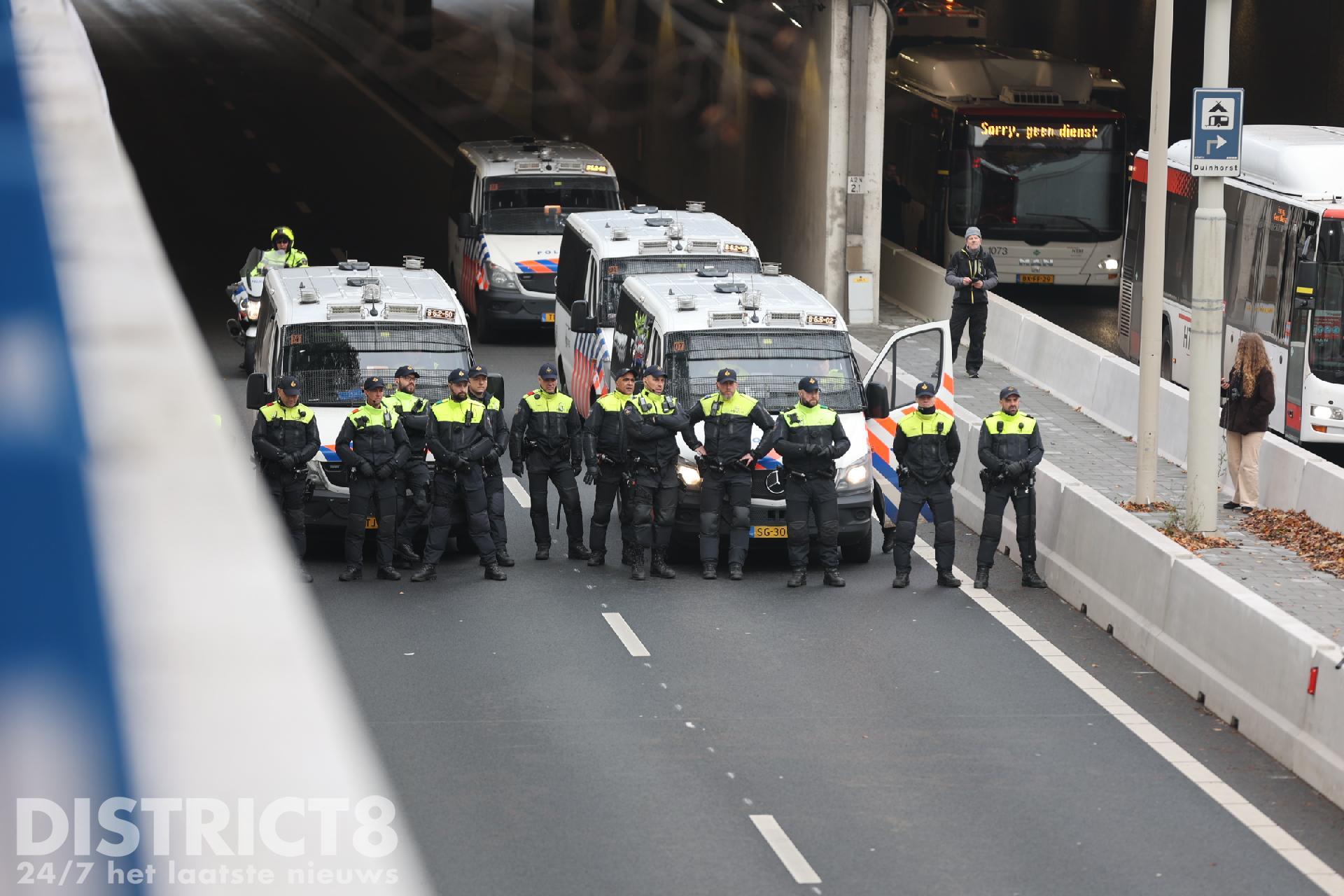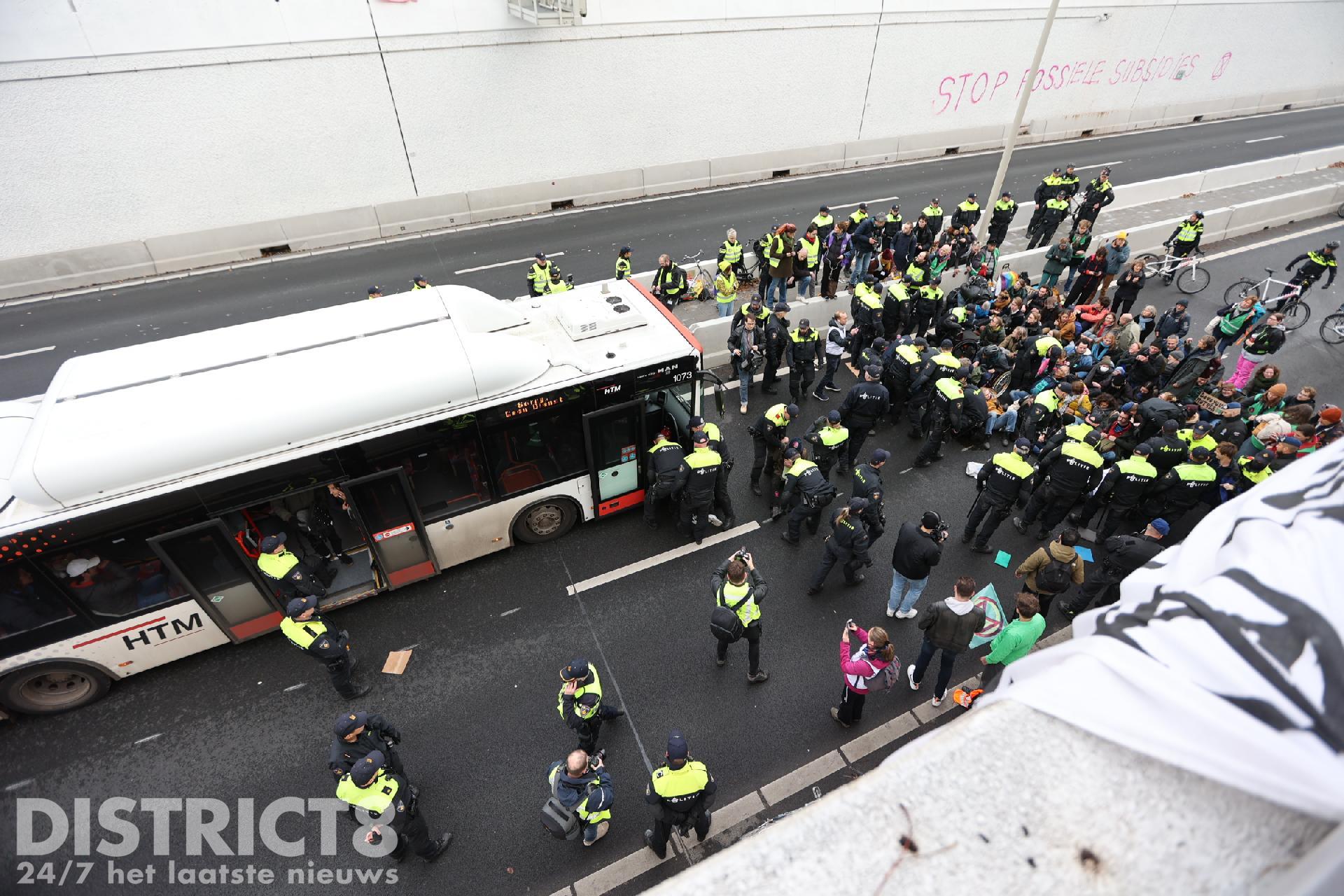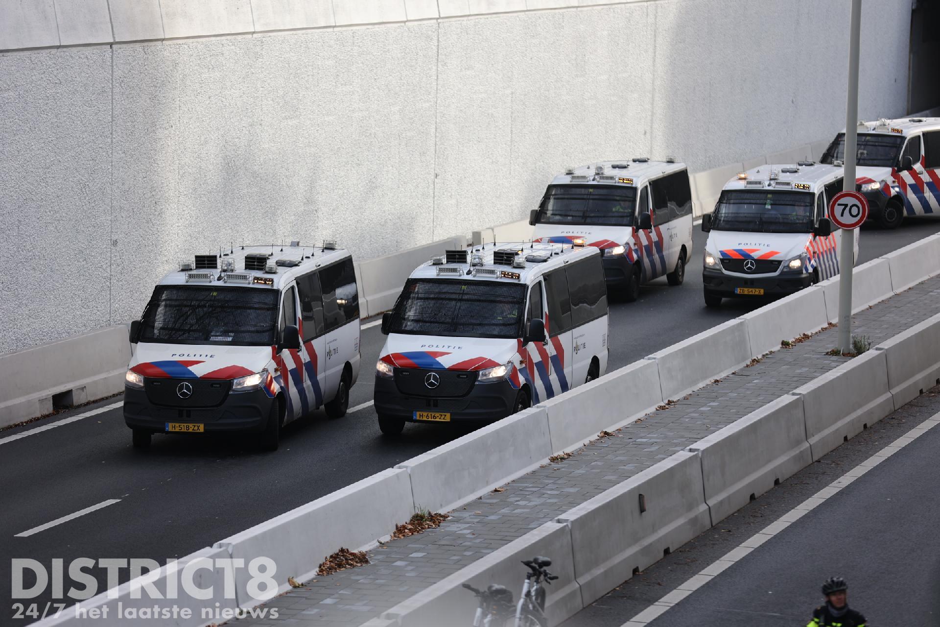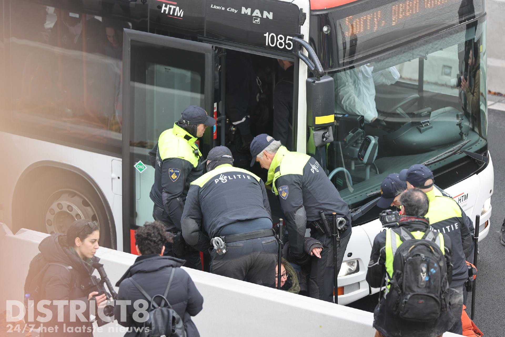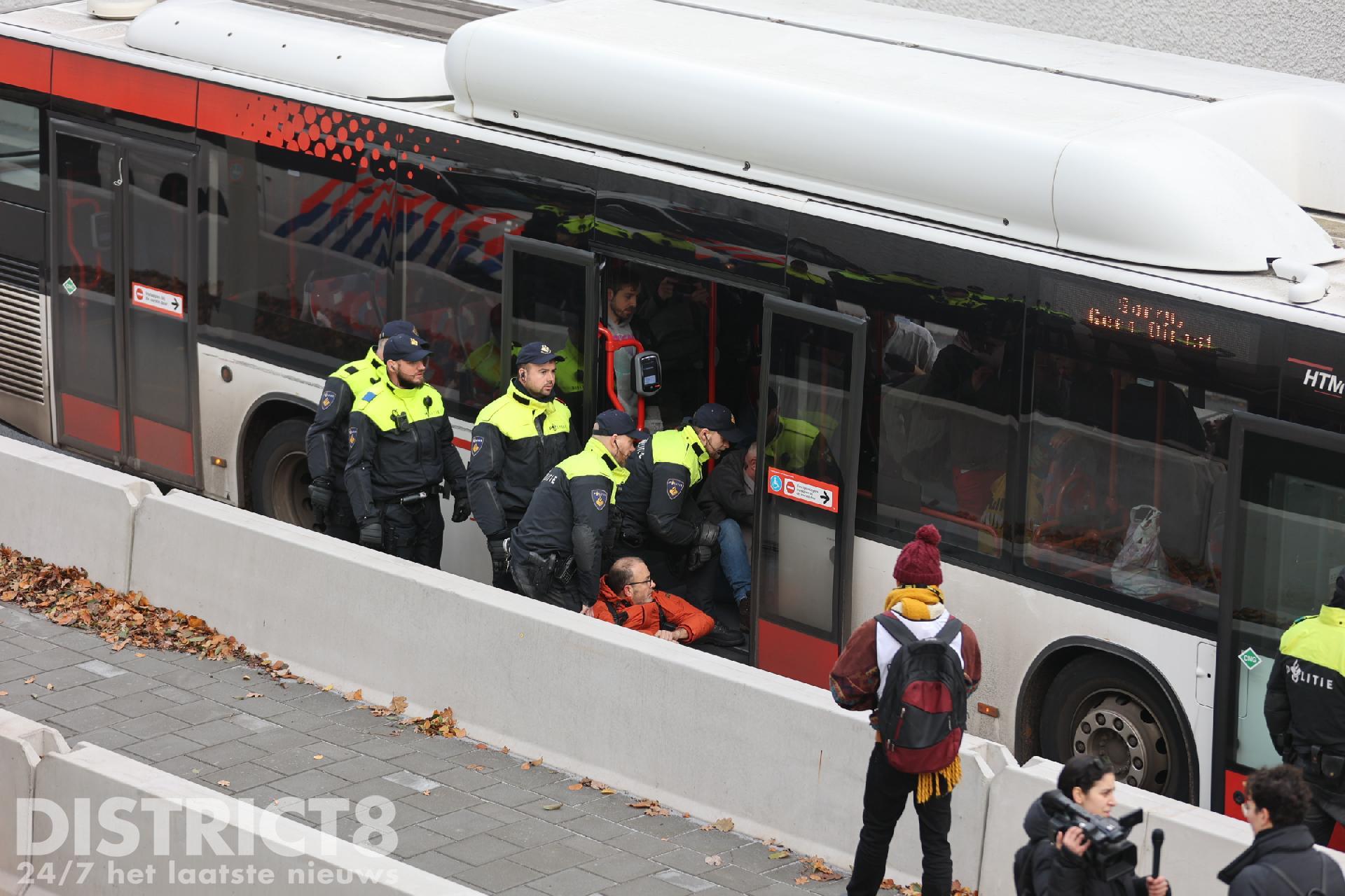 Stadsbussen van de HTM staan klaar om de aangehouden demonstranten af te voeren.
