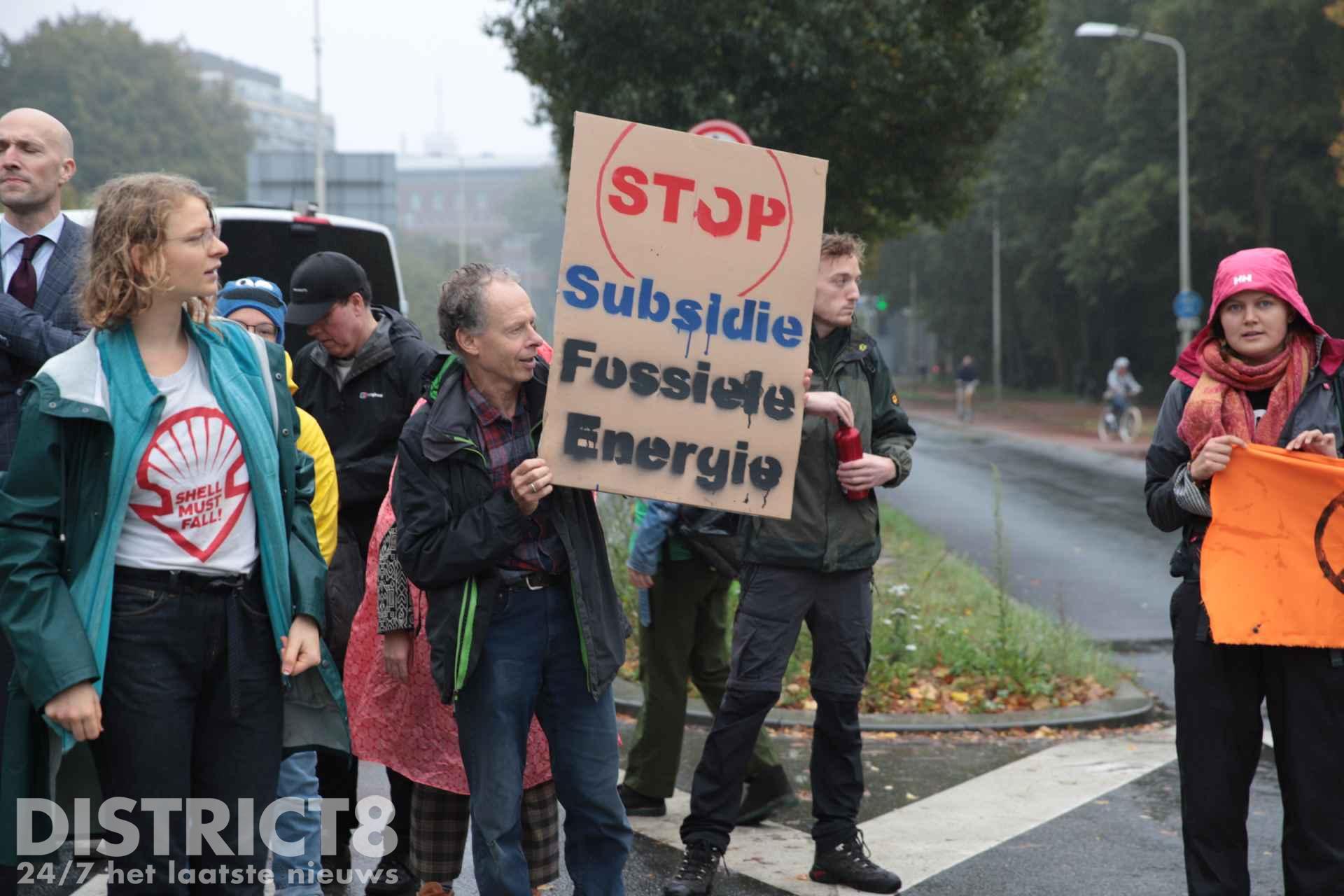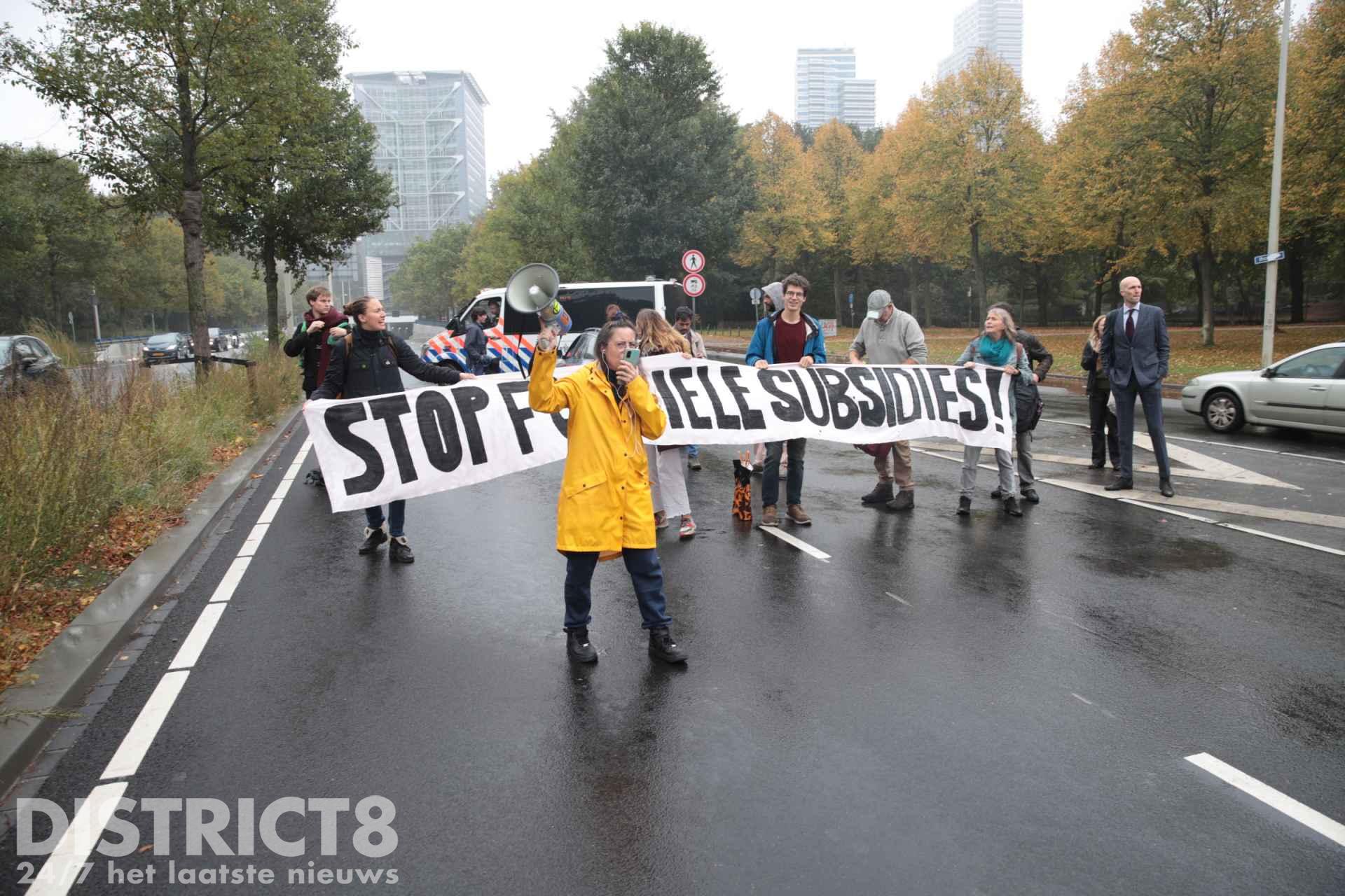 Rond 12:00 gingen de demonstranten de weg op om te demonstreren tegen het klimaatcrisis. Volgens Extinction Rebellion doneert de Nederlandse overheid per jaar €17,5 miljard euro aan de fossiele sector.