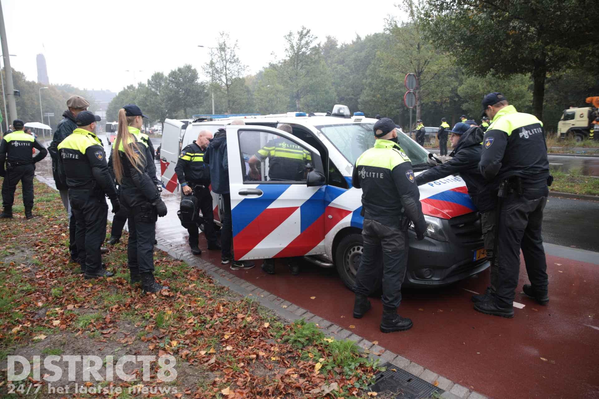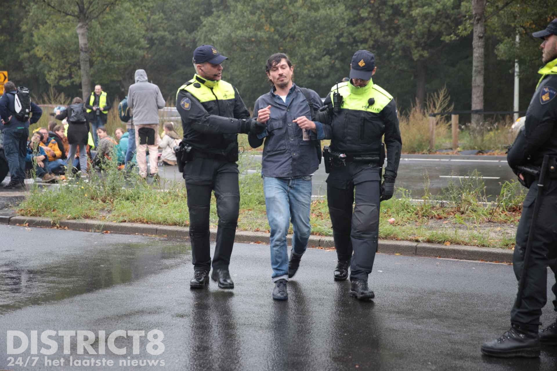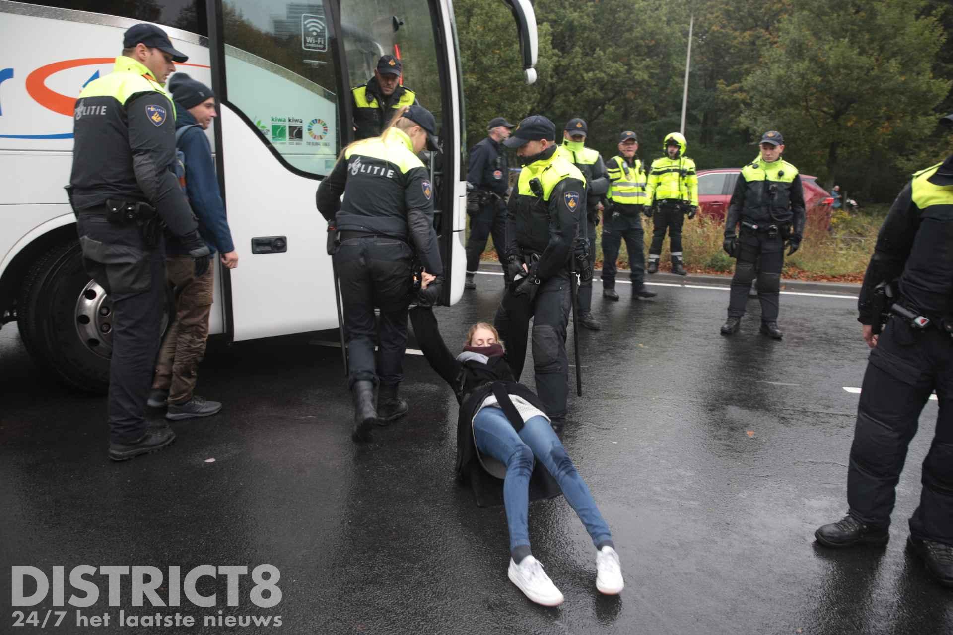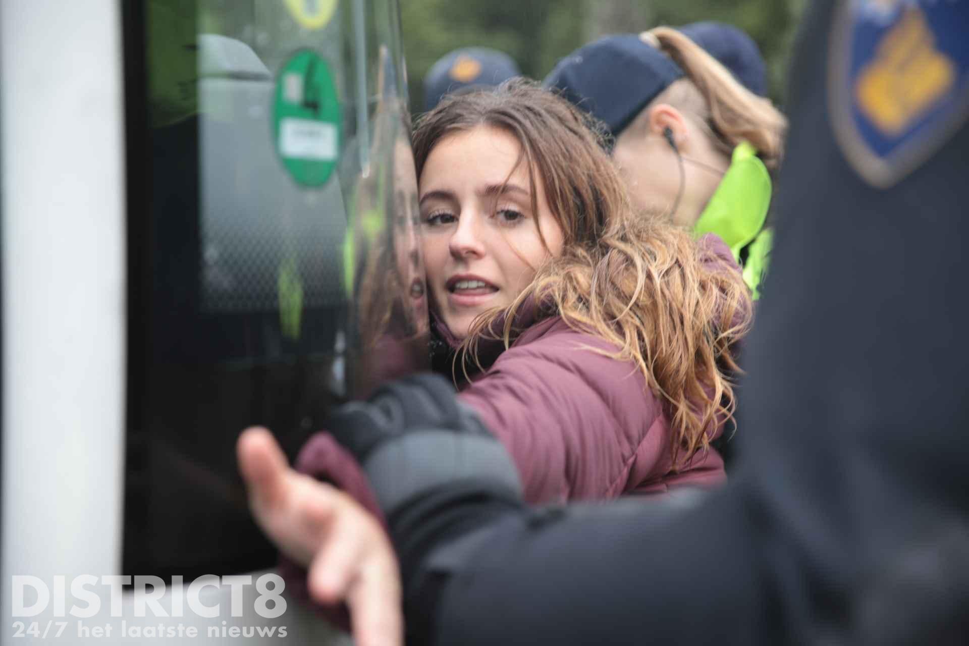 Een touringcar is ter plaatse gekomen om de demonstranten over te brengen naar het bureau. Alle demonstranten zijn inmiddels overgebracht. Enkele demonstranten waren vastgelijmd aan het wegdek. Door cola zijn ze weer vrijgekomen en alsnog overgebracht.
