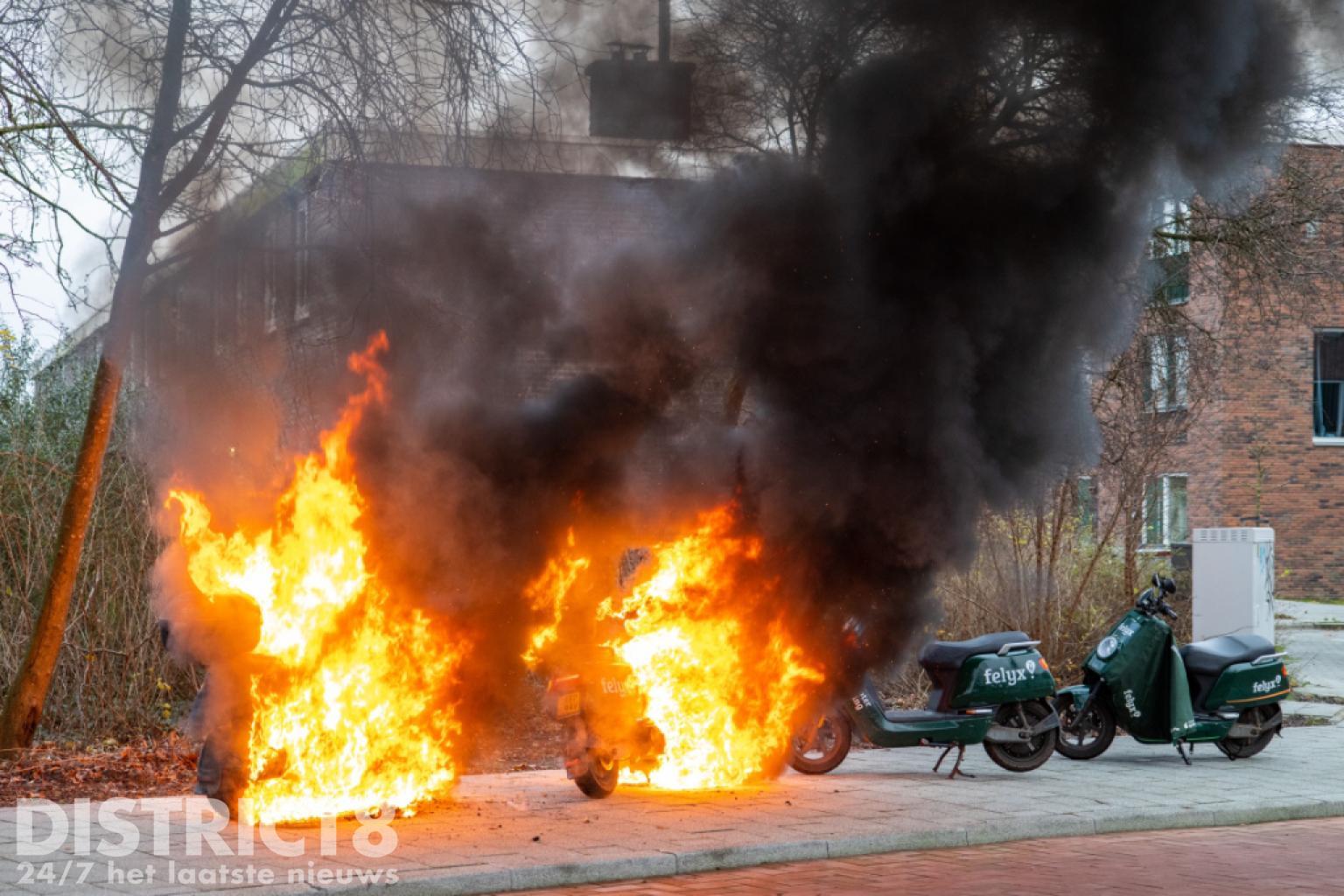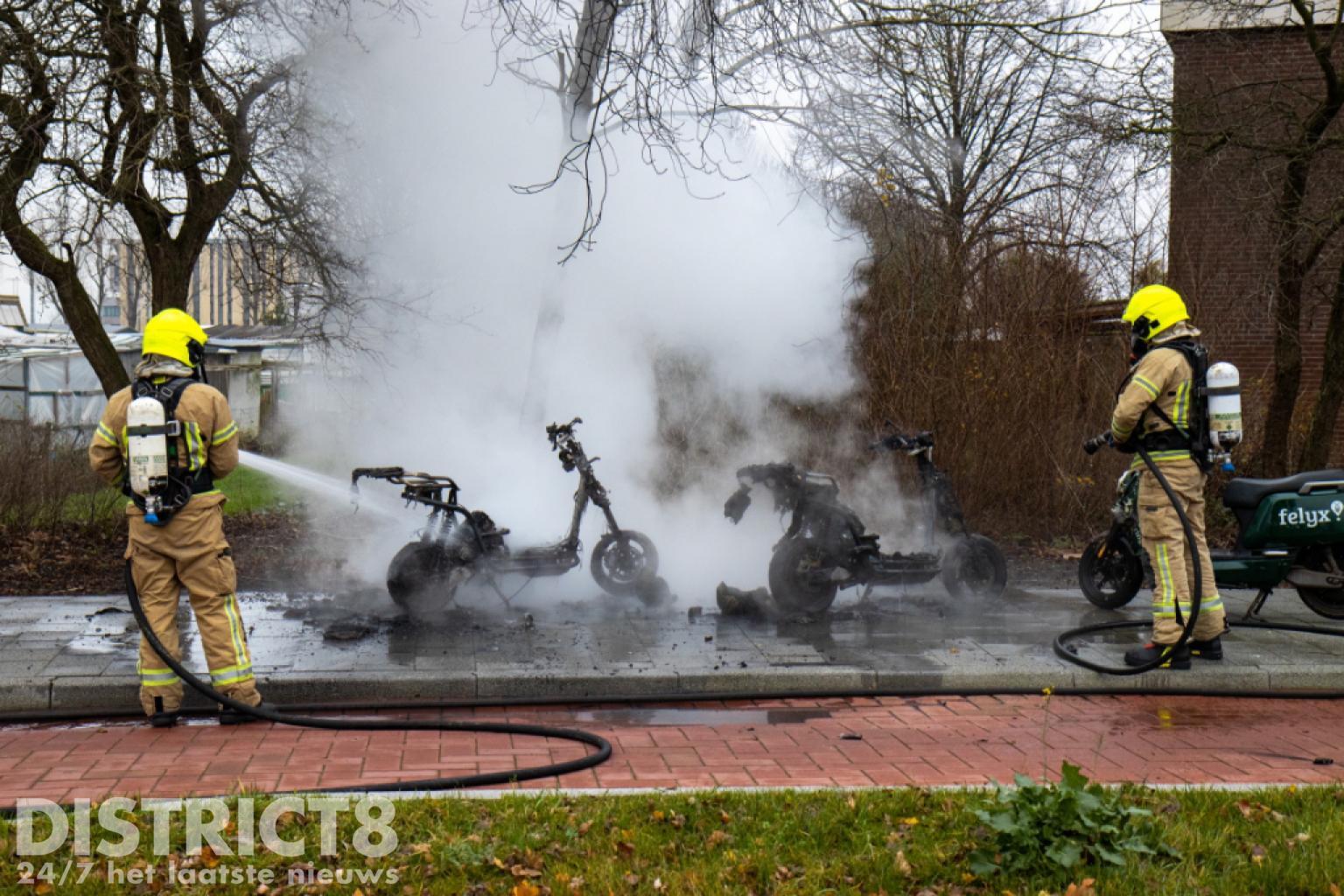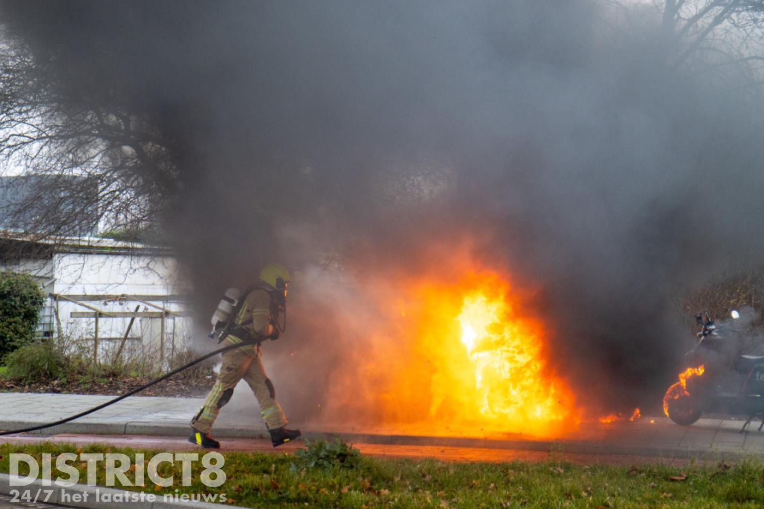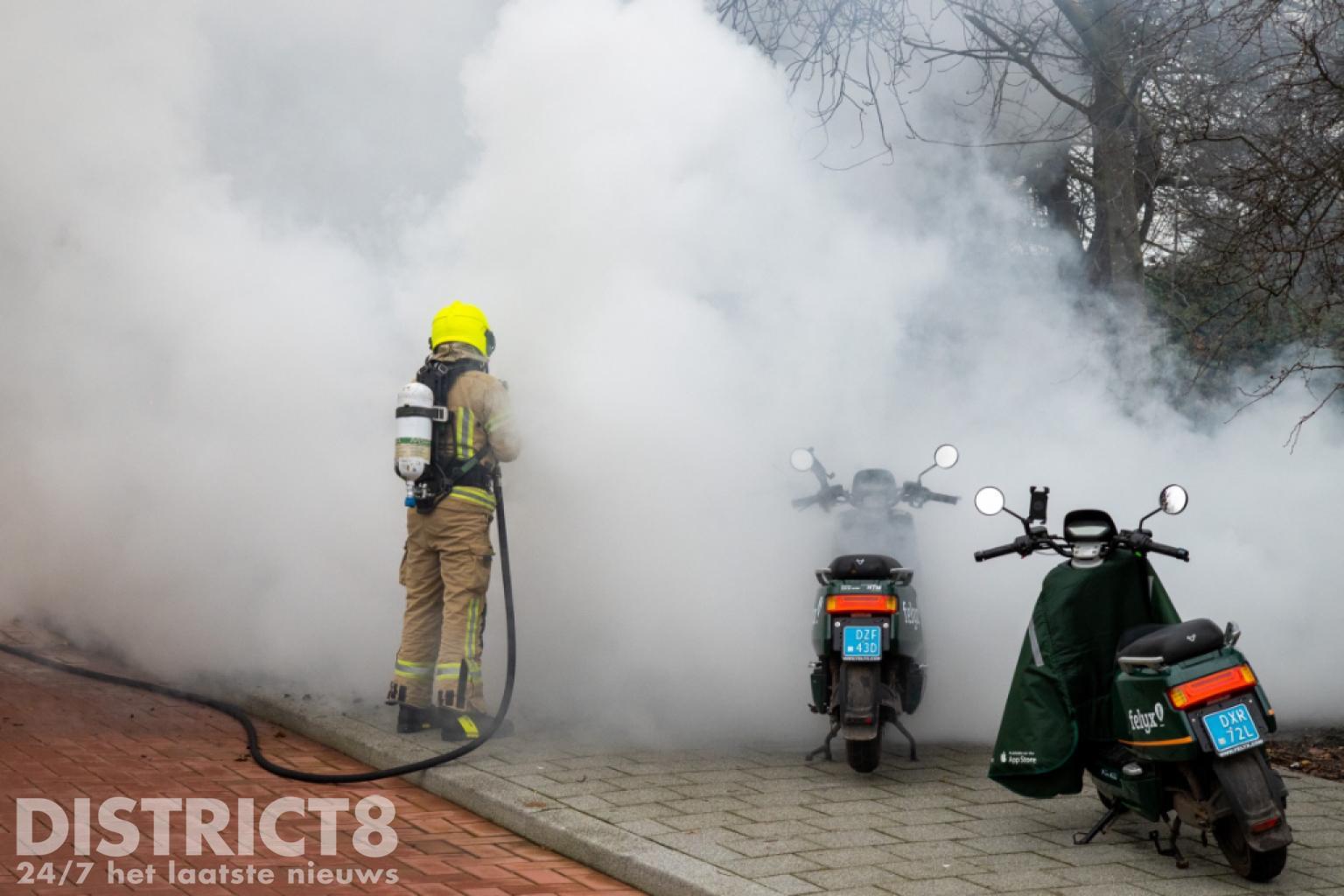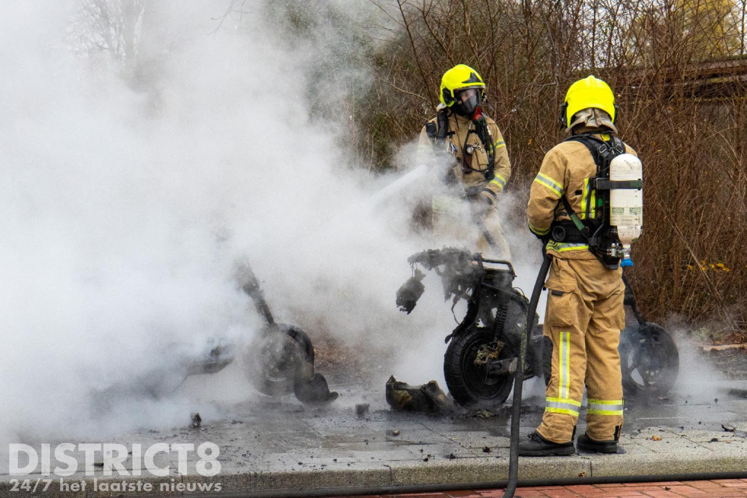 De brandweer kwam met spoed ter plaatse. Nog voor aankomst stond de scooter al volledig in brand en was het vuur overgeslagen naar een tweede scooter.