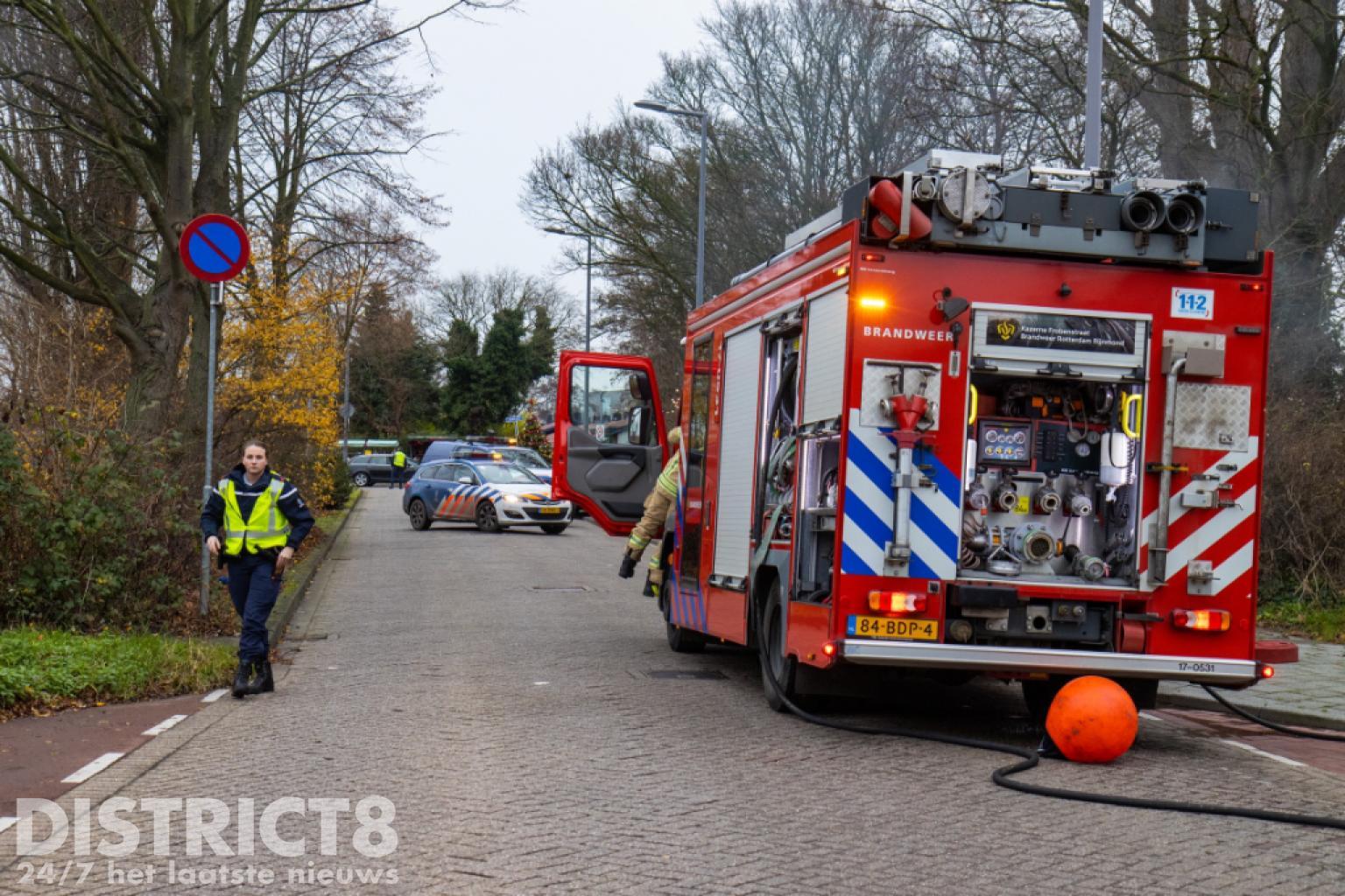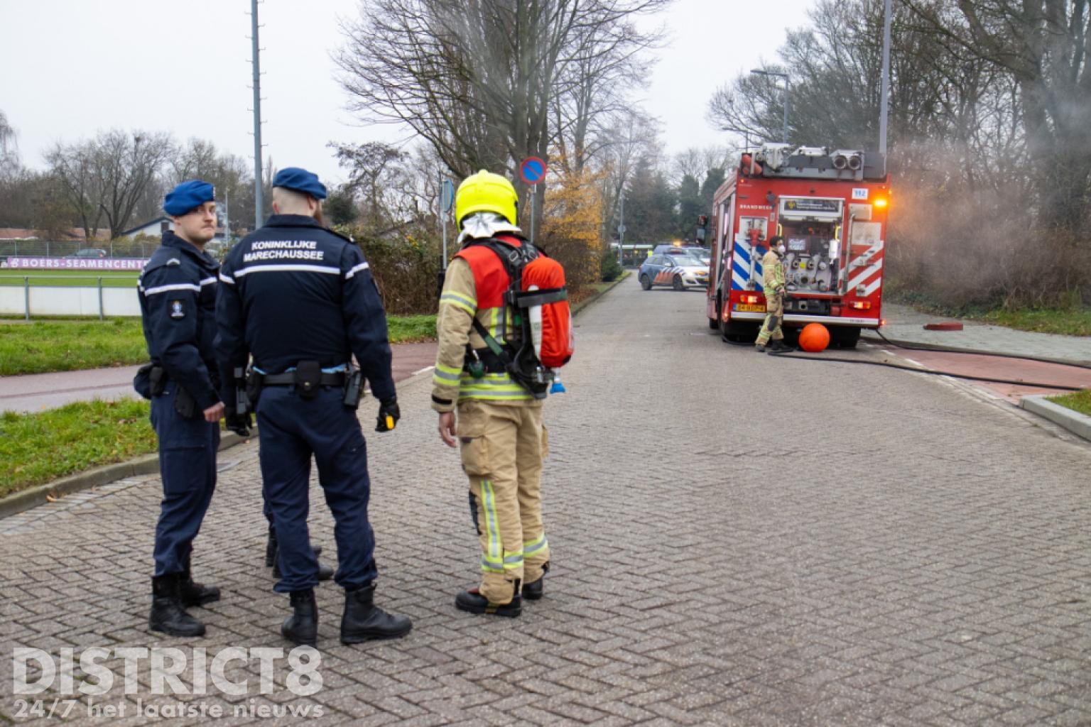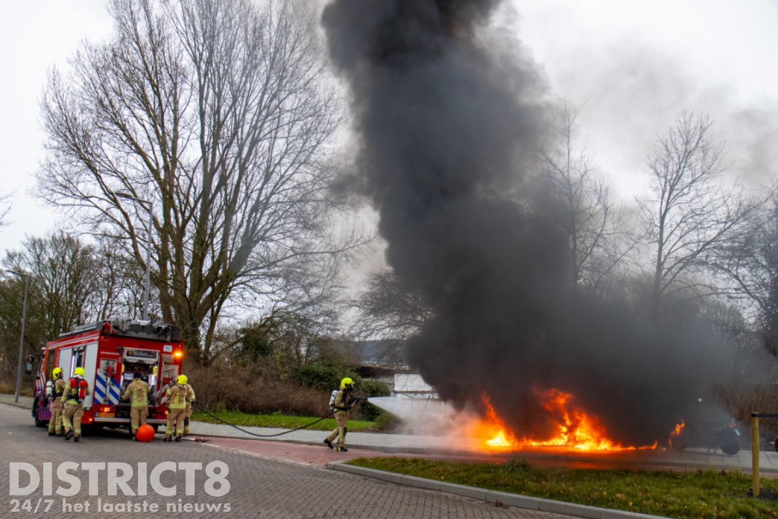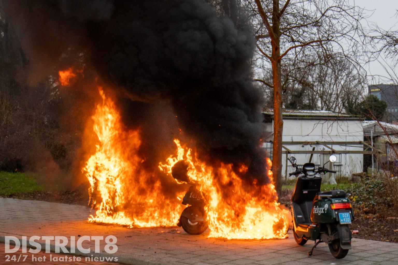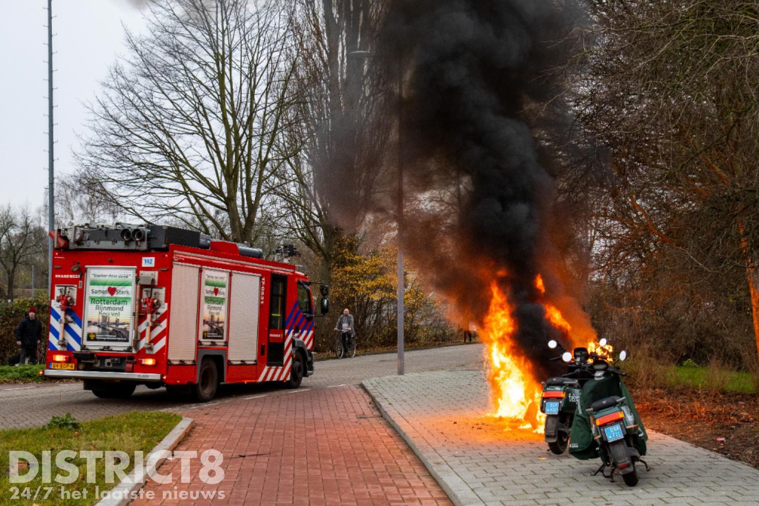 De brandweer kwam met spoed ter plaatse. Nog voor aankomst stond de scooter al volledig in brand en was het vuur overgeslagen naar een tweede scooter.