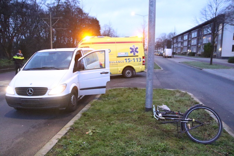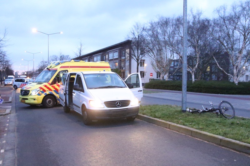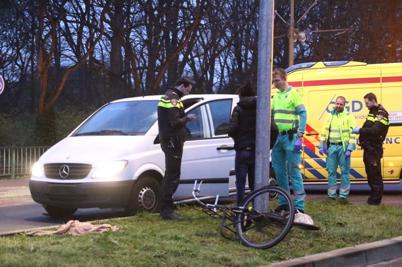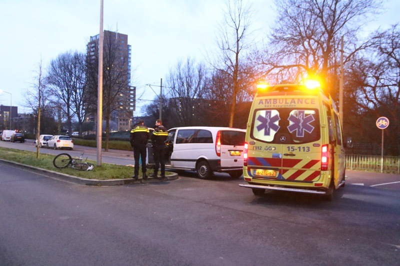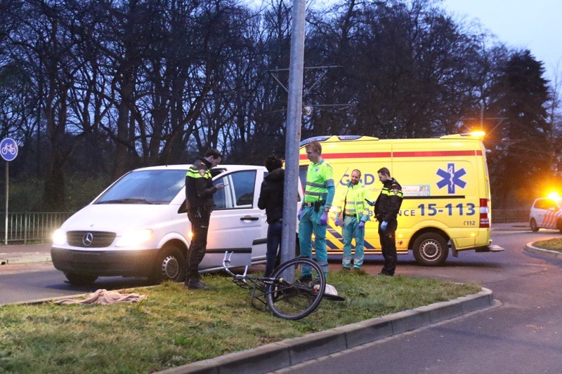 De fietser wilde de Melis Stokelaan overstreken toen hij werd geschept door een busje. De fietser kwam hierbij hard tegen de voorruit terecht.