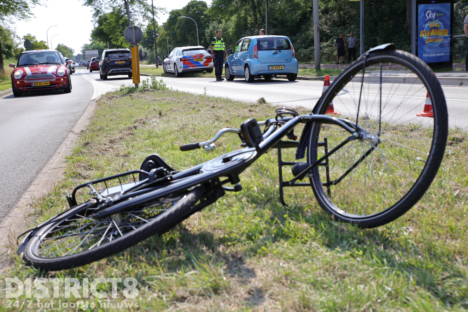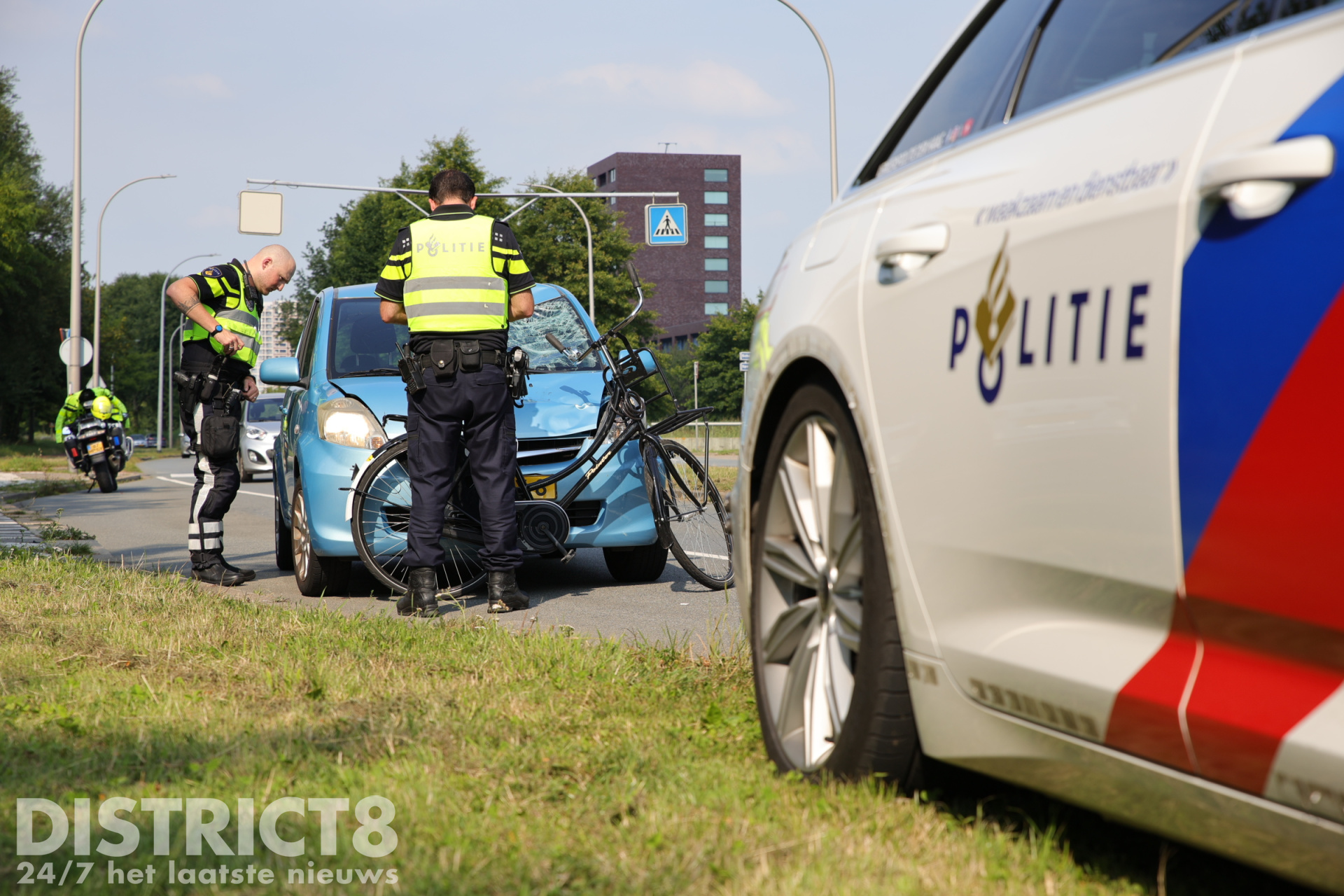 Uiteindelijk hoefde alleen de fietsster naar het ziekenhuis vervoerd te worden. Een berger heeft de zwaar beschadigde auto meegenomen.