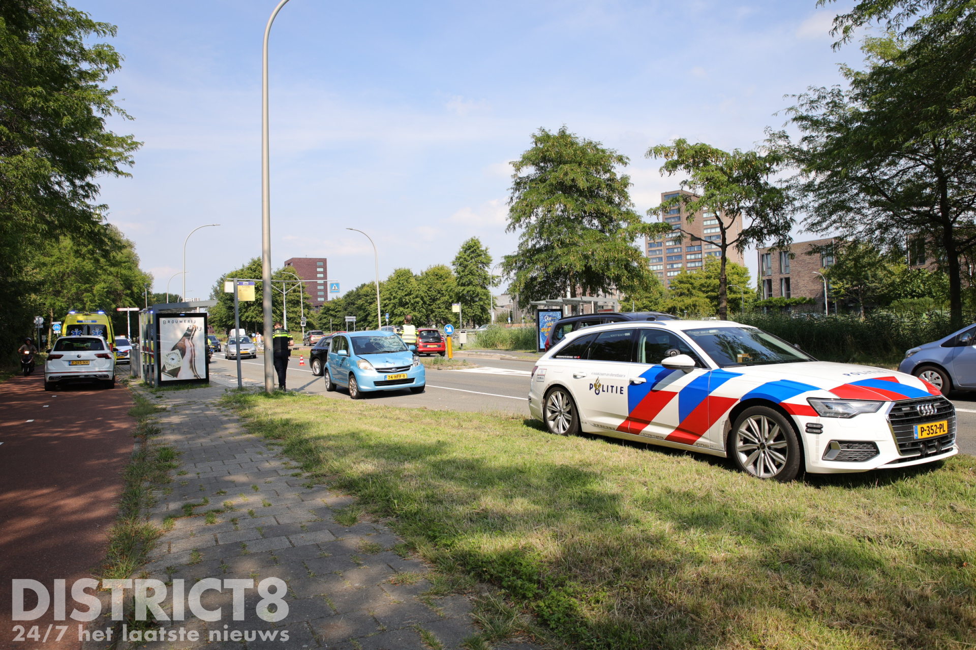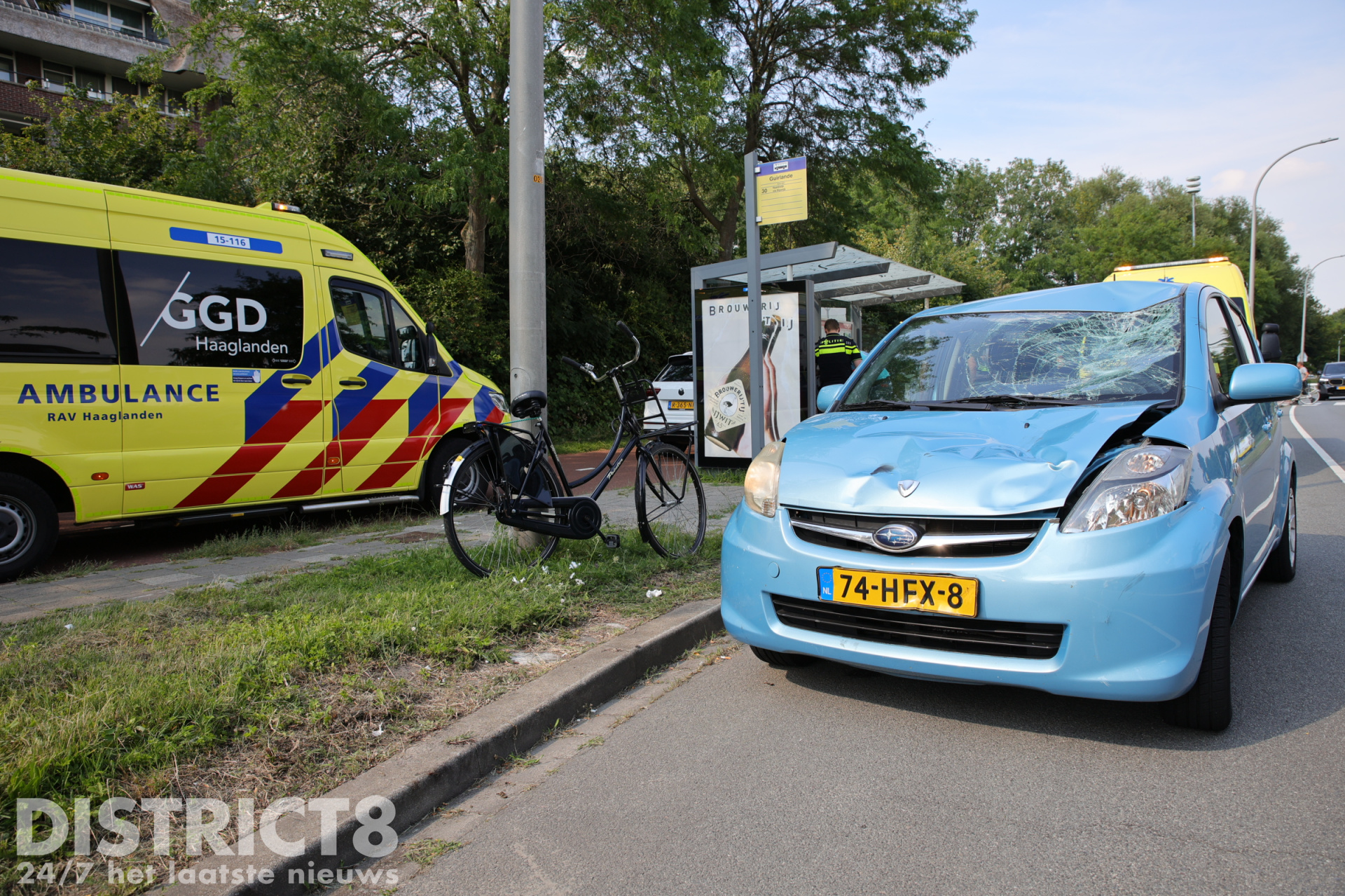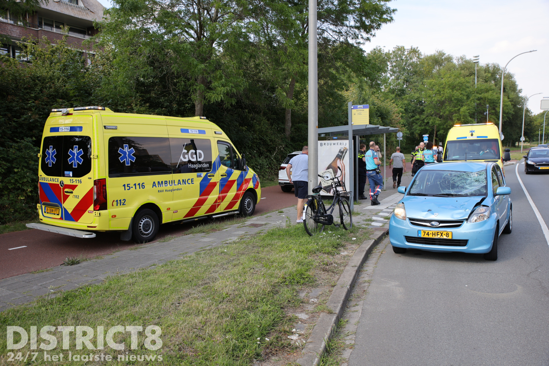Het ambulancepersoneel ontfermt zich momenteel over het slachtoffer terwijl de politie aanwezig is om onderzoek te doen. De auto en de fiets hebben forse schade opgelopen door de klap. Een tweede ambulance is ter plaatse gekomen om de bestuurster van de auto te controleren.