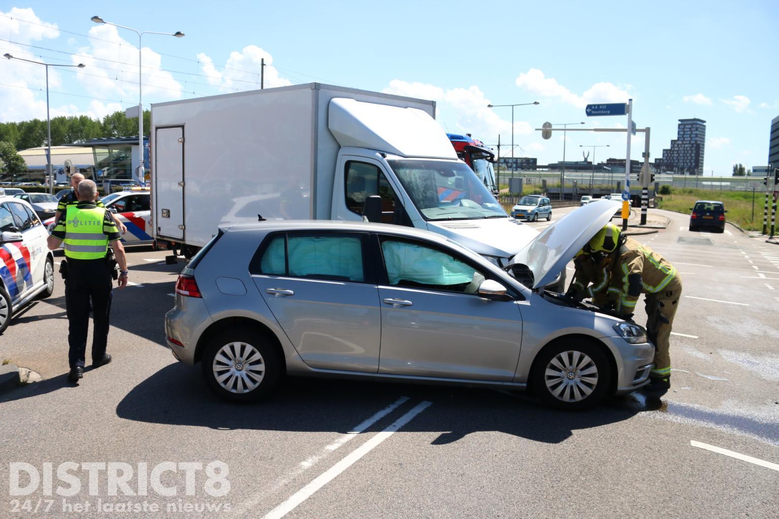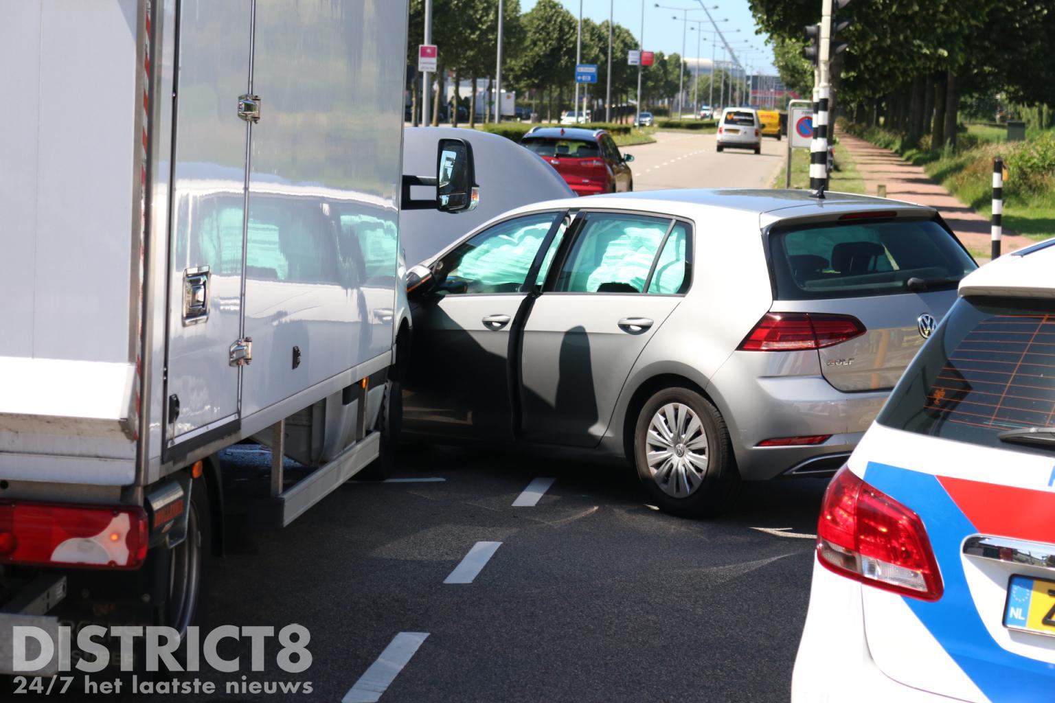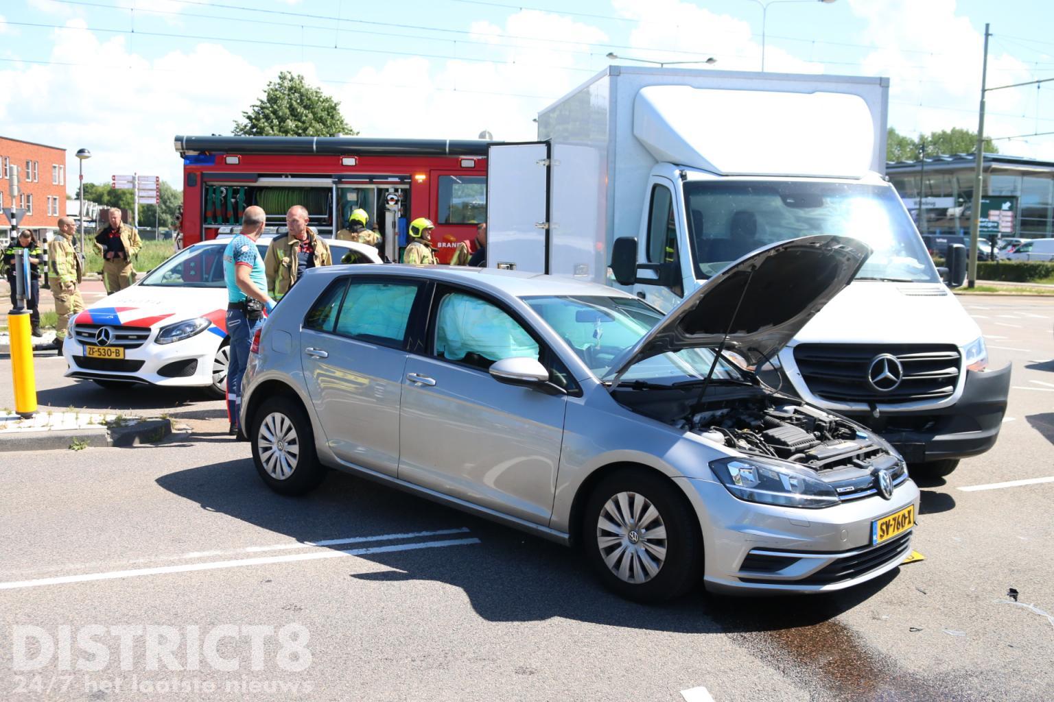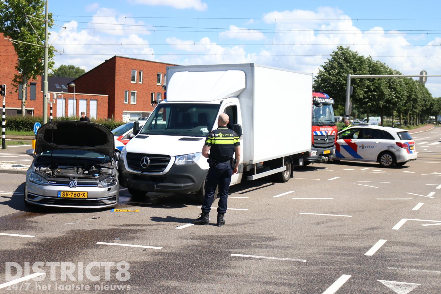 Een auto kwam op de kruising in botsing met een bakwagen. Beide voertuigen liepen flinke schade op. Wonderbaarlijk raakte niemand ernstig gewond. Een vrouw en kind moesten in de ambulance nagekeken worden.
