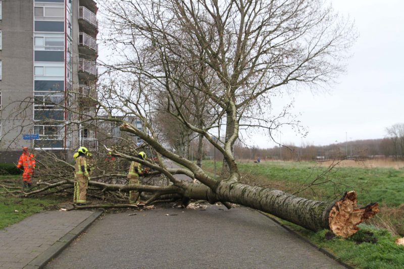 Delft – Aan de Willem Dreeslaan in Delft heeft de harde wind zondagochtend schade aangericht. Een flinke boom waaide om en blokkeerde hierdoor de weg.
