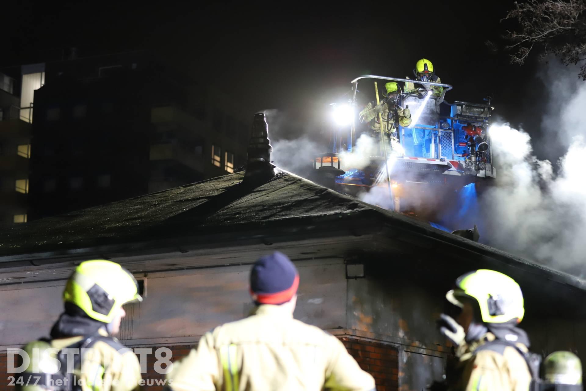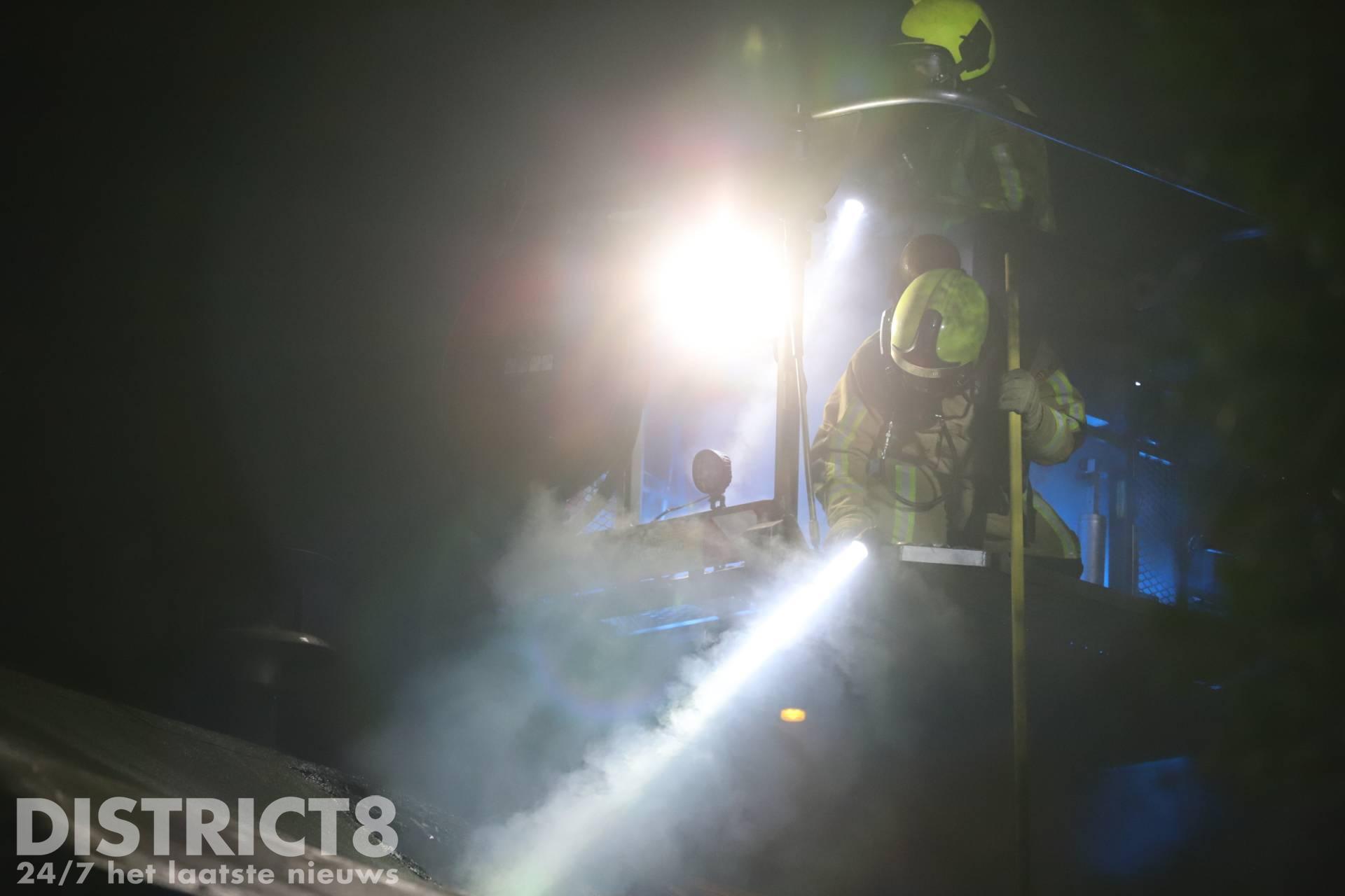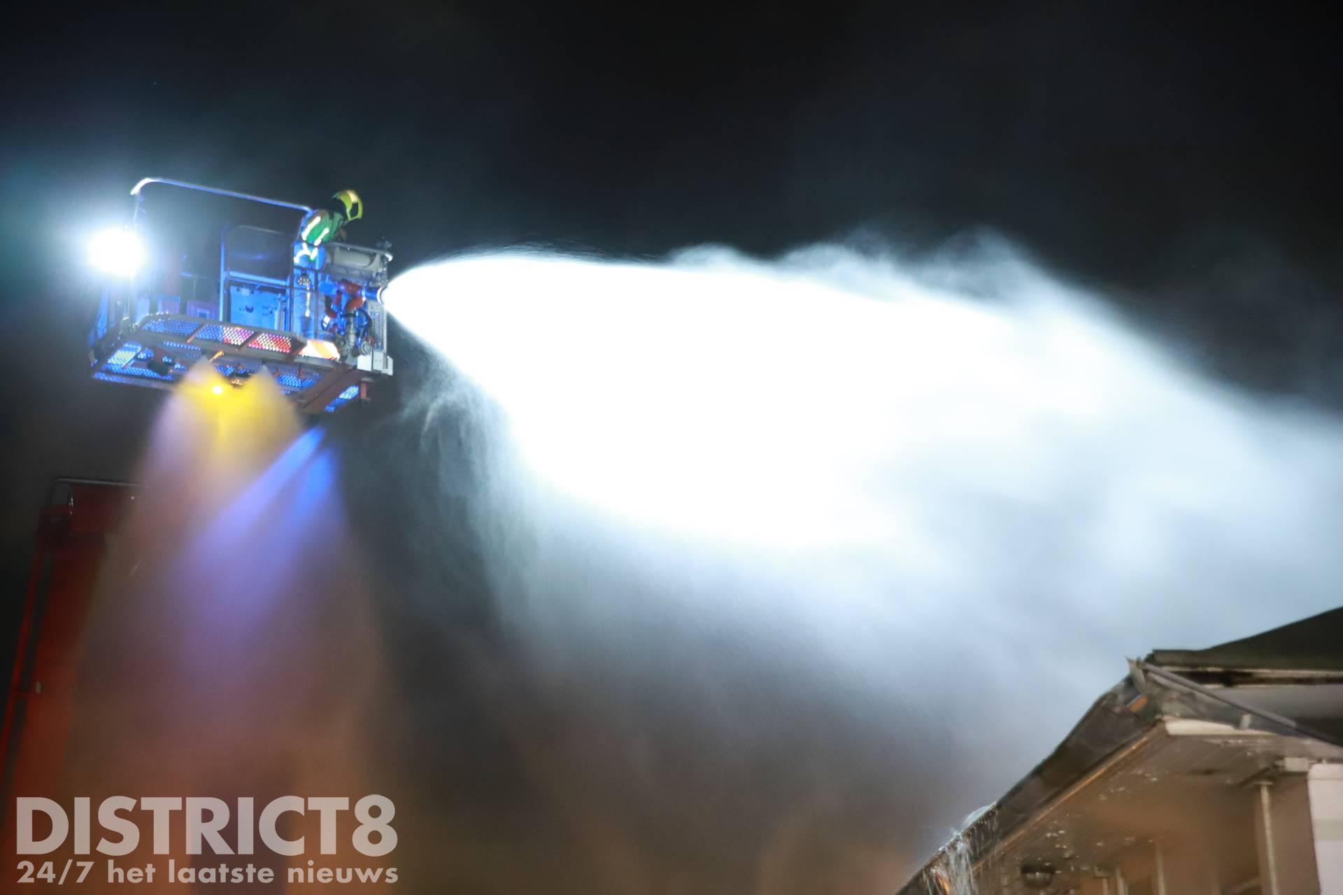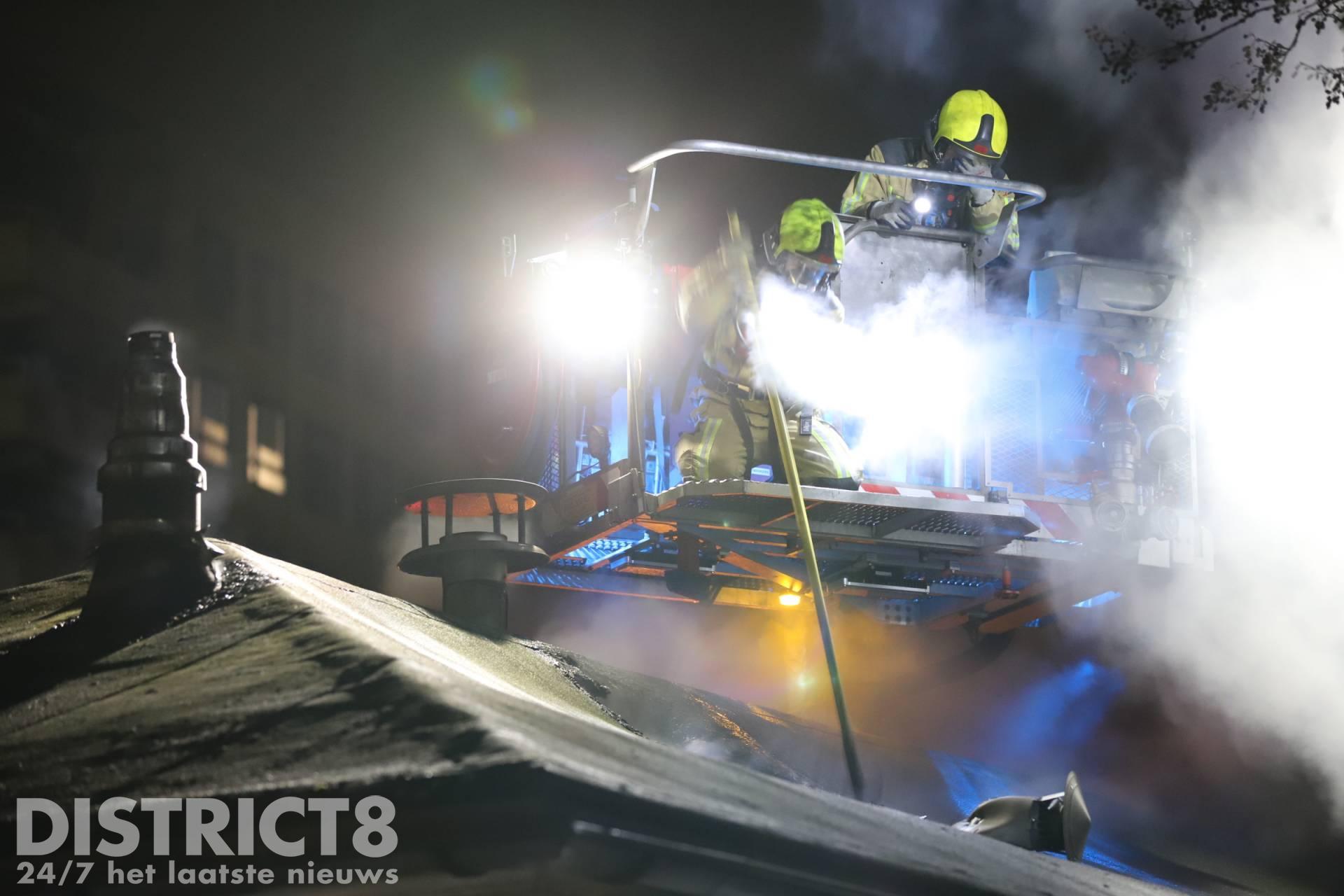Om het vuur te bestrijden is een hoogwerker ingezet dat van bovenaf blust.