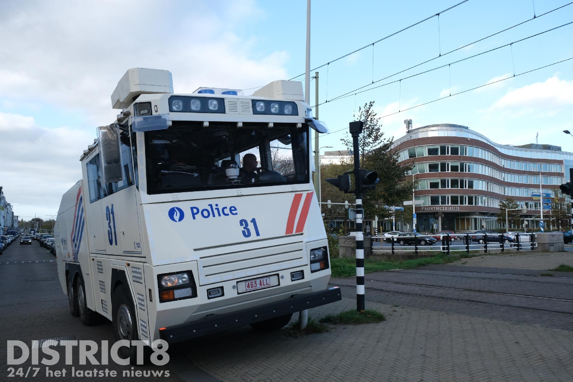 De Belgische politie is met een waterwerper ter plekke. De zes waterwerpers van de Nederlandse politie staan momenteel in onderhoud.
