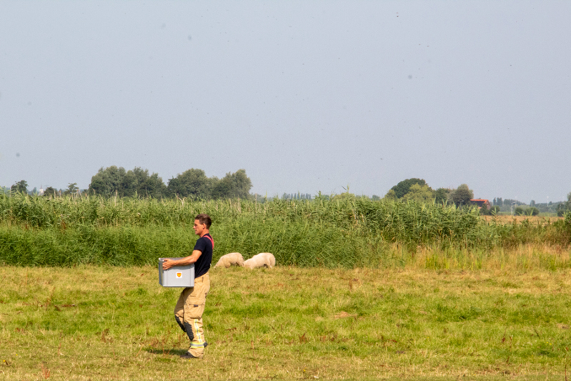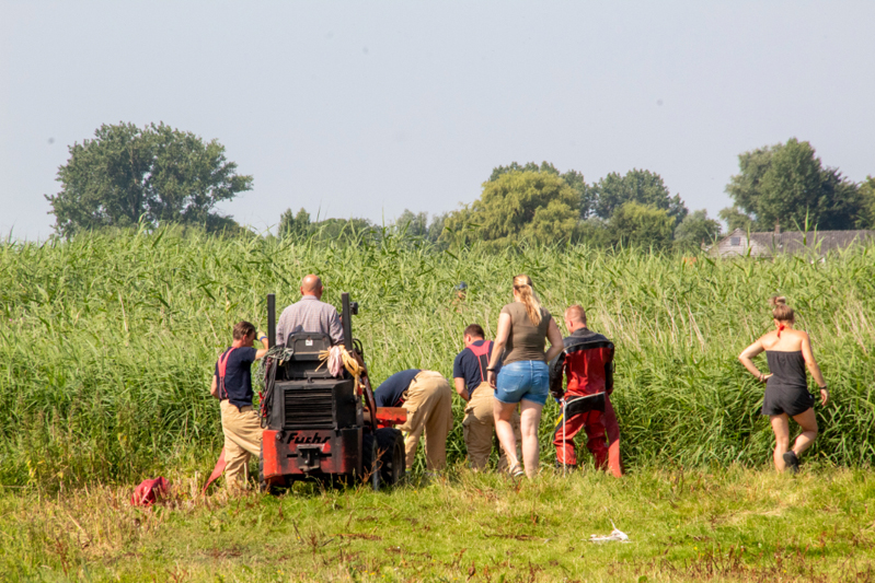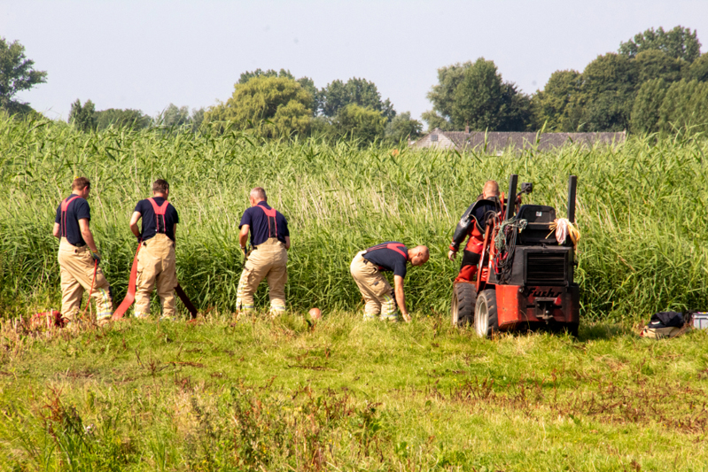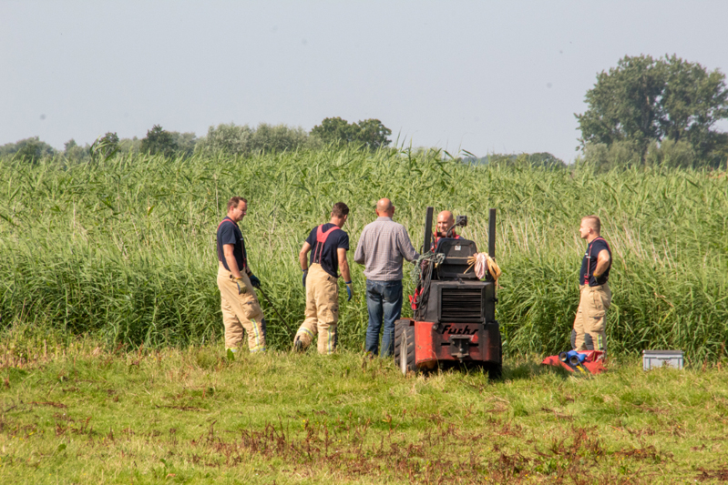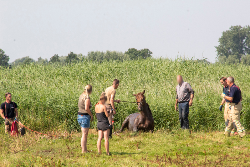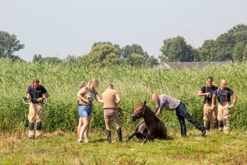 Achterin een weiland lag een paard in de sloot. Deze keer was het een pittige klus om het paard op het droge te krijgen; bijna een uur is men hiermee bezig geweest. Met hulp van mens en machine is het uiteindelijk gelukt. Het paard was behoorlijk vermoeid.