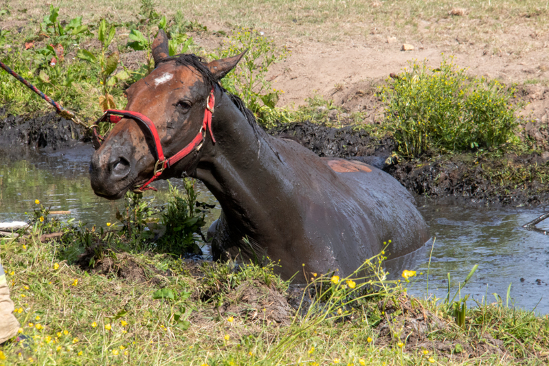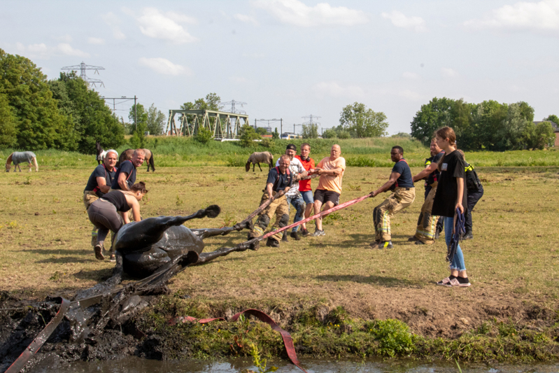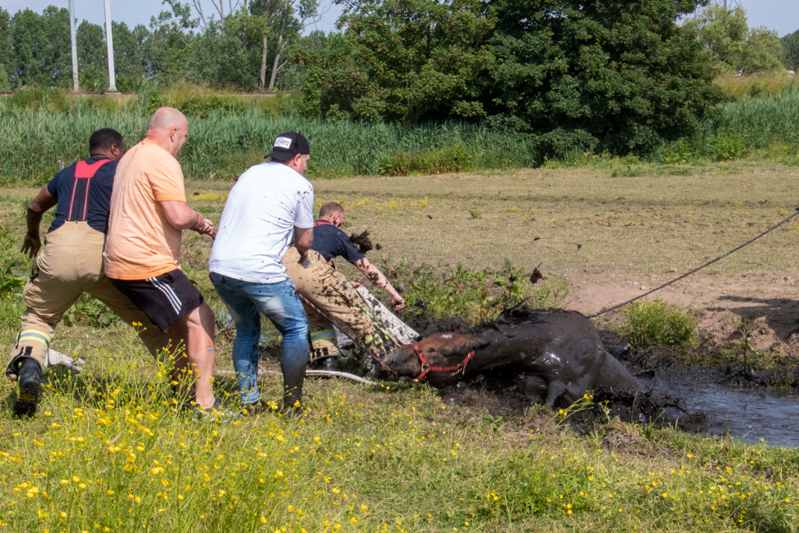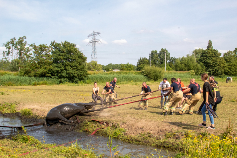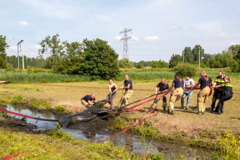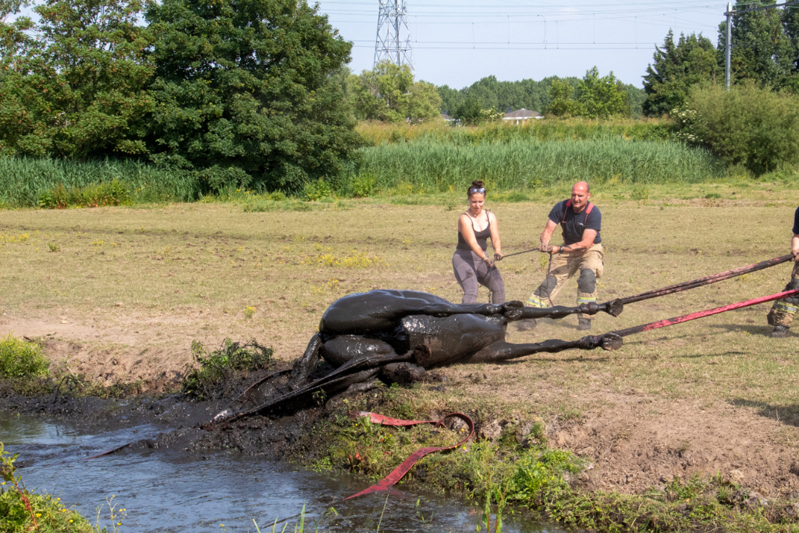 Het paard zat behoorlijk vast in de modder. Met man en macht is men ongeveer een half uur bezig geweest met de redding van het paard.