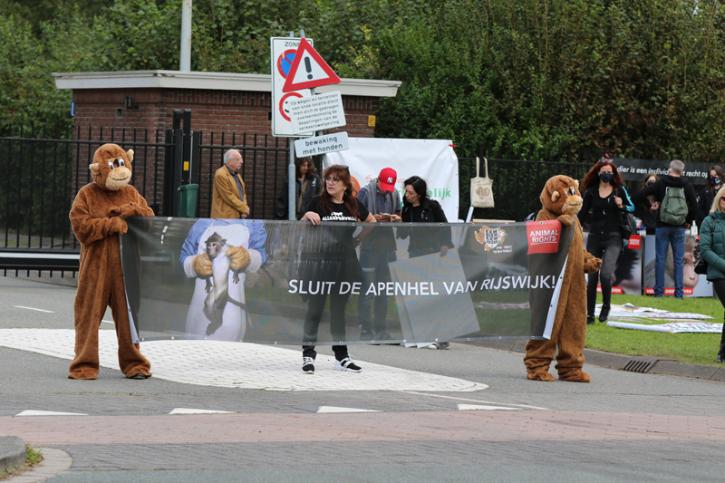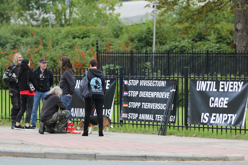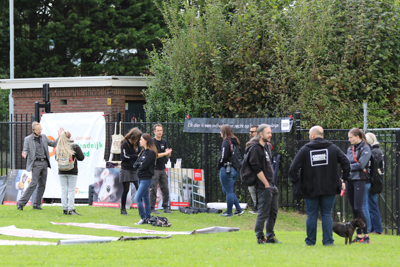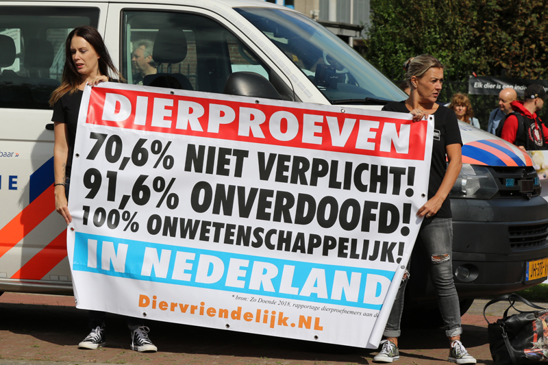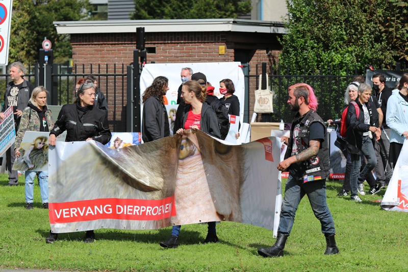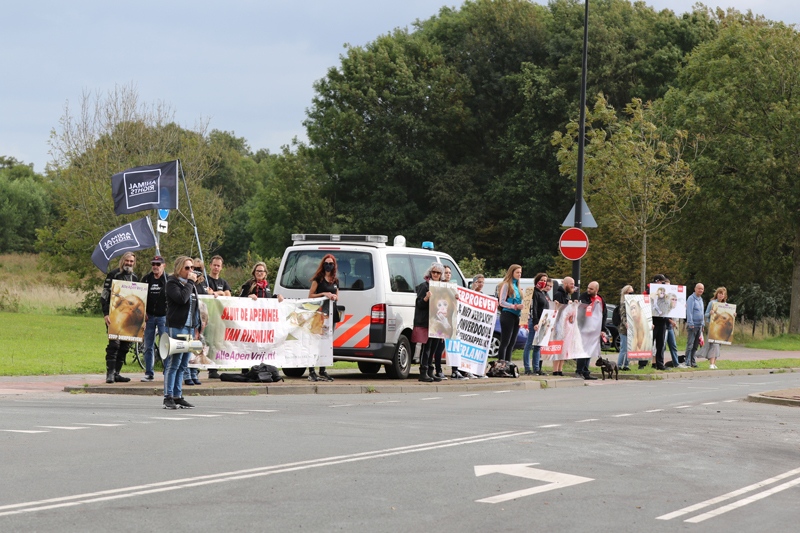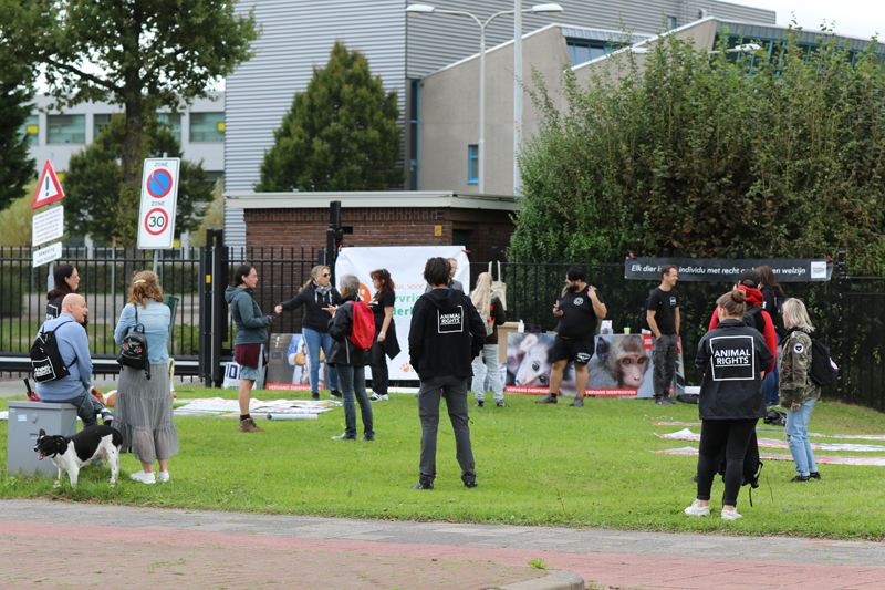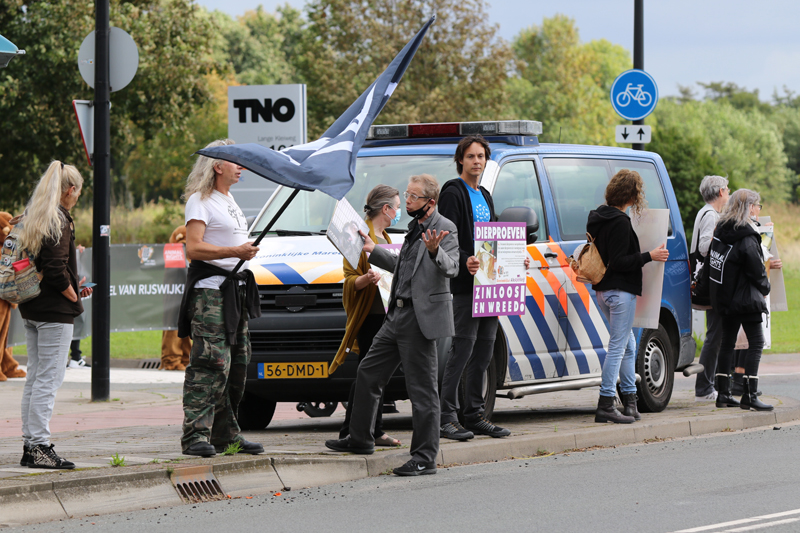 Ongeveer 50 personen zijn op de oproep af gekomen en hebben zich bij de ingang verzameld met spandoeken. Enkele demonstranten hebben zich als dier verkleed. De demonstranten dienen onderling afstand te houden en hebben zich hierom verdeeld over de Lange Kleiweg. Enkele demonstranten staan direct voor de ingang van TNO, de overigen aan de overkant van de weg.