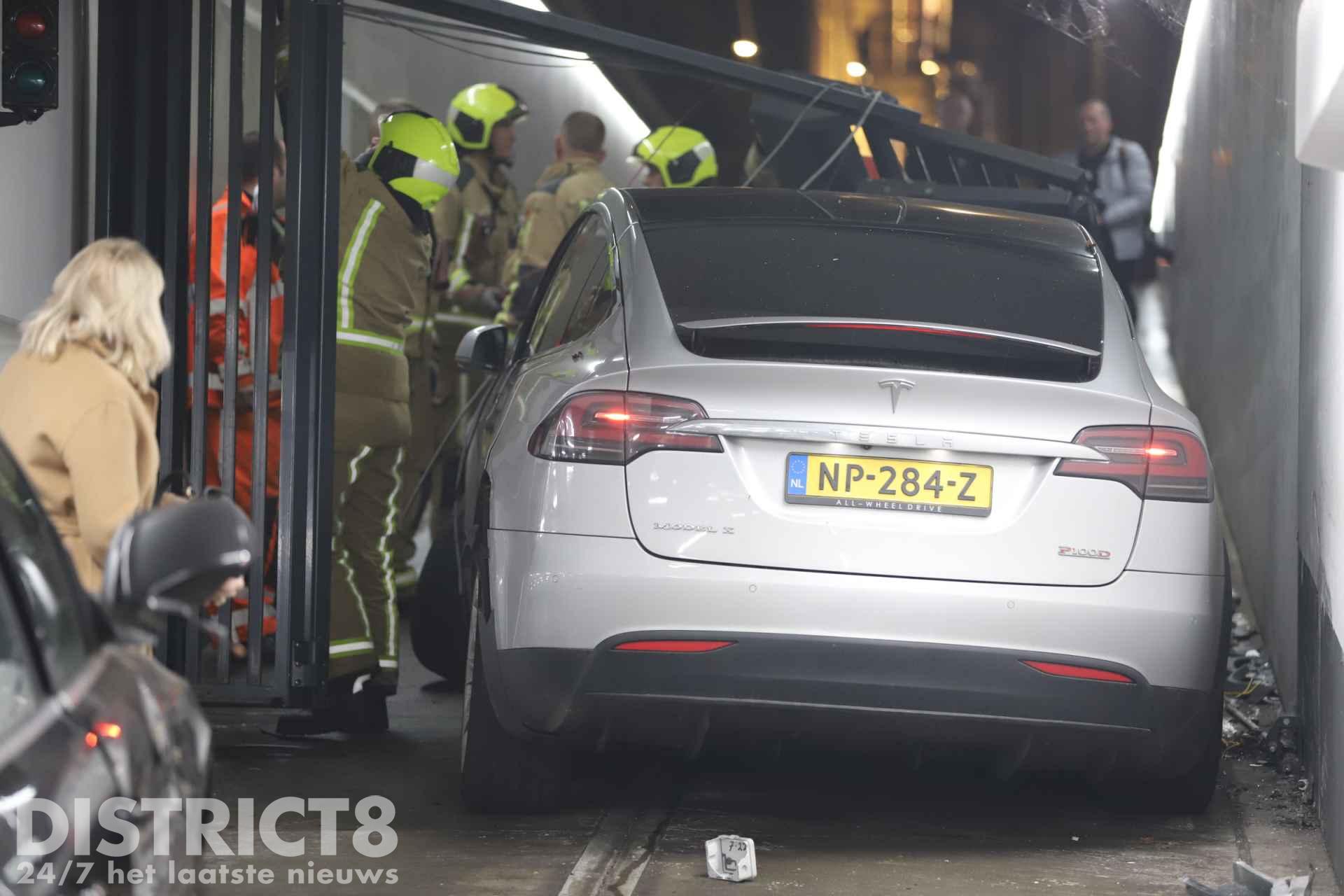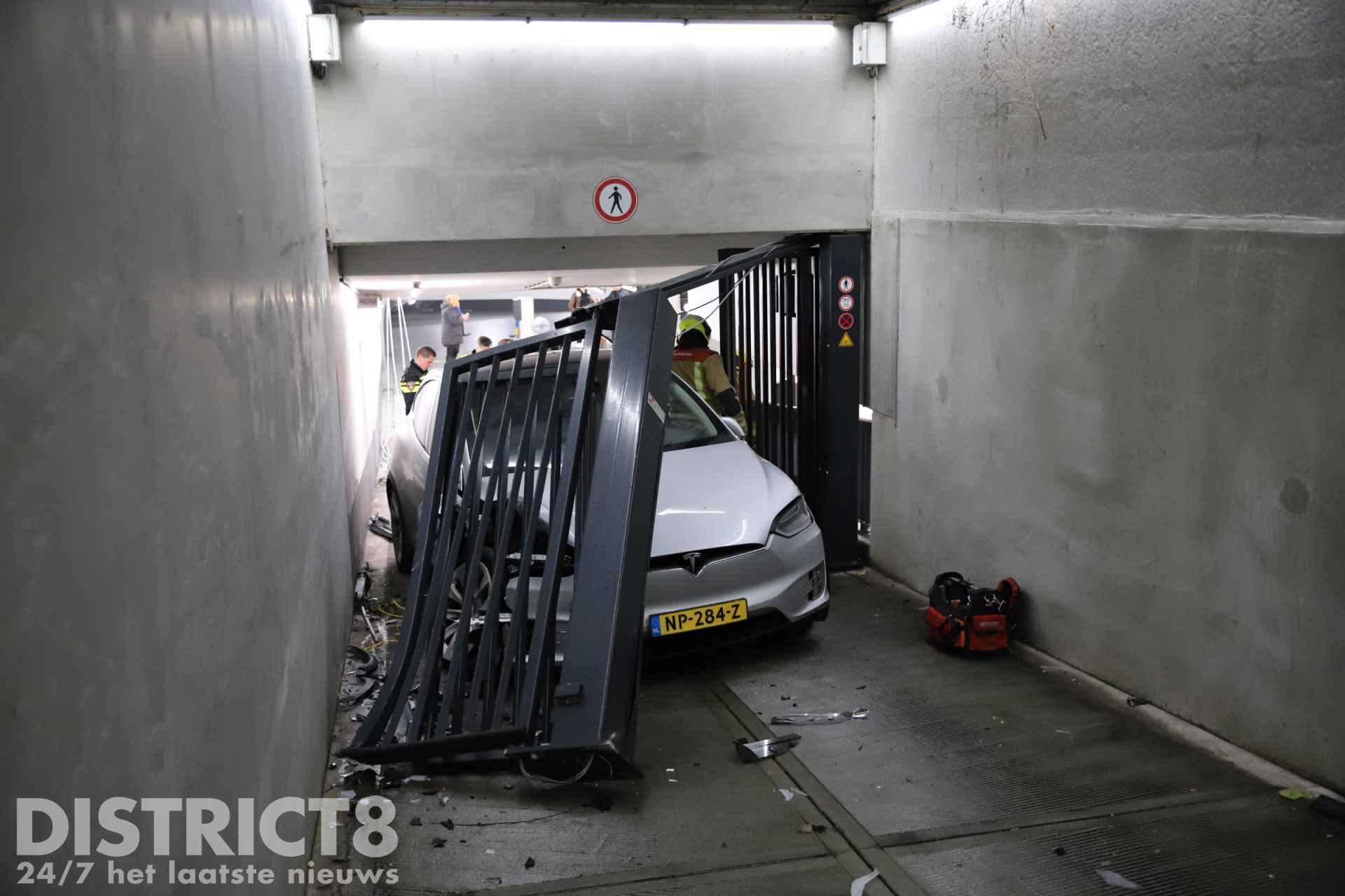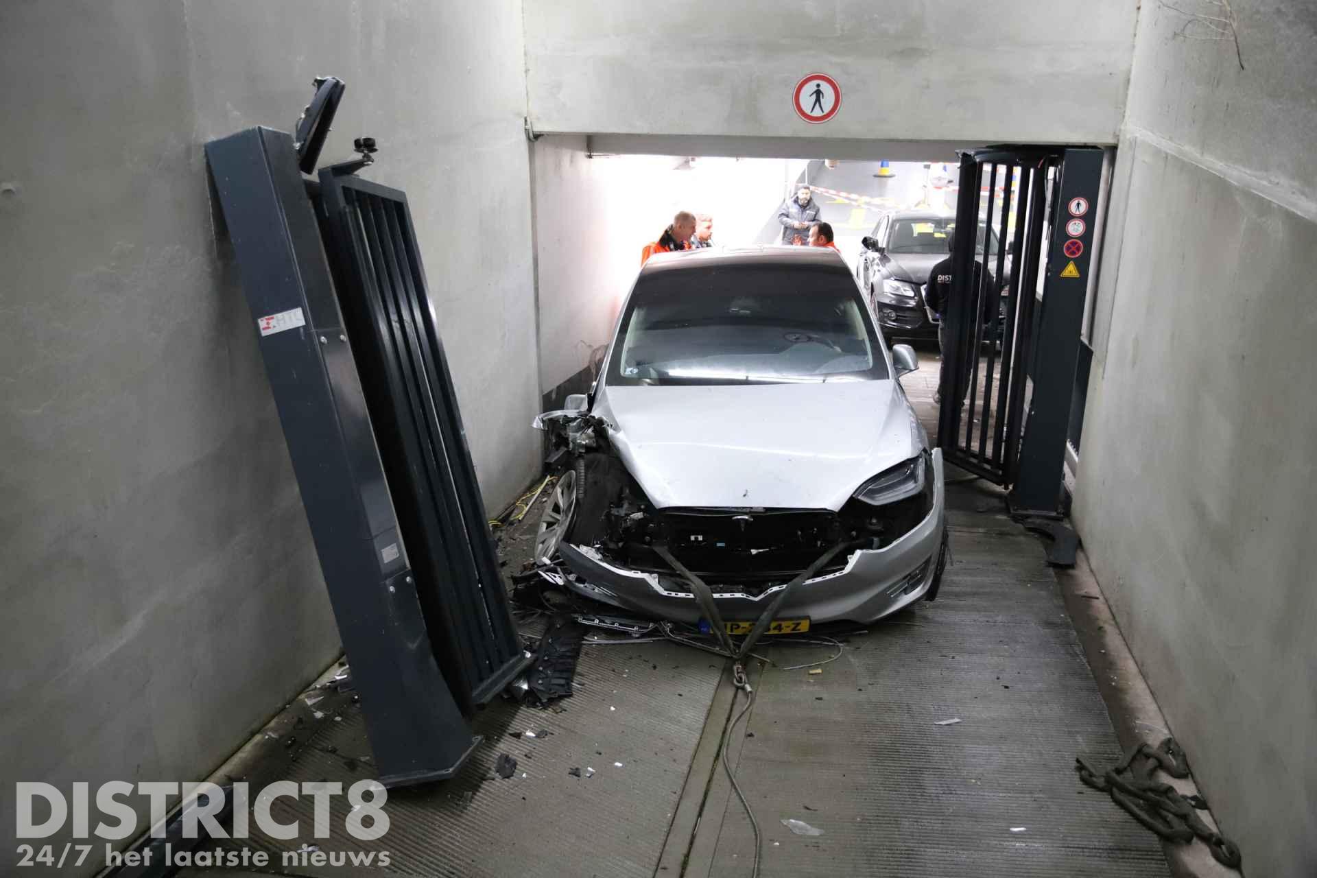 Een automobilist stond voor de slagboom om zijn parkeerkaartje in de automaat toen de auto, naar eigen zeggen, uit zichzelf begon te rijden. De bestuurder van de Tesla kon niet meer ingrijpen. De Tesla schramde een andere auto en knalde voor door het hek bij de uitgang.