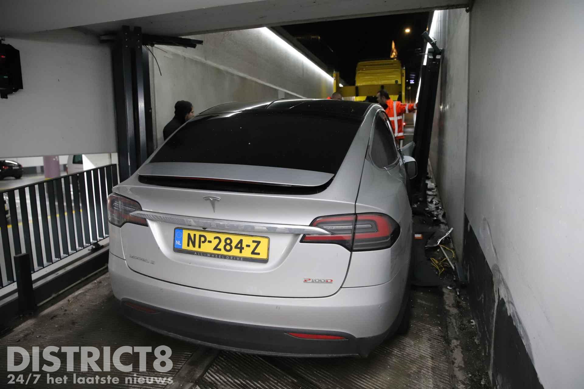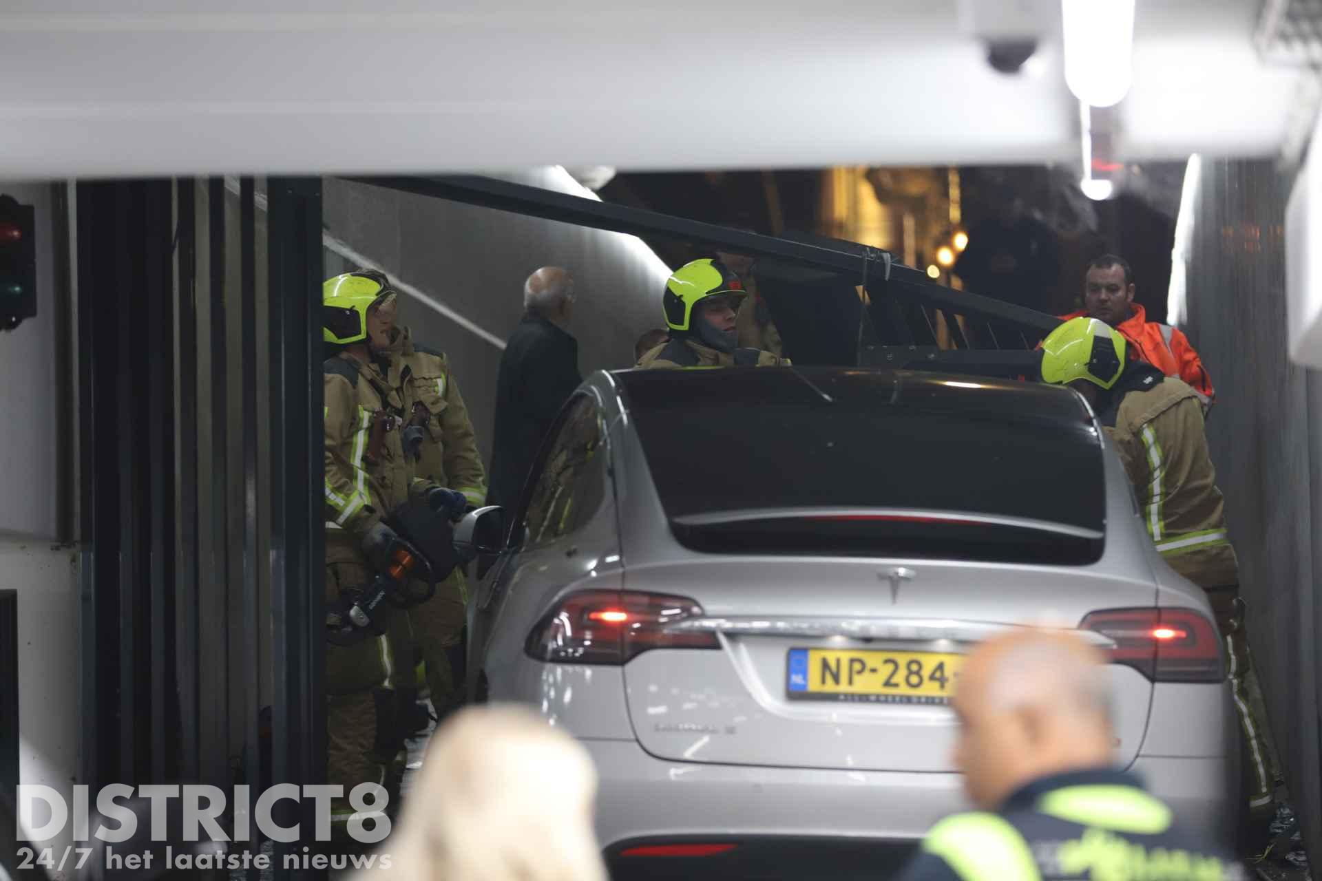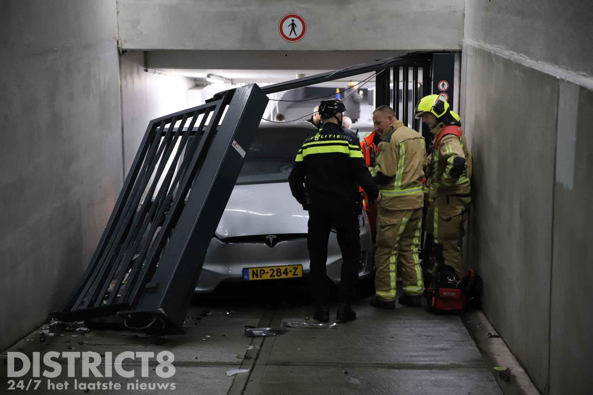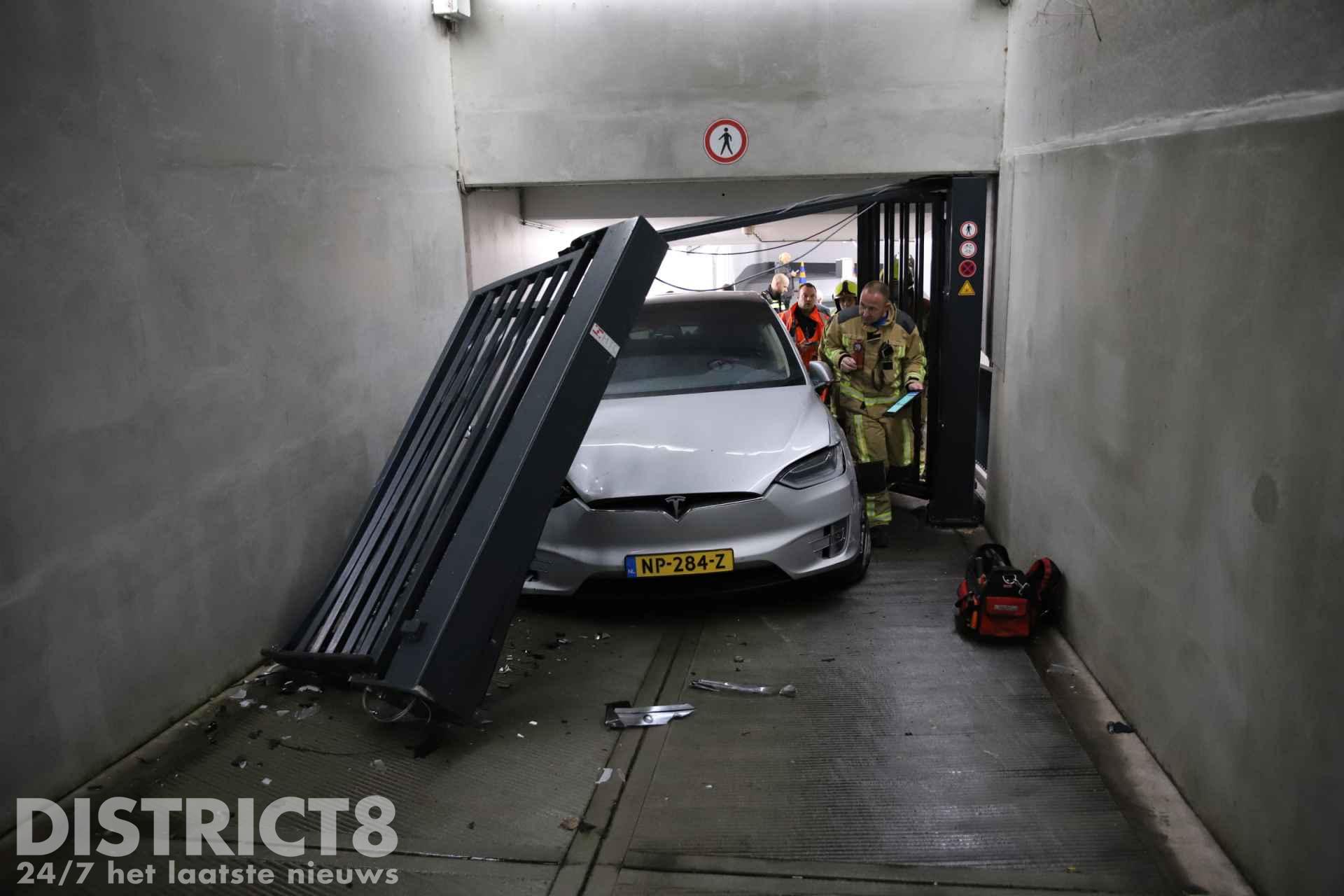 Een automobilist stond voor de slagboom om zijn parkeerkaartje in de automaat toen de auto, naar eigen zeggen, uit zichzelf begon te rijden. De bestuurder van de Tesla kon niet meer ingrijpen. De Tesla schramde een andere auto en knalde voor door het hek bij de uitgang.