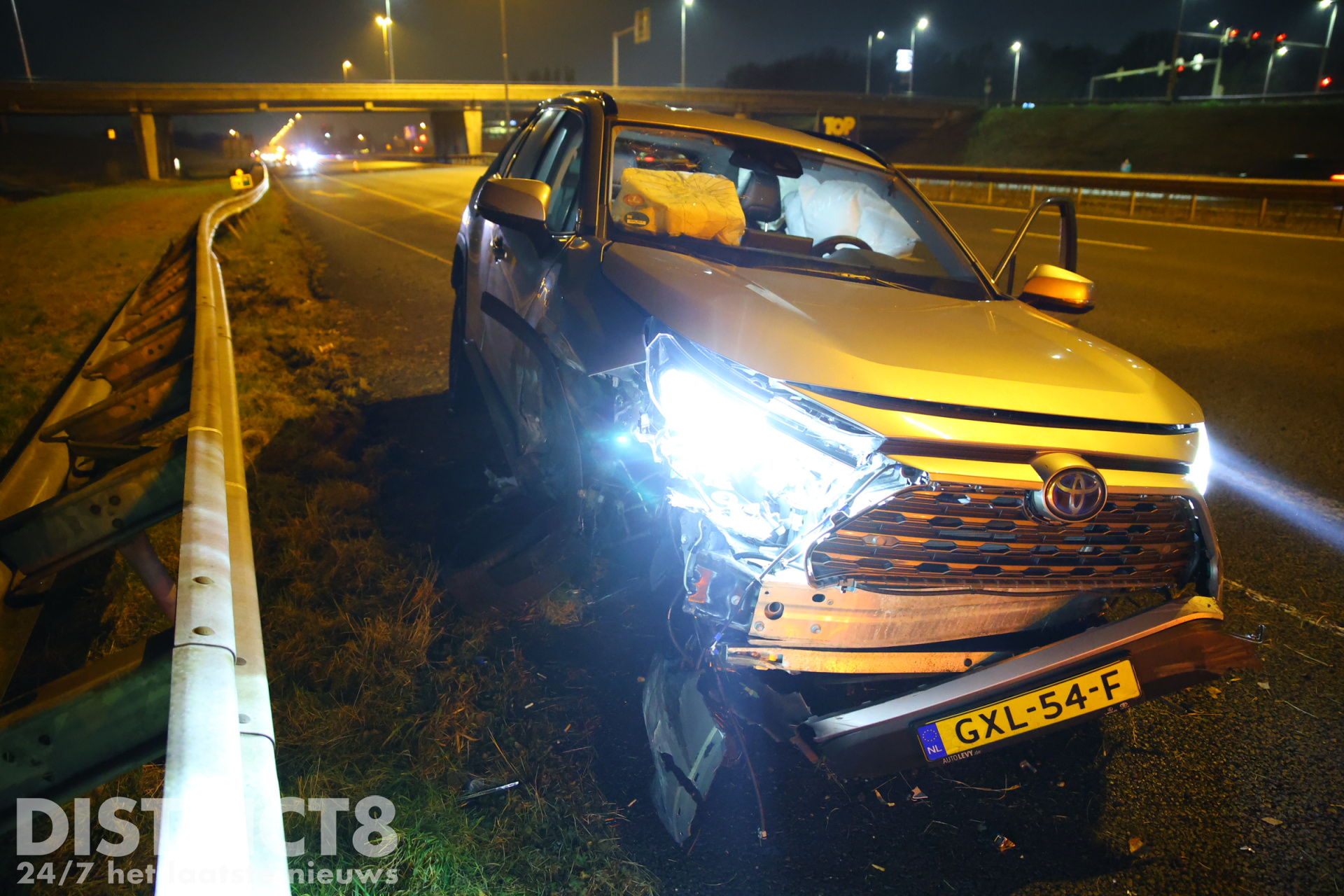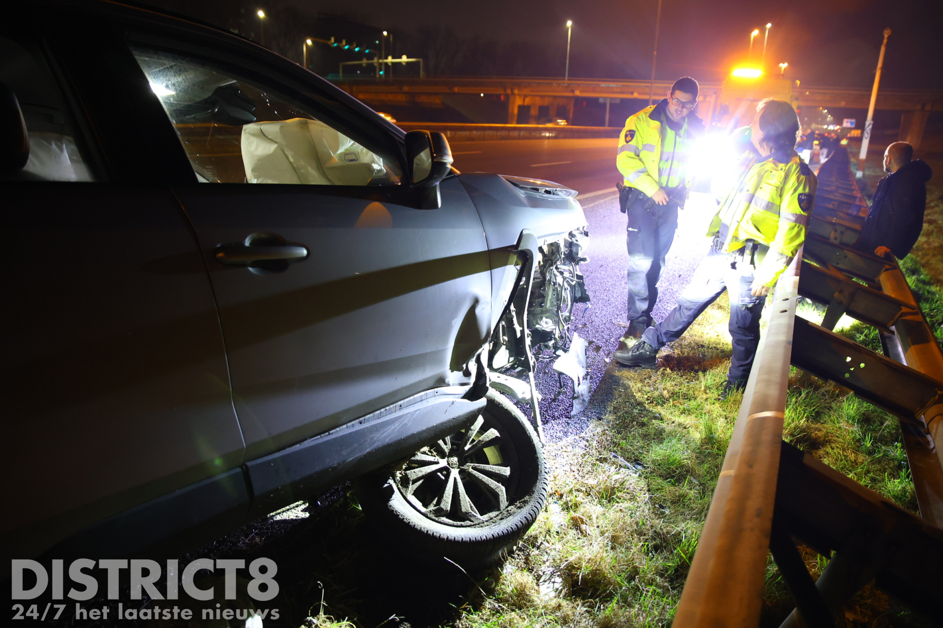 Delft – Op de A13 bij Delft heeft in de nacht van zaterdag 8 op zondag 9 februari een flink ongeval plaatsgevonden. Omstreeks 02:30 uur raakte een automobilist de vangrail aan de zijde van de middenberm, vervolgens vloog de wagen 3 rijstroken over en klapte met hoge snelheid in de vangrail aan de zijde van de buitenberm. Een automobilist kon de wagen maar net ontwijken.