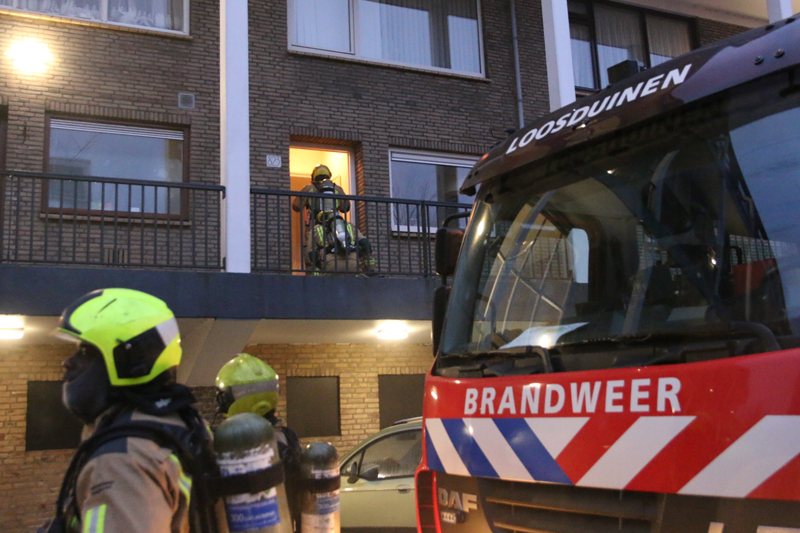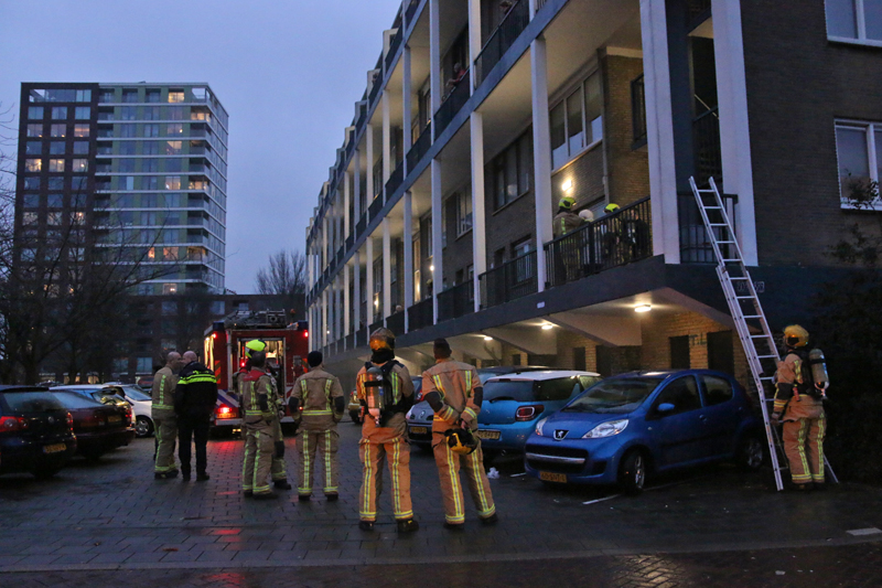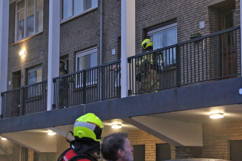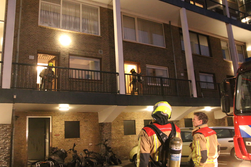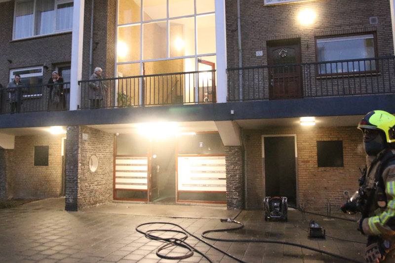 Bij aankomst van de eerste tankautospuit schaalde de brandweer op naar het sein “Middelbrand”. De rook was door het trappenhuis verspreid over de gehele portiek.