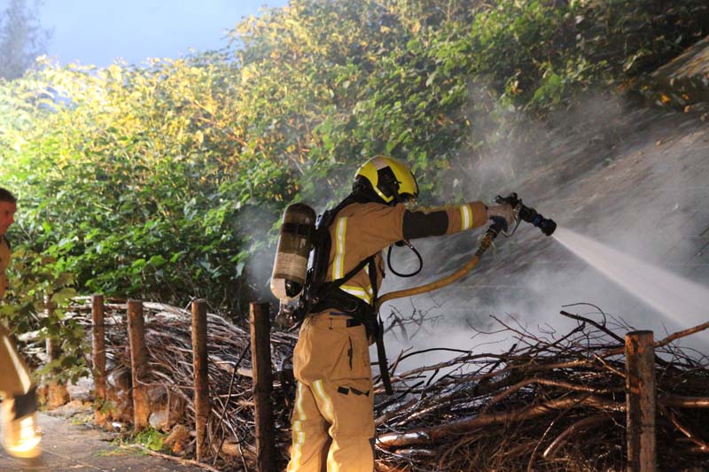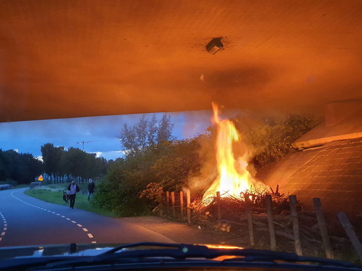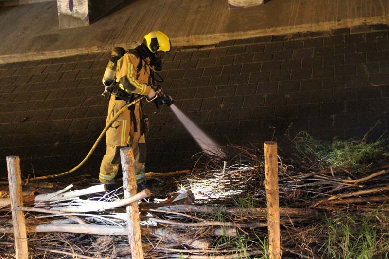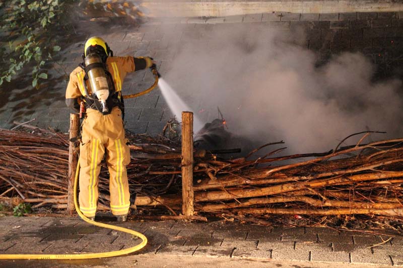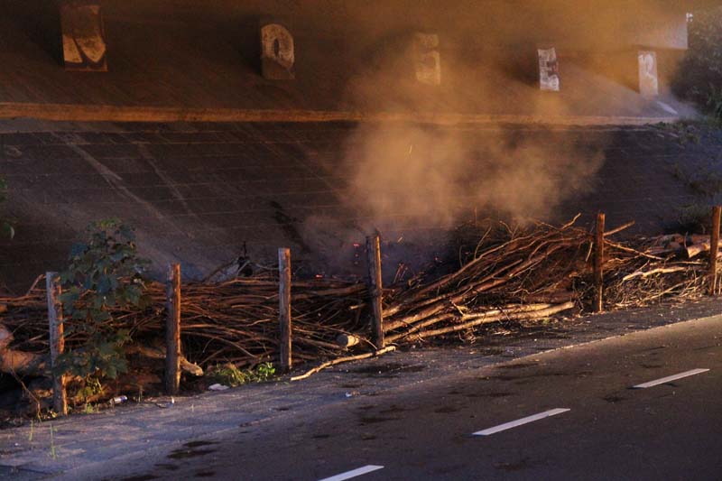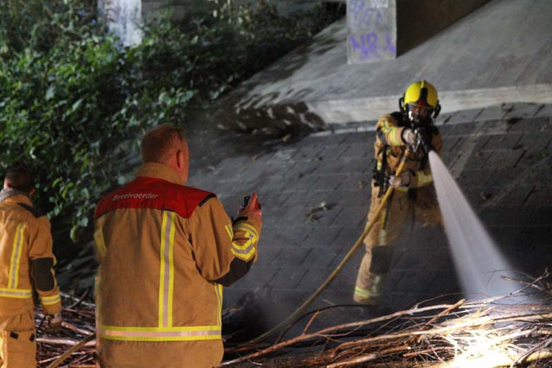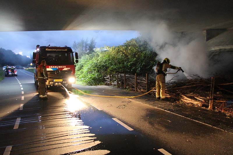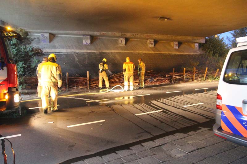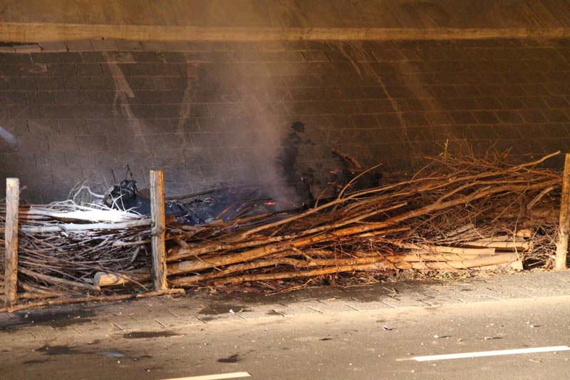 Tussen een afscheiding van wilgentakken langs de weg onder het viaduct woedde een hevige brand. Omstanders waarschuwden meteen de brandweer en hebben met emmers water het vuur voor een groot deel weten te doven.