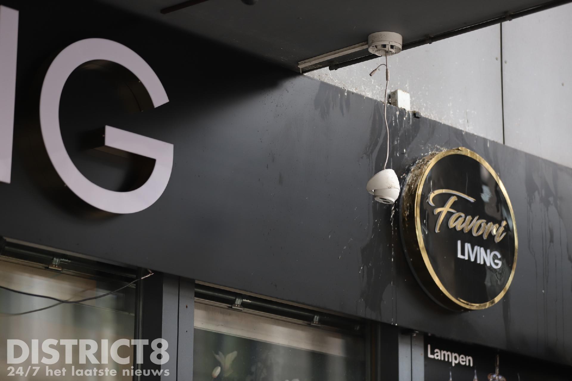 De beveiligingscamera aan de gevel van het pand is vernield. Ook een geparkeerd busje is beschadigd.