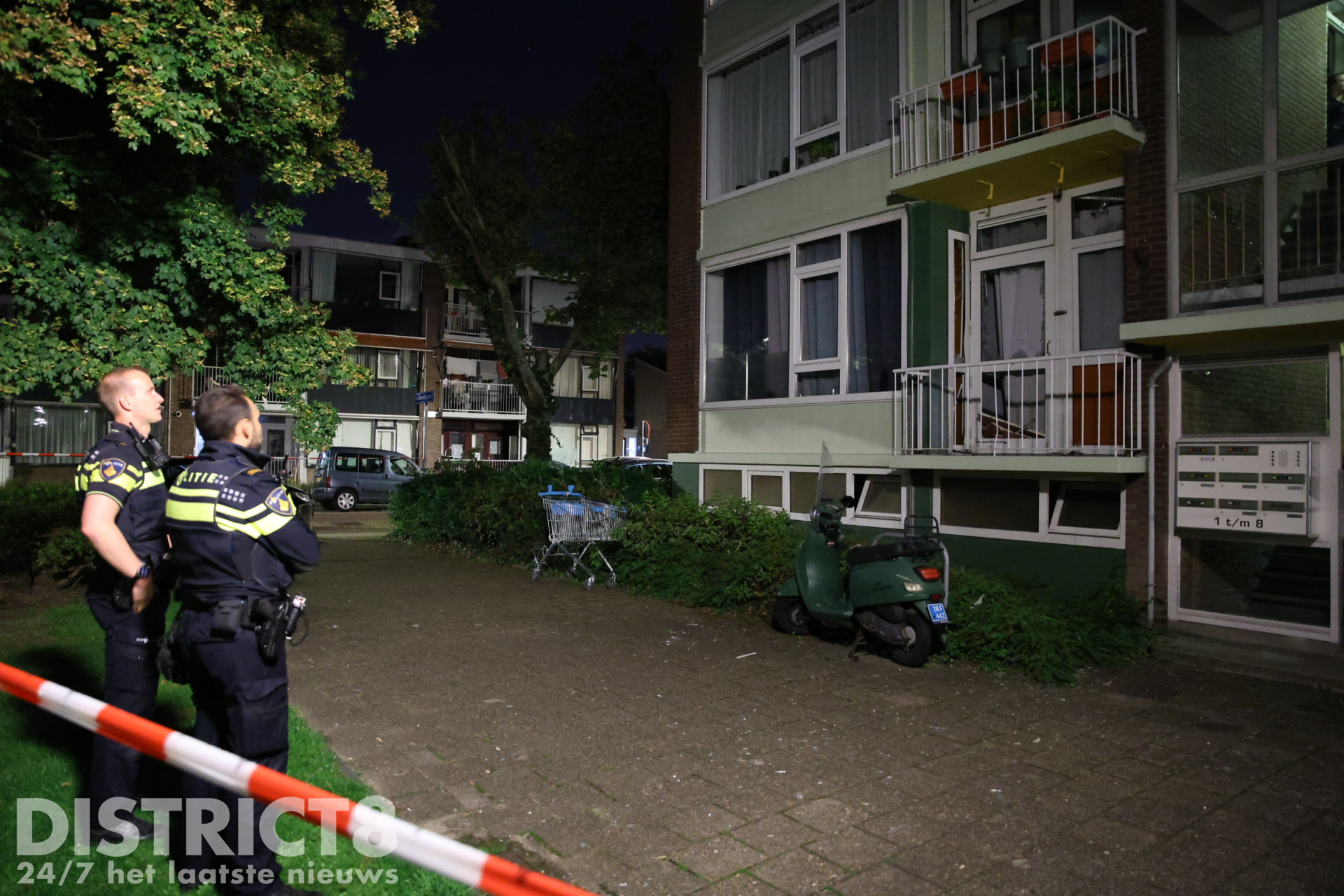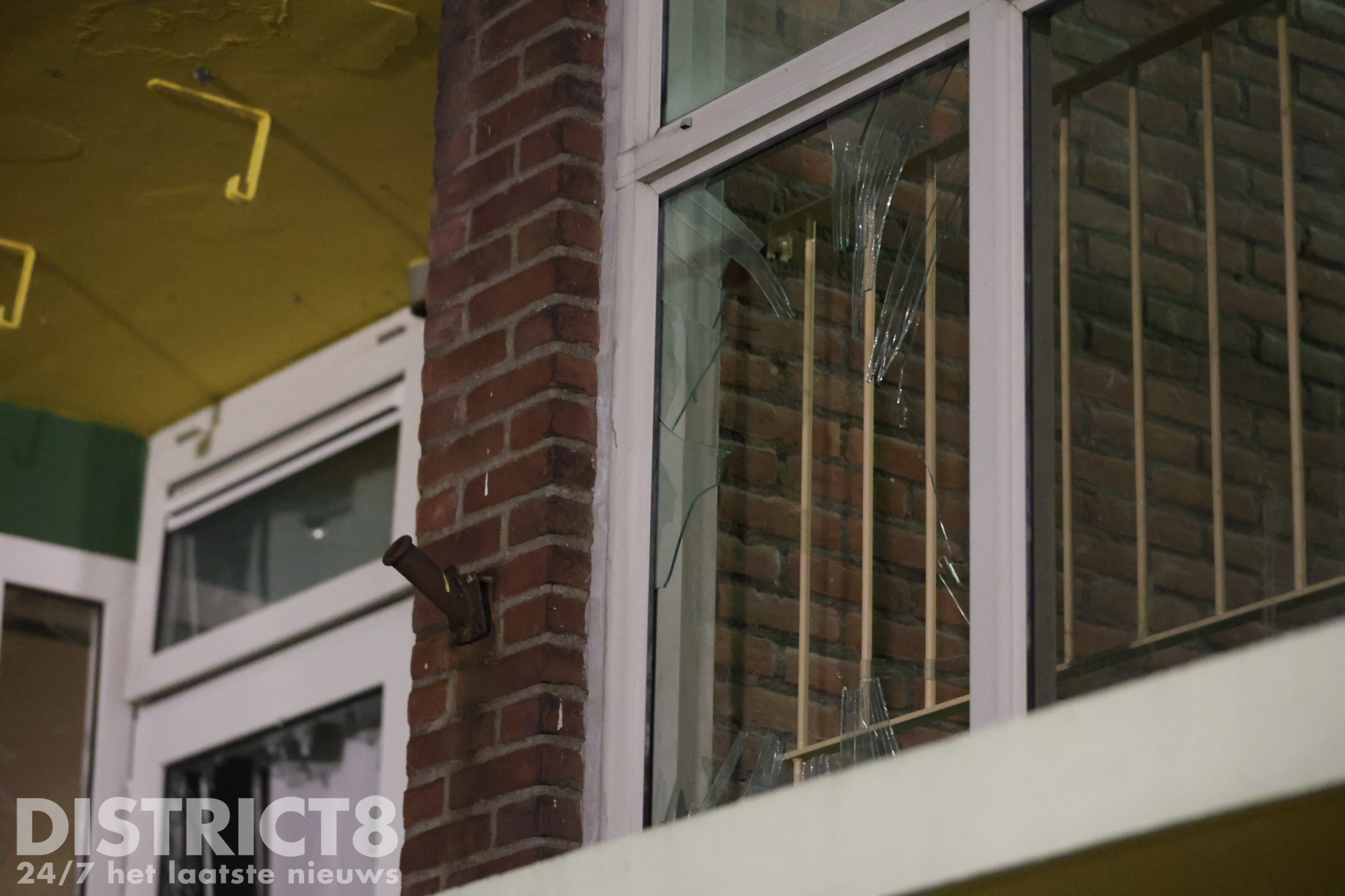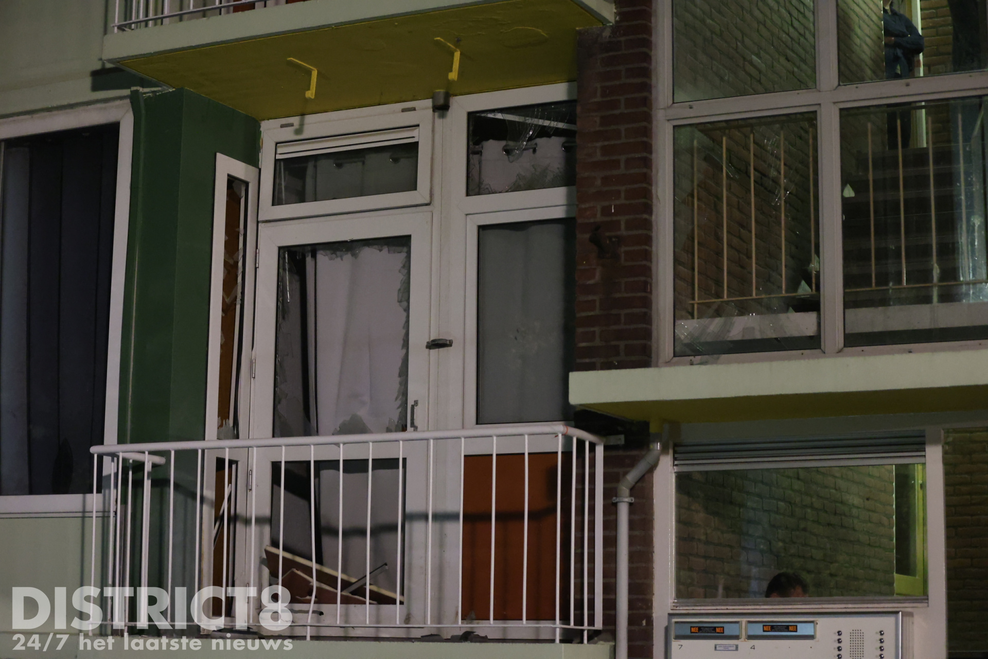 Bij een woning op de begane grond bleek een explosie te zijn geweest die flinke schade aanrichtte aan het kozijn van het balkon. Ook een raam van het portiek sneuvelde door de explosie.