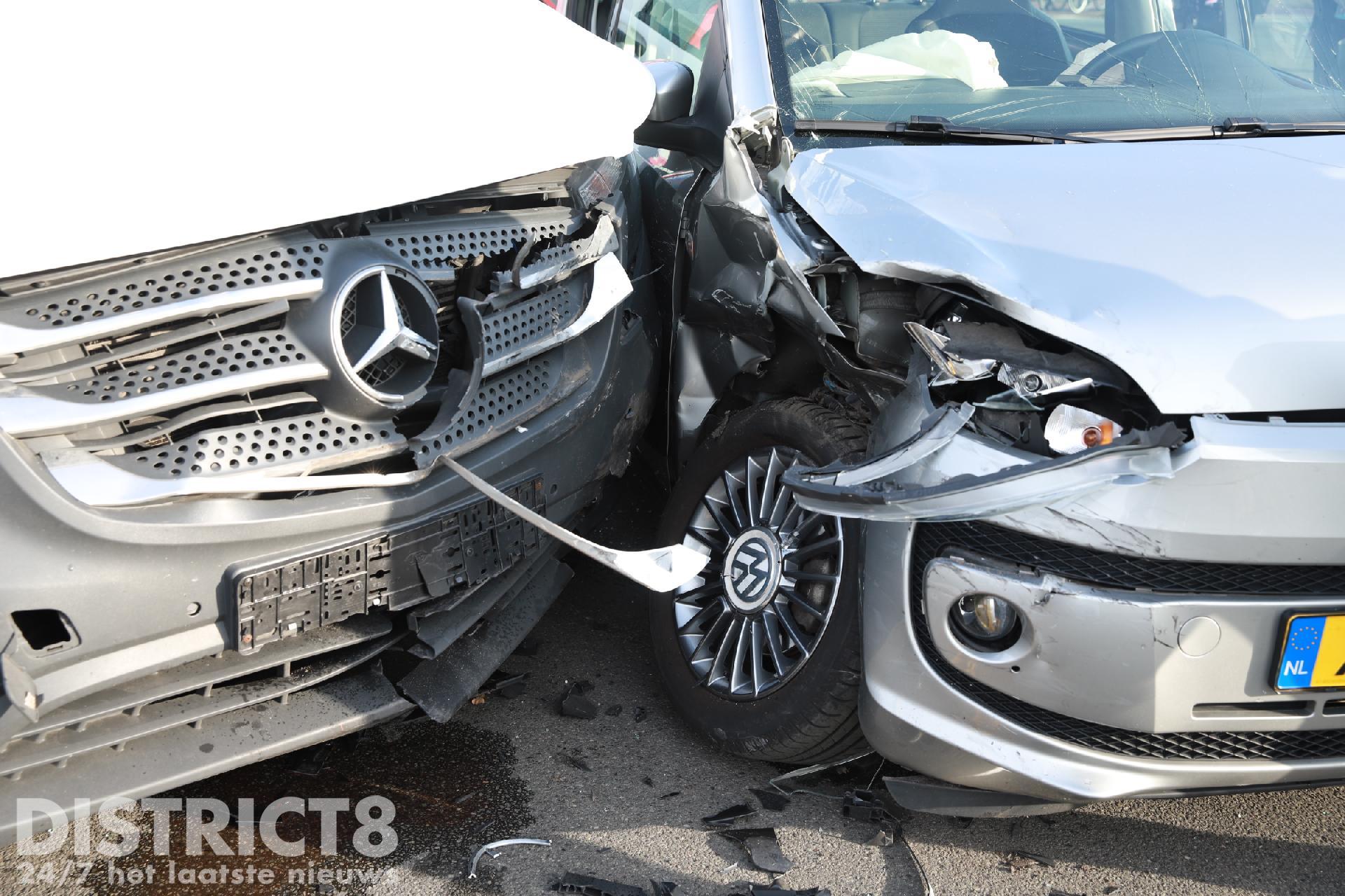 De politie heeft een gedeelte van de kruising van de Oude Haagweg met de Groen van Prinstererlaan afgesloten. Hierdoor ontstaat mede dankzijn het tijdstip flinke verkeerschaos. Een berger moet ter plaatse komen om beide voertuigen af te slepen.