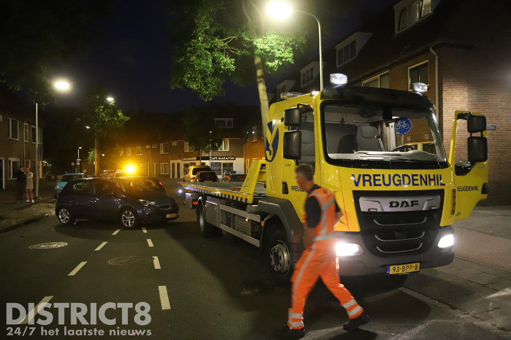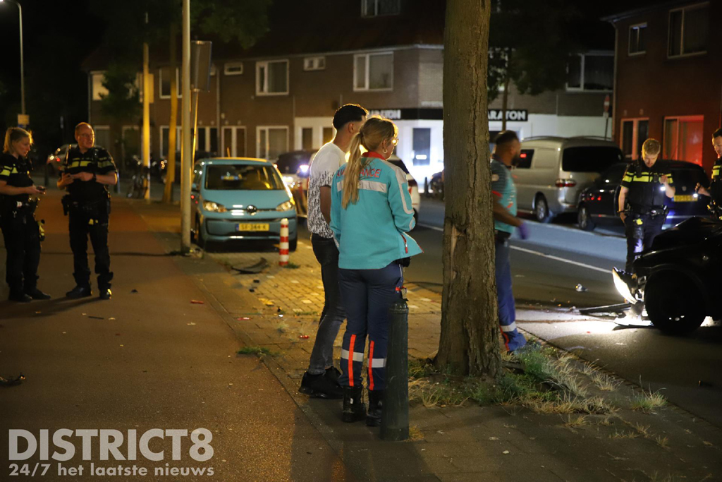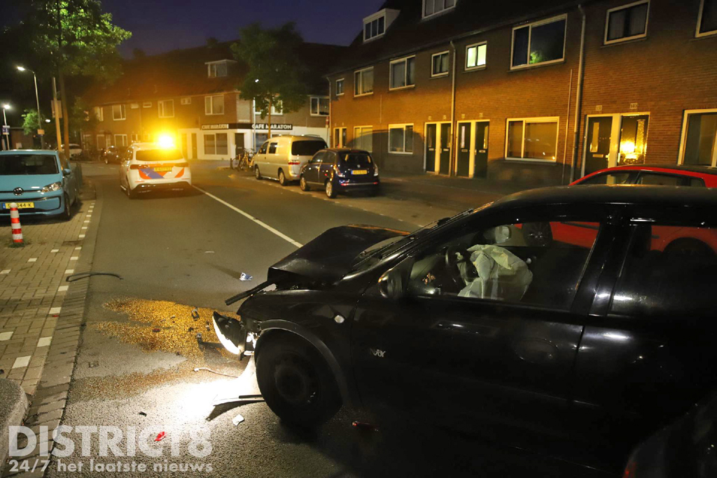 Bewoners hoorden een flinke knal en piepende banden. Toen zij naar buiten keken zagen zij een hoop brokstukken op straat.
