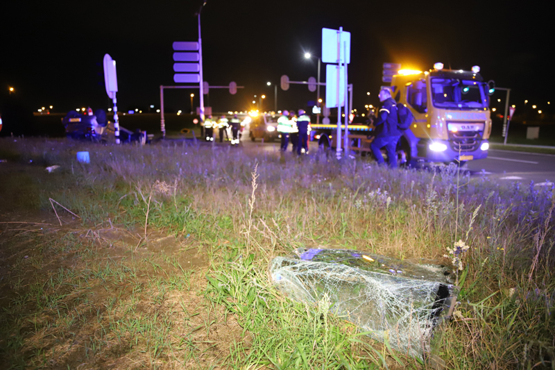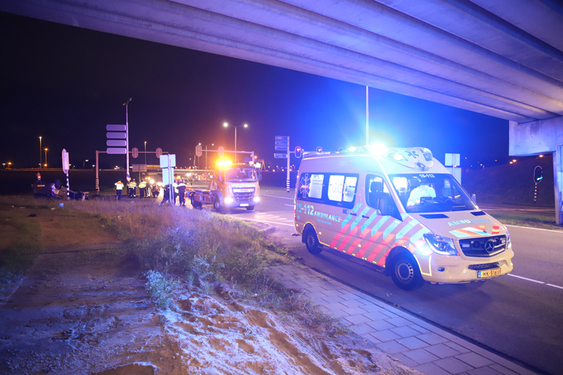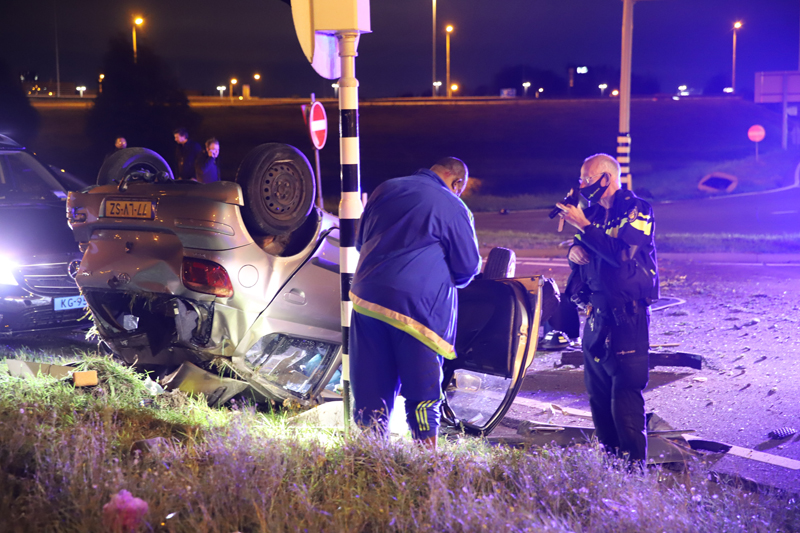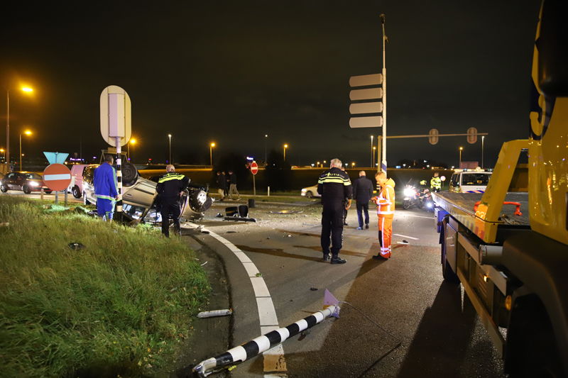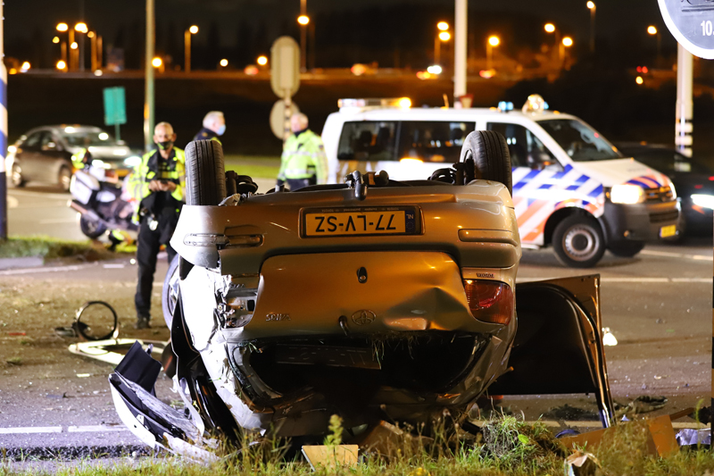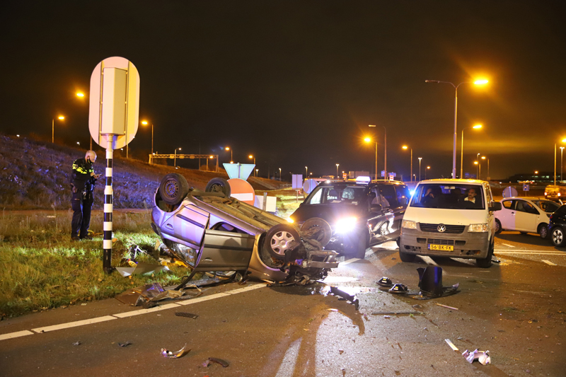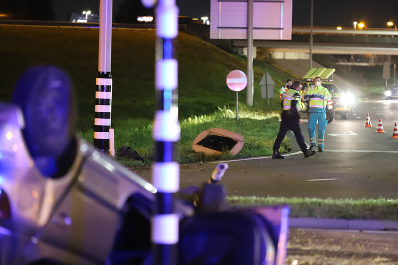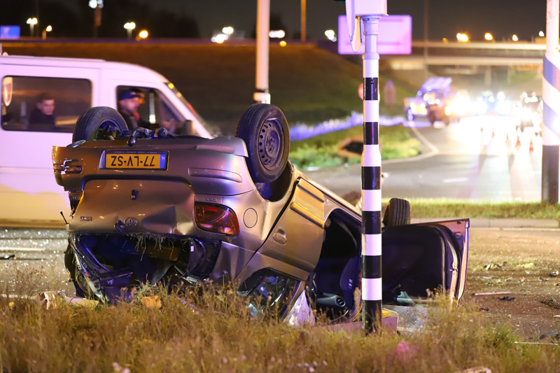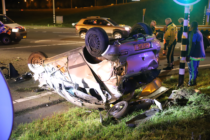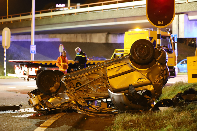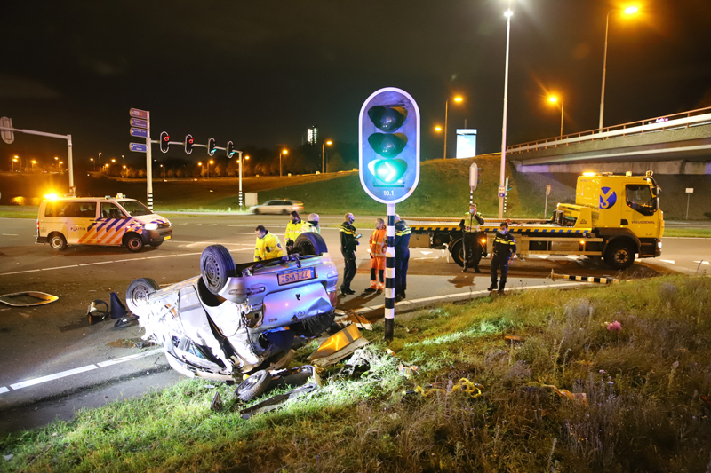 De automobilist nam vanavond vanaf de A4 de afrit richting Rijswijk. Door nog onbekende oorzaak raakte hij de macht over het stuur kwijt. Na het rammen van een verkeerslicht, kwam de auto op zijn dak tot stilstand.
