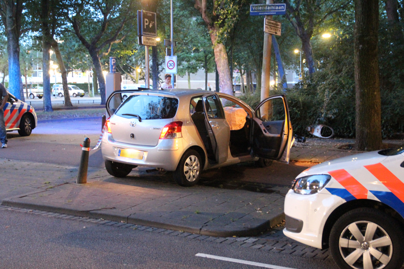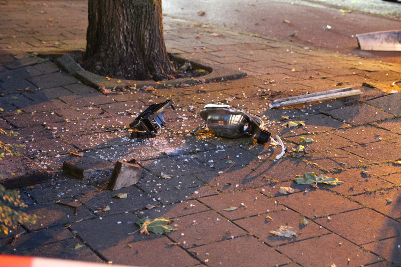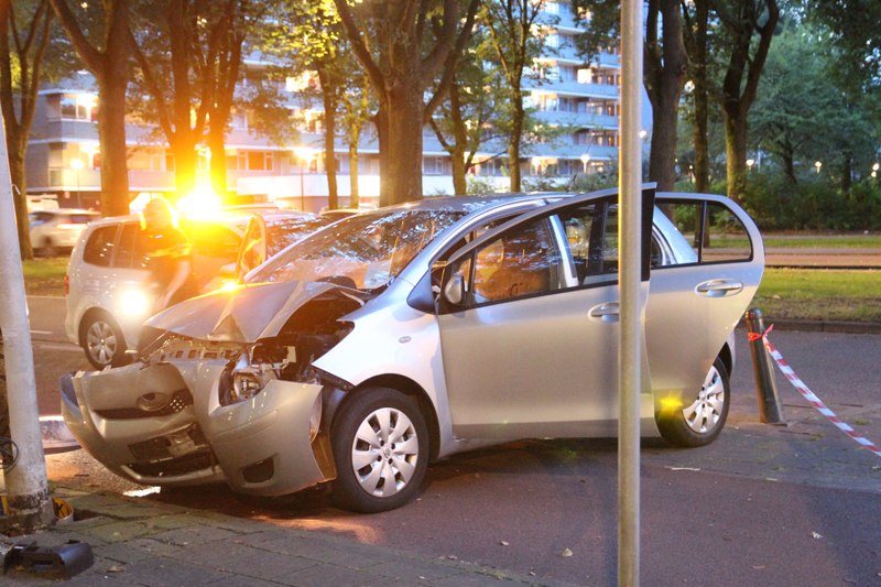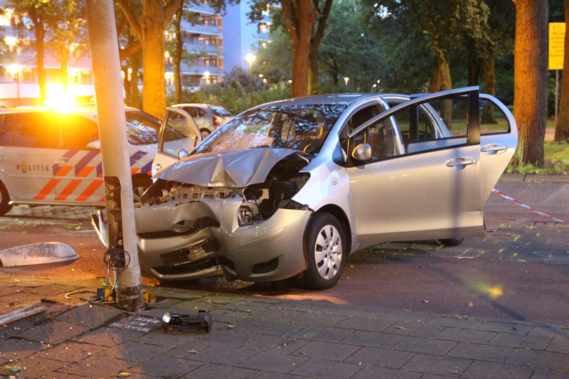 De auto moest worden afgesleept. De kap van de lantaarnpaal kwam door de knal naar beneden.