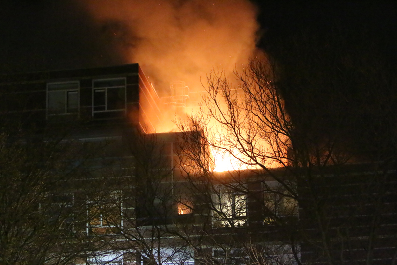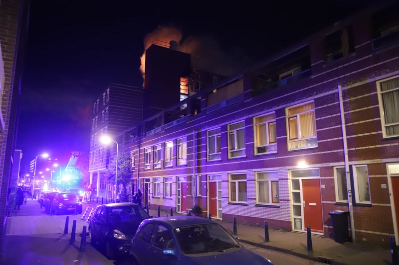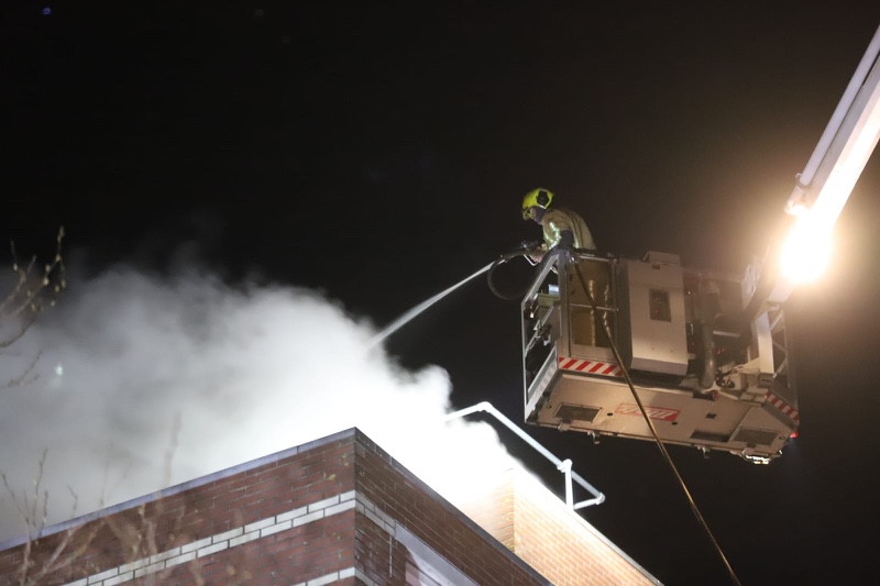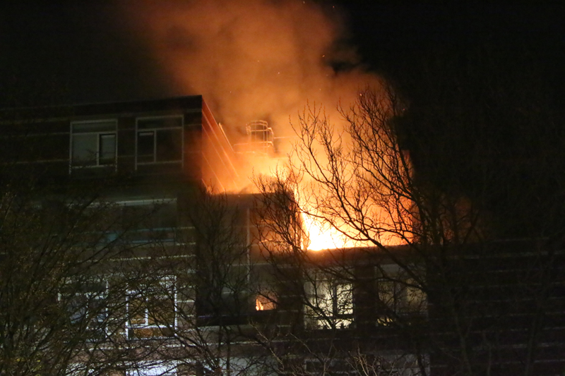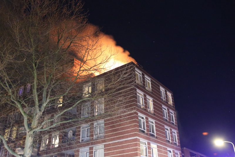 Net na middernacht kwam er bij de 112 meldkamer een erg verontrustend telefoontje binnen. Een bewoner van de Hemsterhuisstraat zag flinke vlammen van het dak van het complex komen. Direct werden meerdere hulpdiensten gealarmeerd en schaalde de brandweer snel op.
