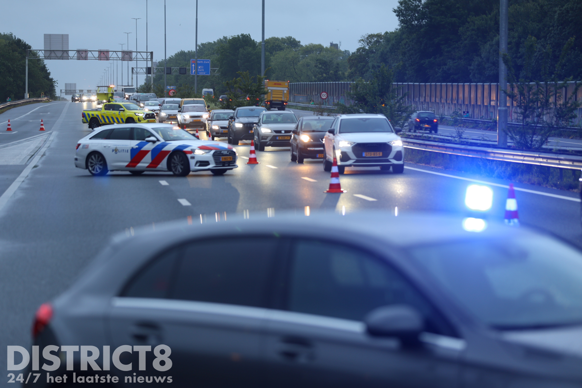 Vanwege de aanrijding zijn twee rijstroken afgesloten. Verkeer moet eerst naar rijstrook 1 en vervolgens direct weer uitwijken naar rijstrook 4, vanwege een ander ongeval verderop. Dit zorgt voor aanzienlijke vertraging in de richting van Den Haag.