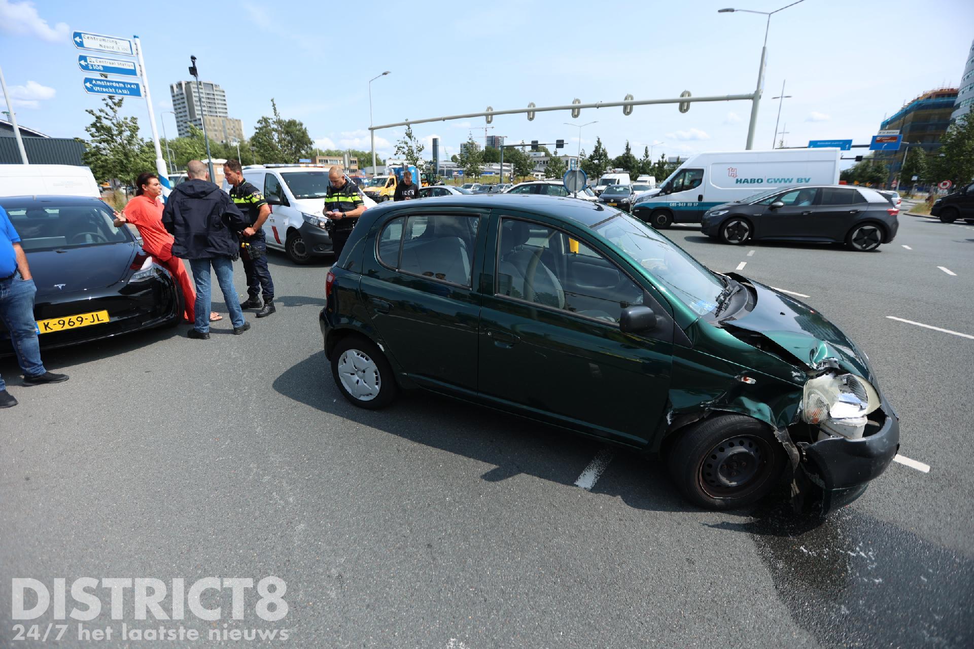 Hierbij kwamen twee voertuigen in botsing met elkaar. Één van de twee voertuigen lekt vloeistoffen aan de voorkant van het voertuig.