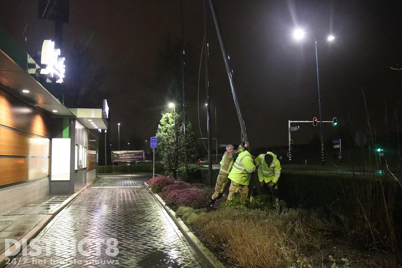 De brandweer heeft de vlaggenmast gedemonteerd en langs de weg gelegd, hierna kon de Macdrive weer open.