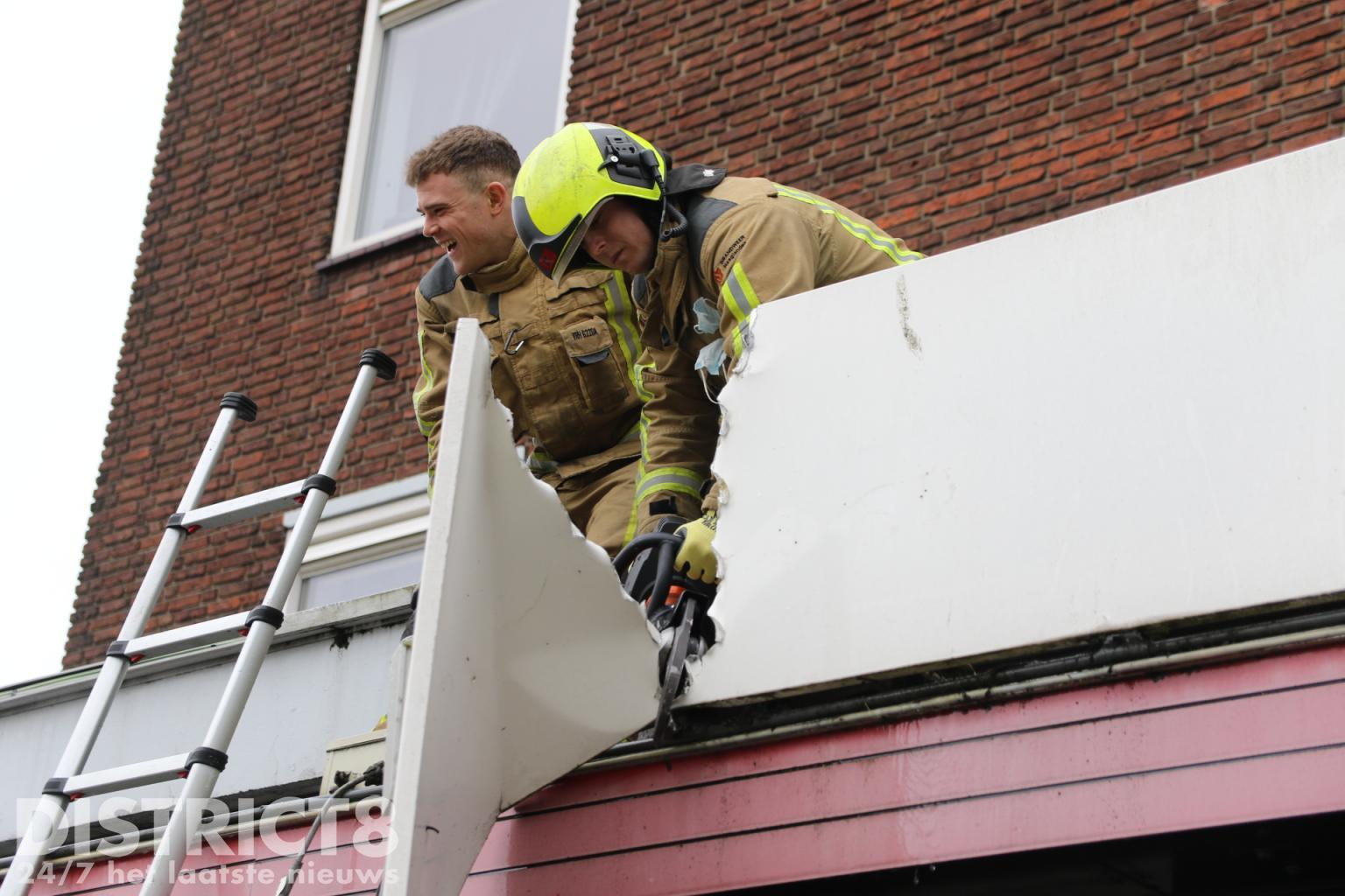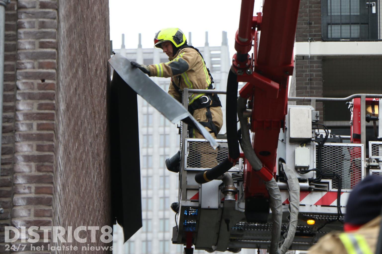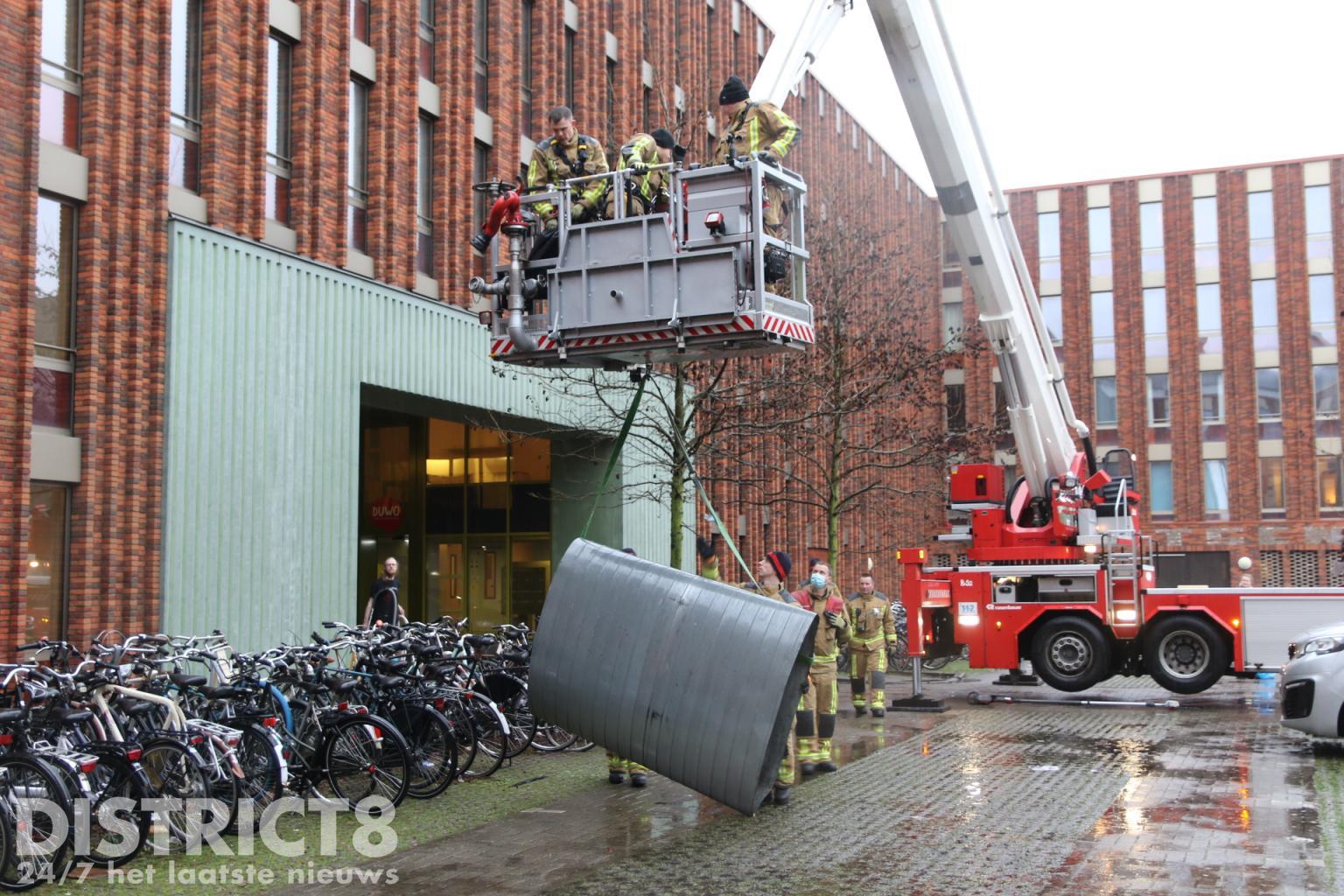 De brandweer kwam ter plaatse. Zij hebben de platen die op de grond lagen vastgelegd met stenen. Eén van de platen hing nog deels vast aan het pand, deze is door de brandweer met een spreider verwijderd.
