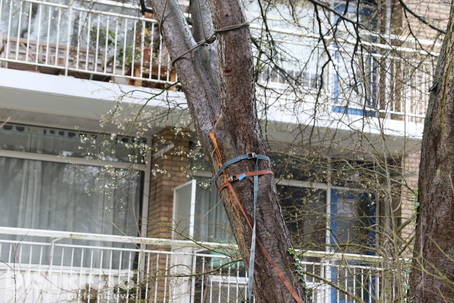 De brandweer kwam ter plaatse, zij hebben de tak met spanbanden vastgezet, de omgeving afgezet en vervolgens een bomen expert ingeschakeld.