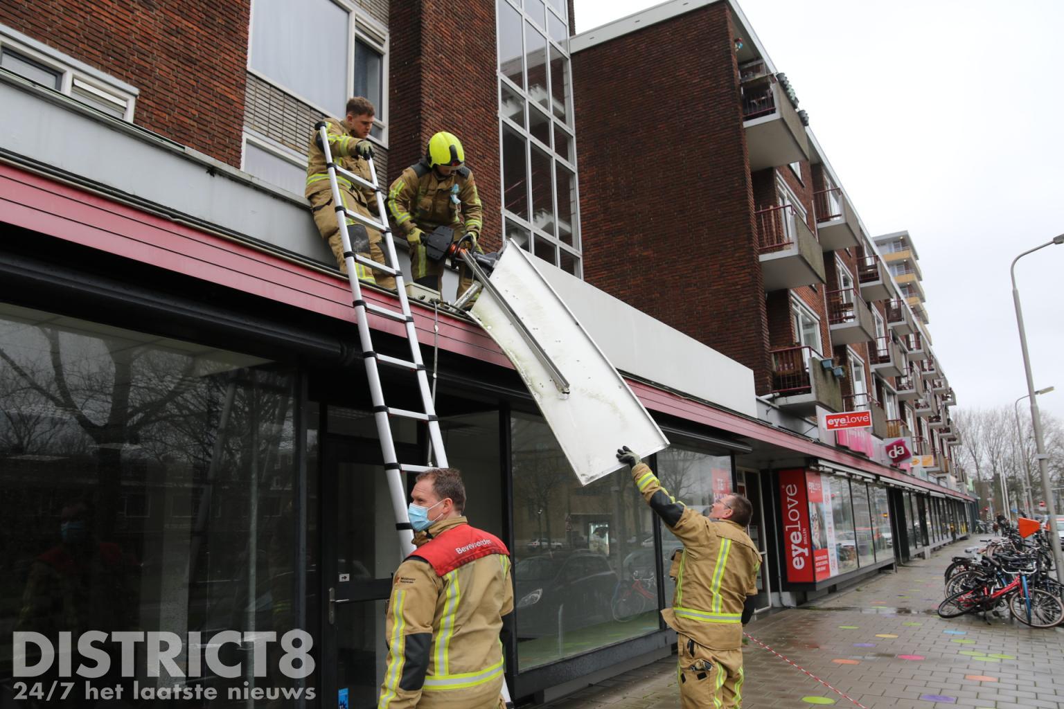 Delft – Op de Van Foreestweg in Delft zijn door de harde windstoten een aantal aluminium platen van een leegstaand winkelpand losgewaaid.
