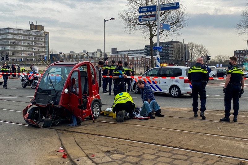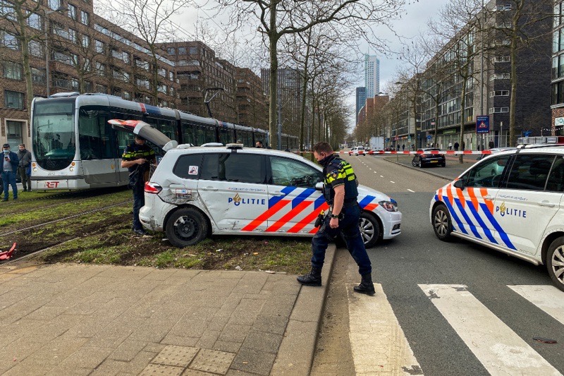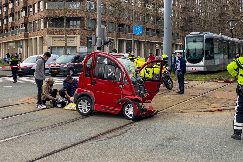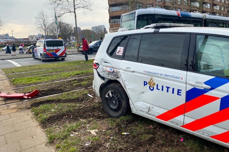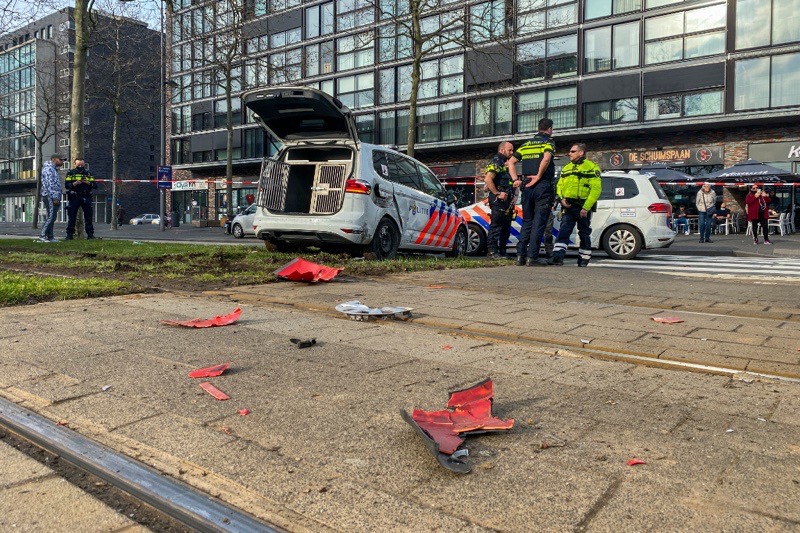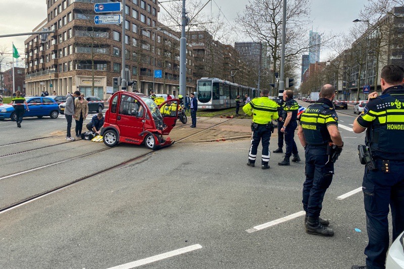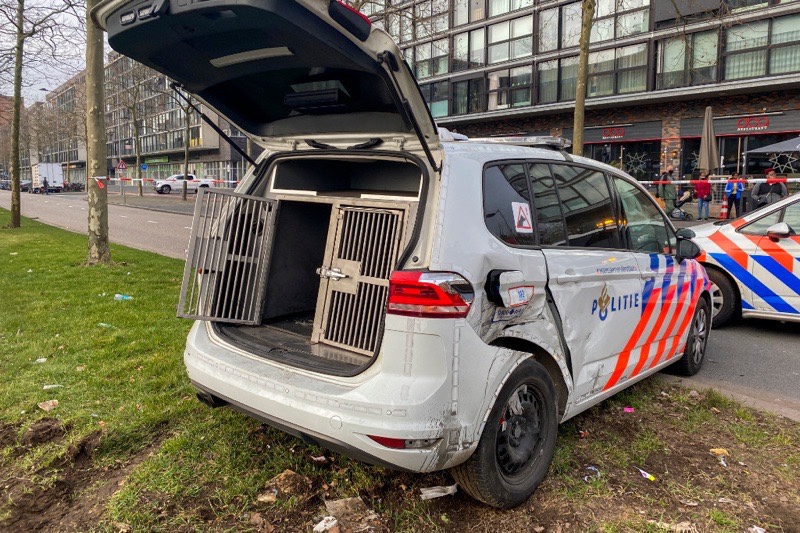 Rotterdam – Op de Laan op Zuid is donderdagmiddag een ravage ontstaan nadat een 40km wagentje en een hondenwagen van de politie op elkaar botsten.