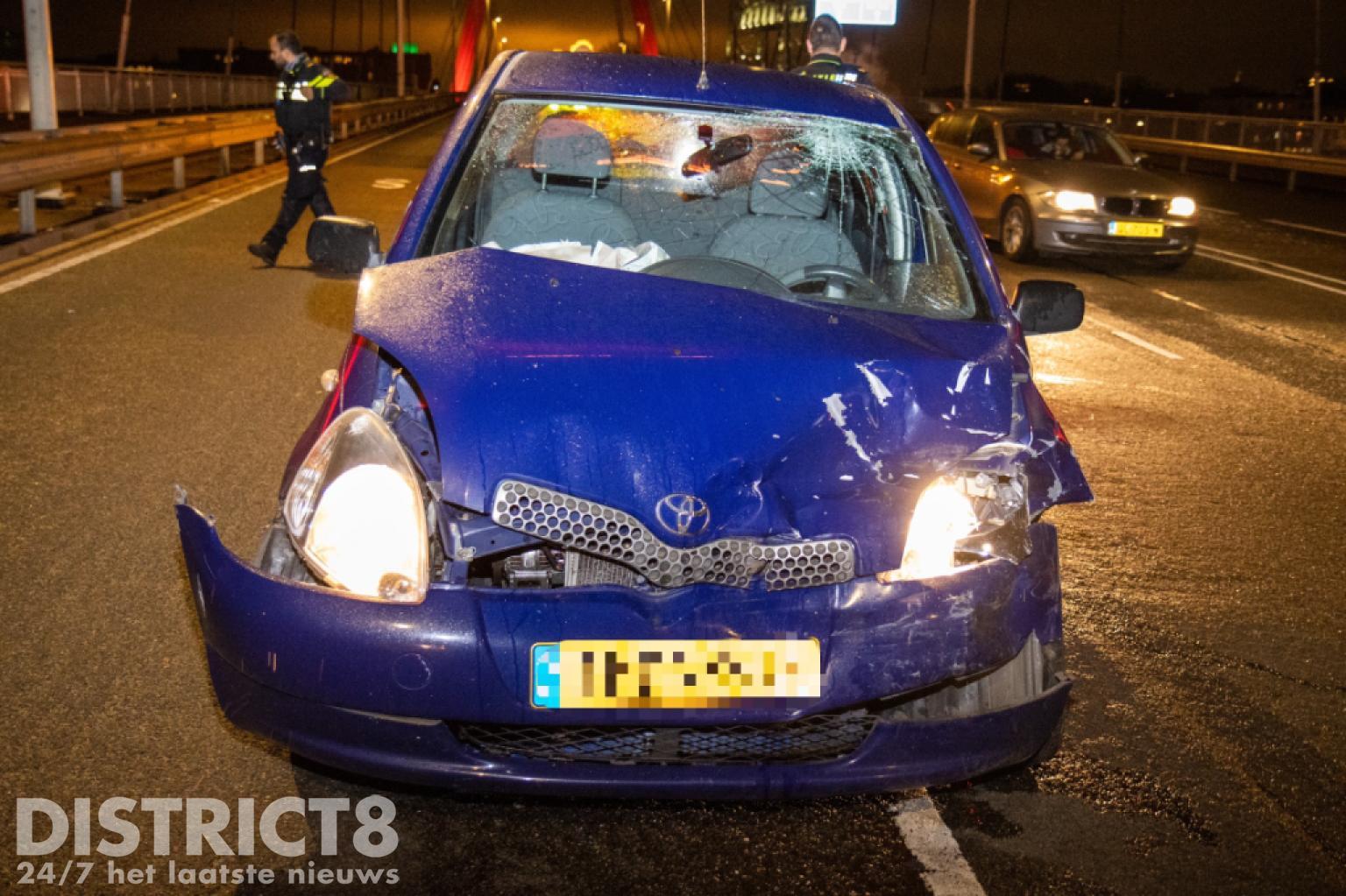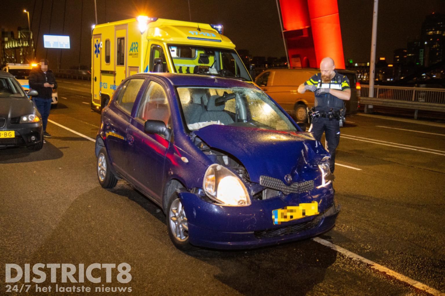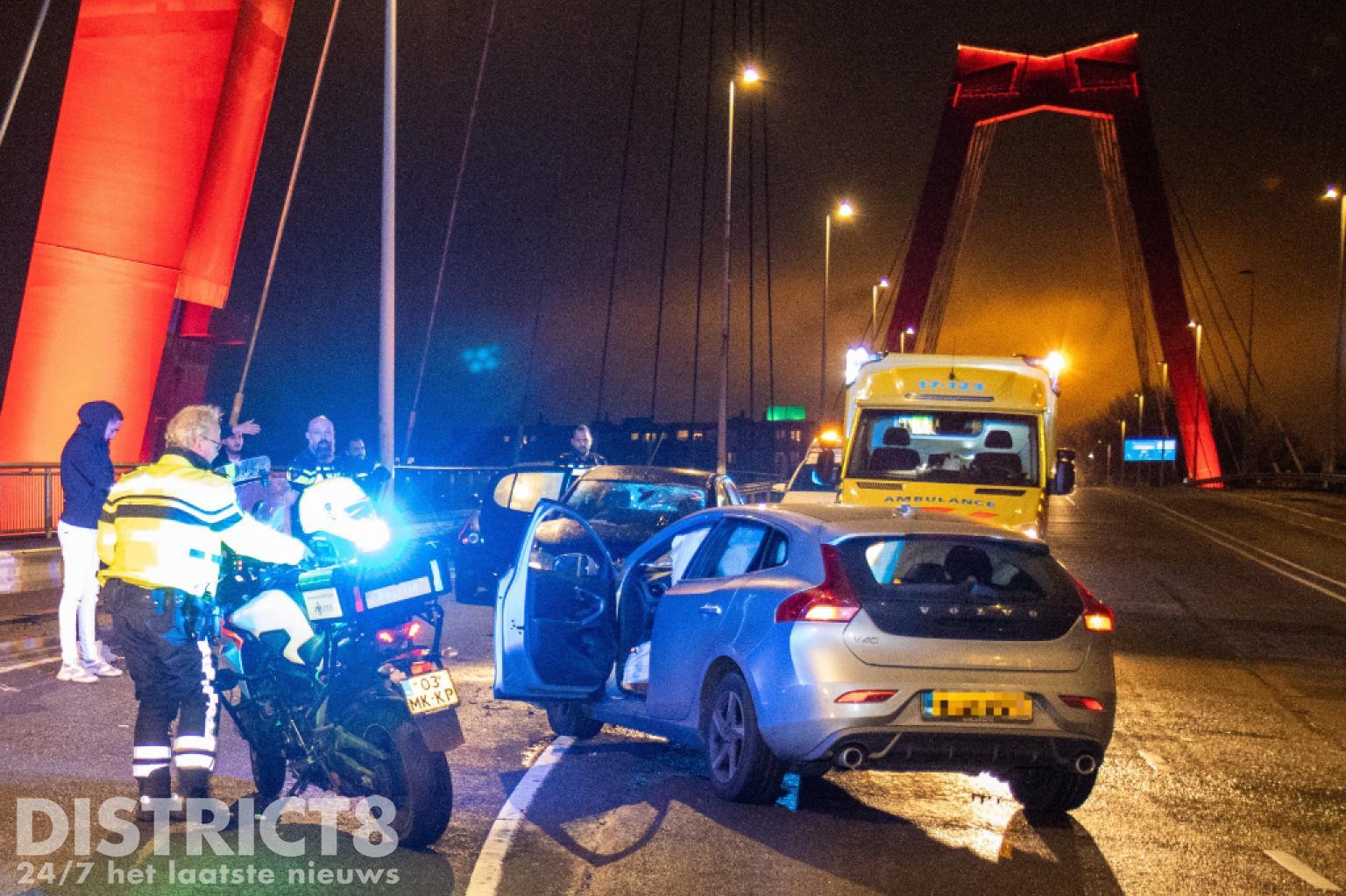 Rotterdam – Een auto is in de nacht van vrijdag op zaterdag uit de bocht gevlogen en frontaal tegen een auto aangereden op de Willemsbrug.