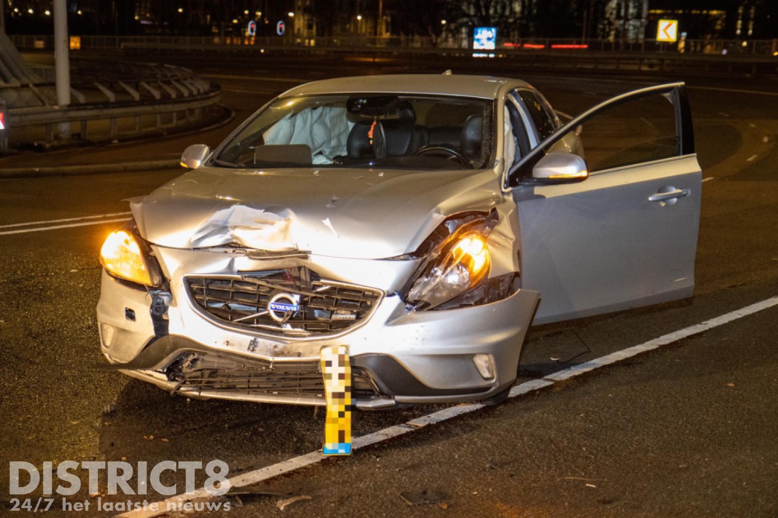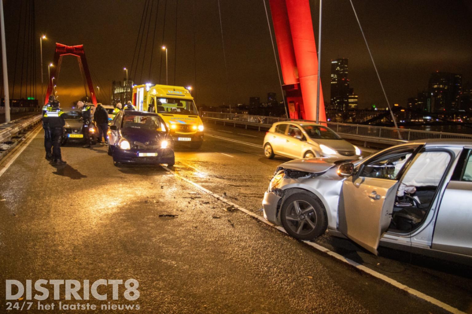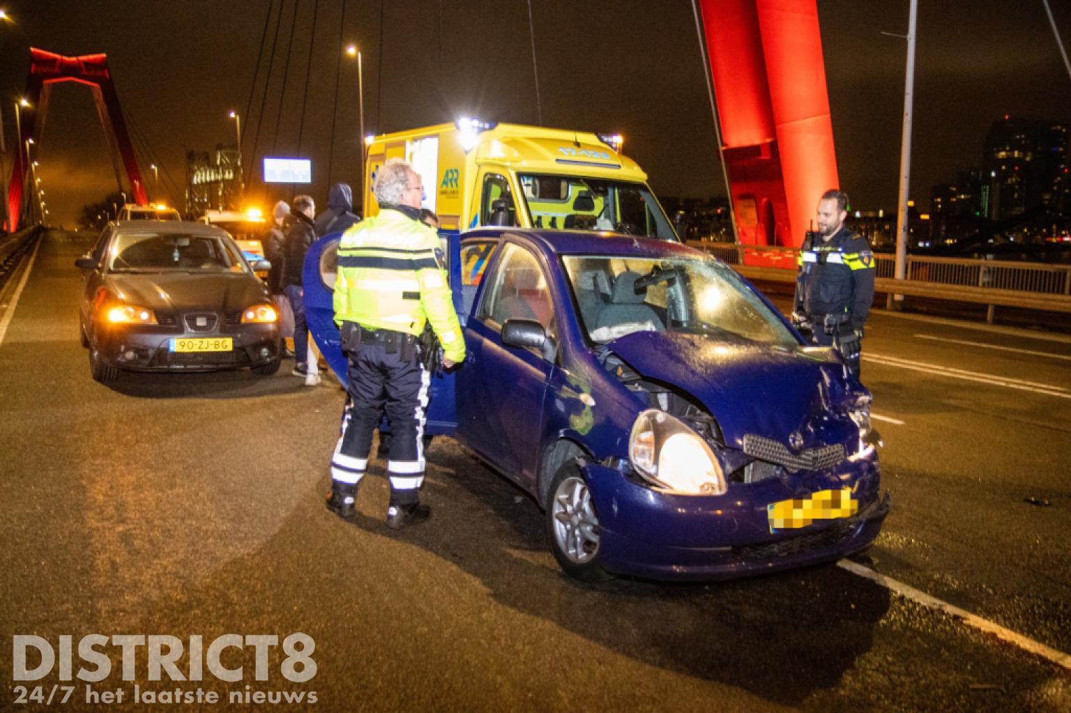 Rotterdam – Een auto is in de nacht van vrijdag op zaterdag uit de bocht gevlogen en frontaal tegen een auto aangereden op de Willemsbrug.