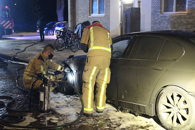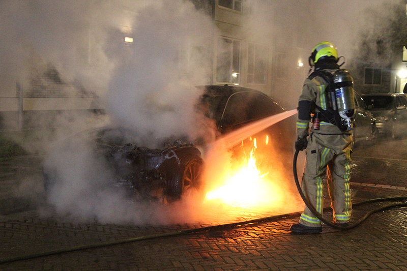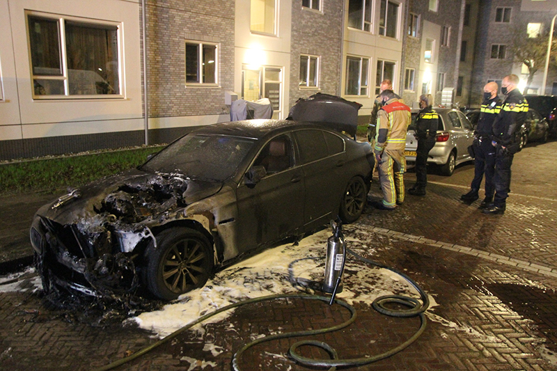 De auto heeft door de brand enorme schade opgelopen, mogelijk is de oorzaak brandstichting.