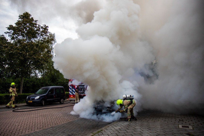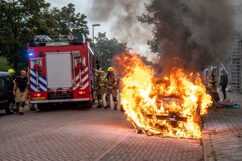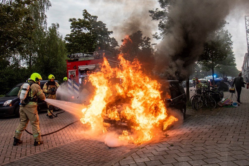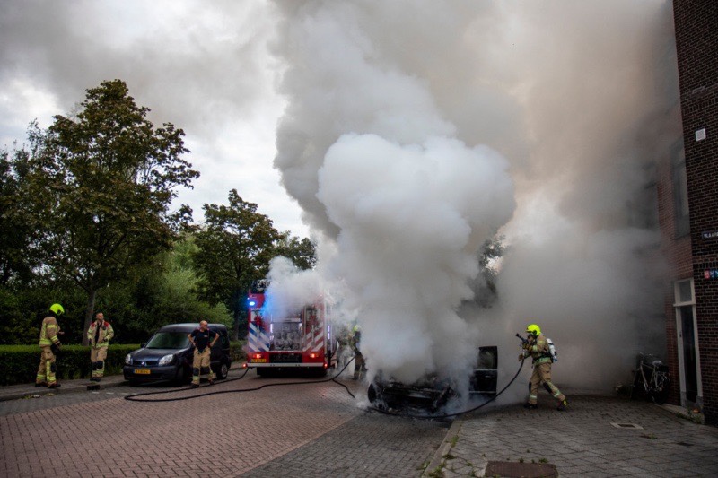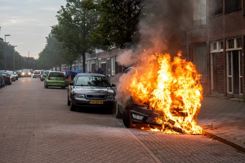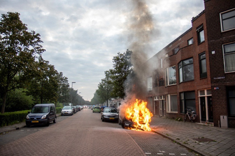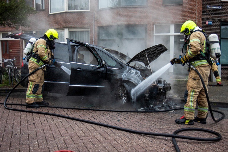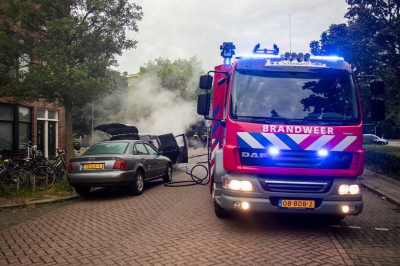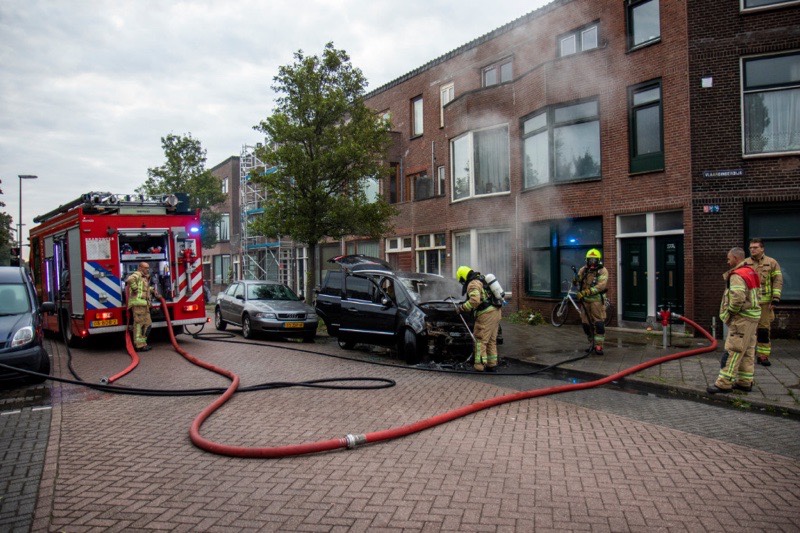 Schiedam – Een geparkeerde auto is donderdagochtend uitgebrand op de Vlaardingerdijk. Bij aankomst van de brandweer sloegen de vlammen al uit de auto.