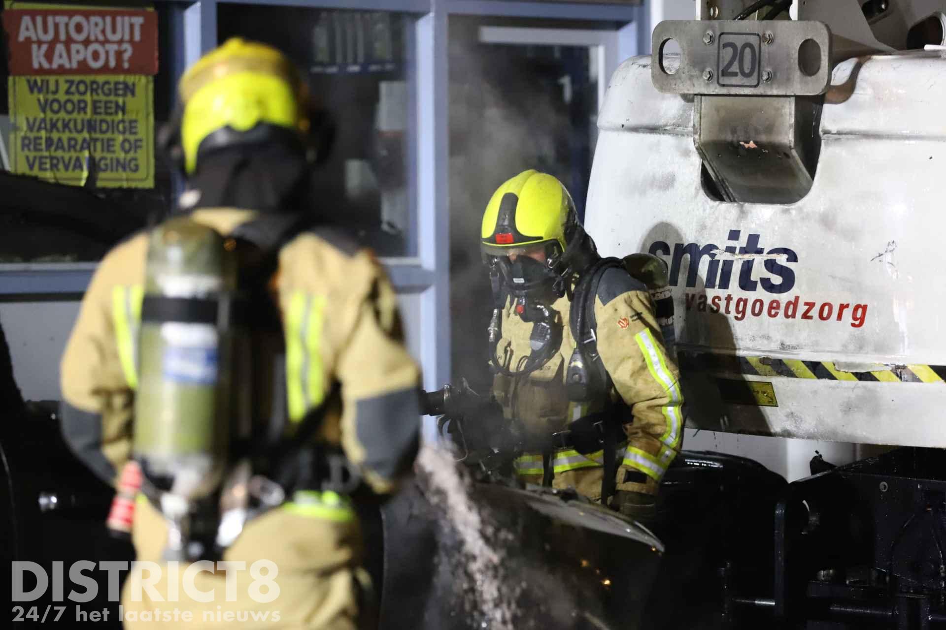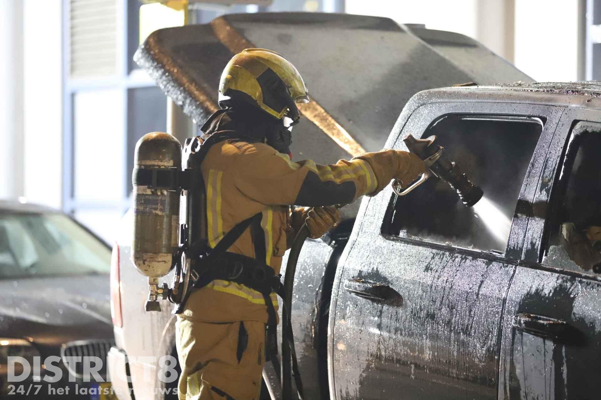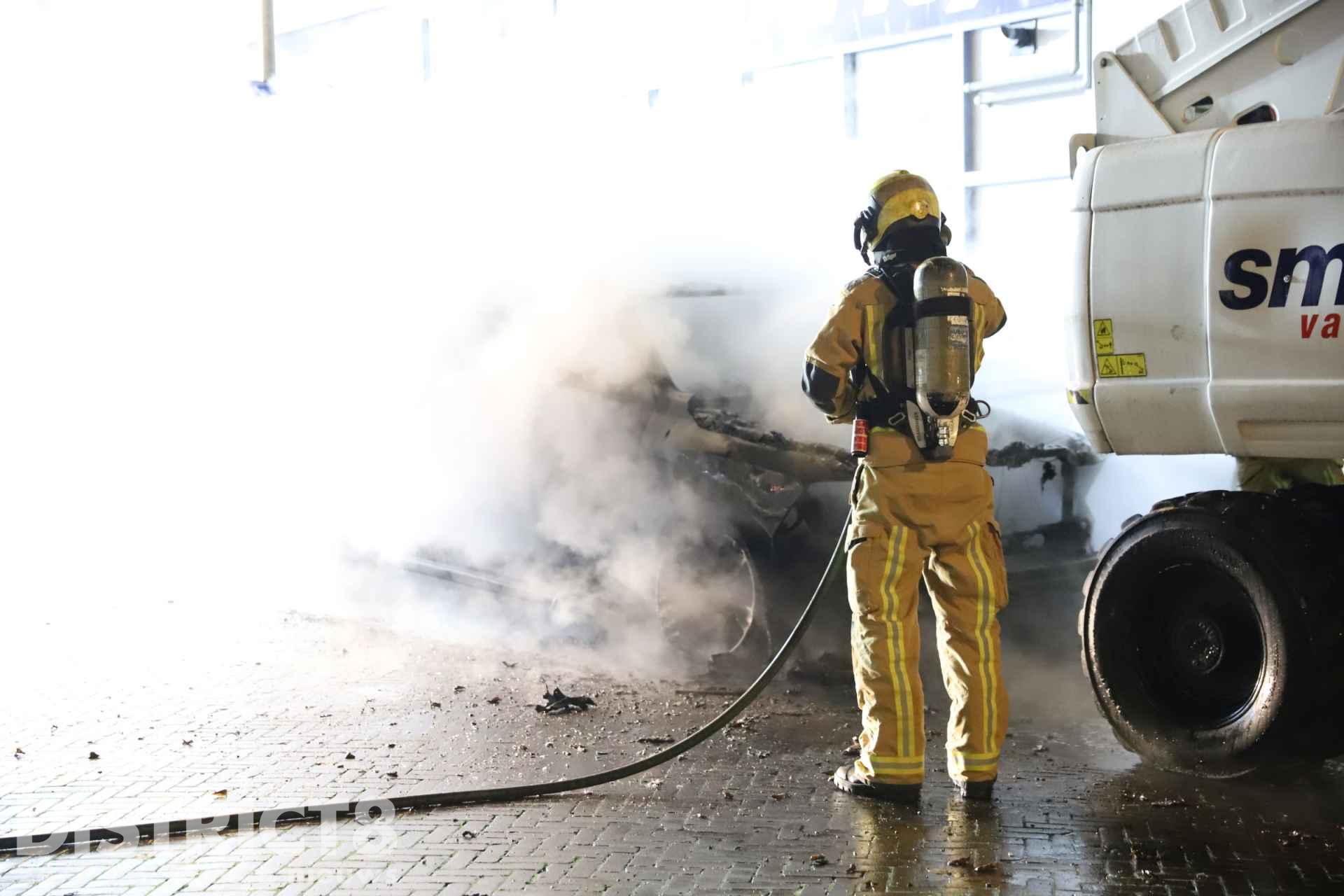 Een hoogwerker die voor de brandende voertuig geparkeerd stond liep lichte rookschade op. De oorzaak van de brand is onbekend, brandstichting wordt niet uitgesloten.