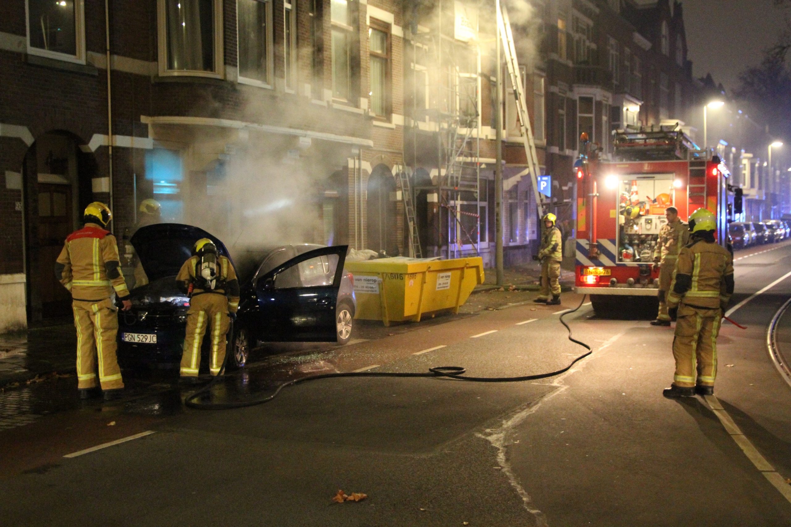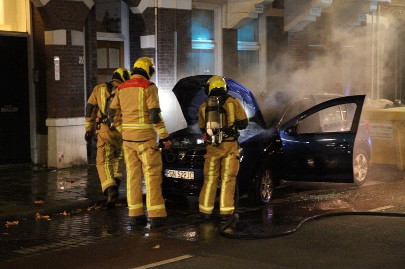 De brandweer werd even voor middernacht opgeroepen voor een voertuigbrand op de Weteringkade. Eenmaal ter plaatse bleek er een geparkeerde auto aan de voorzijde in brand te staan.