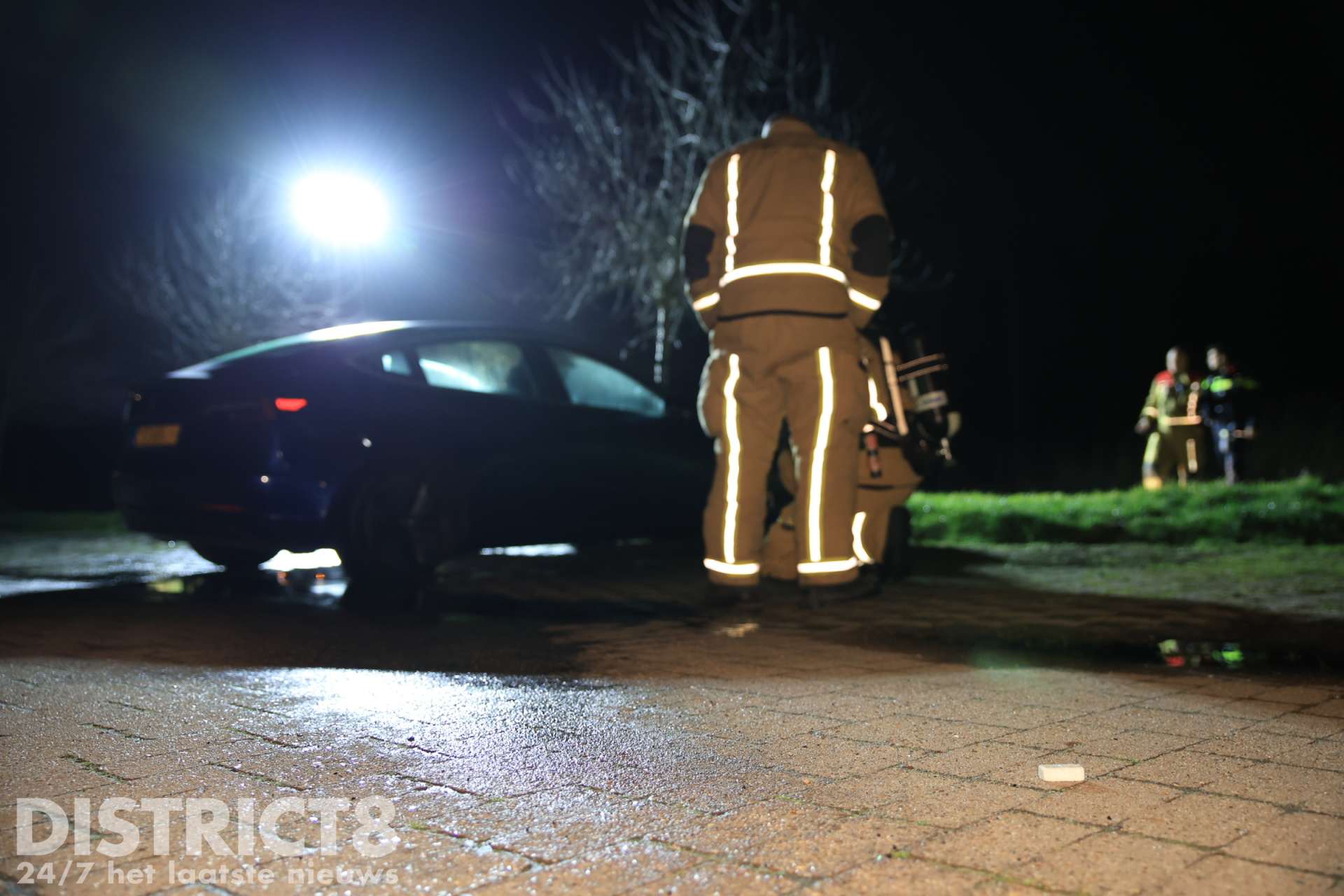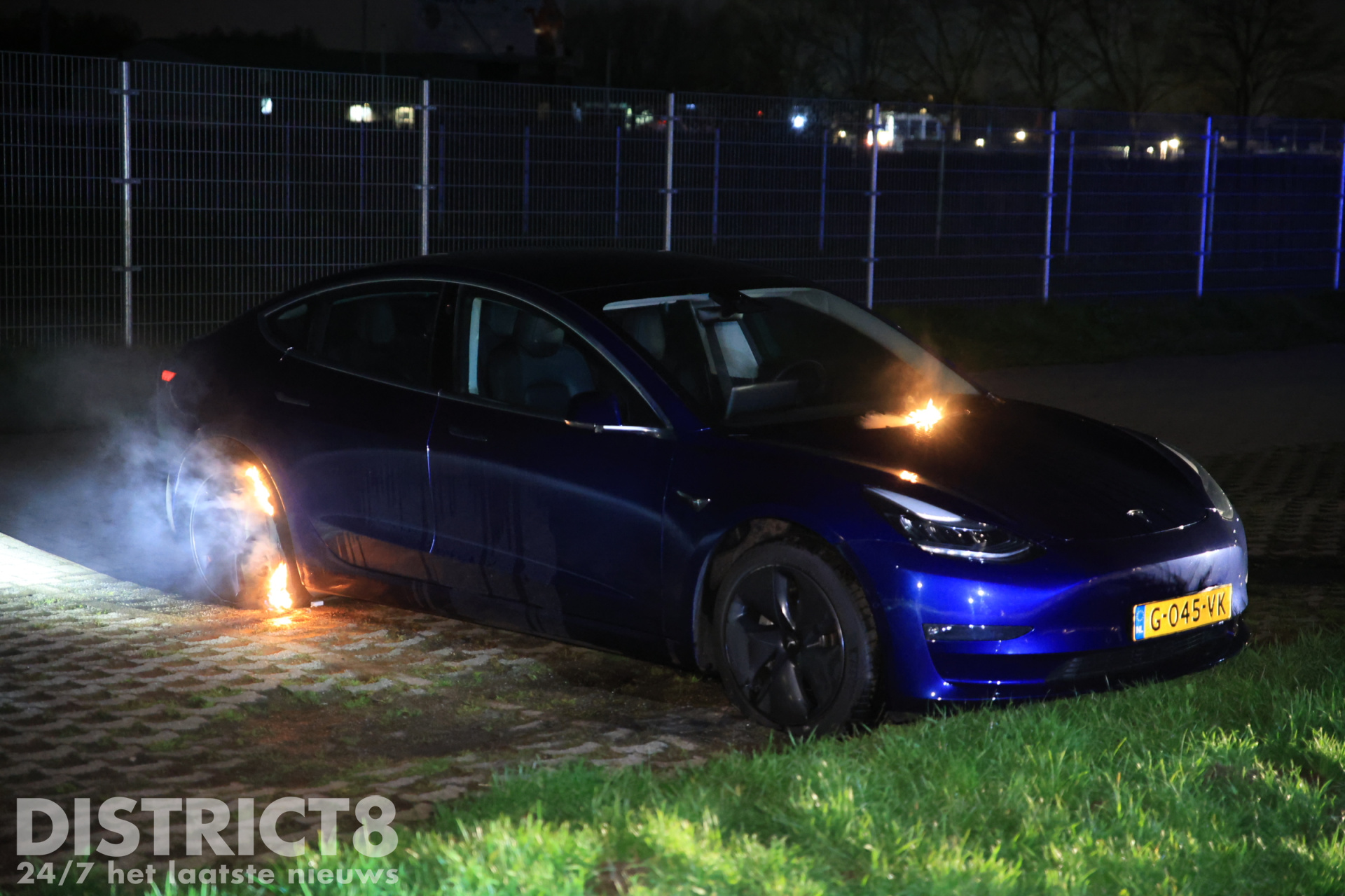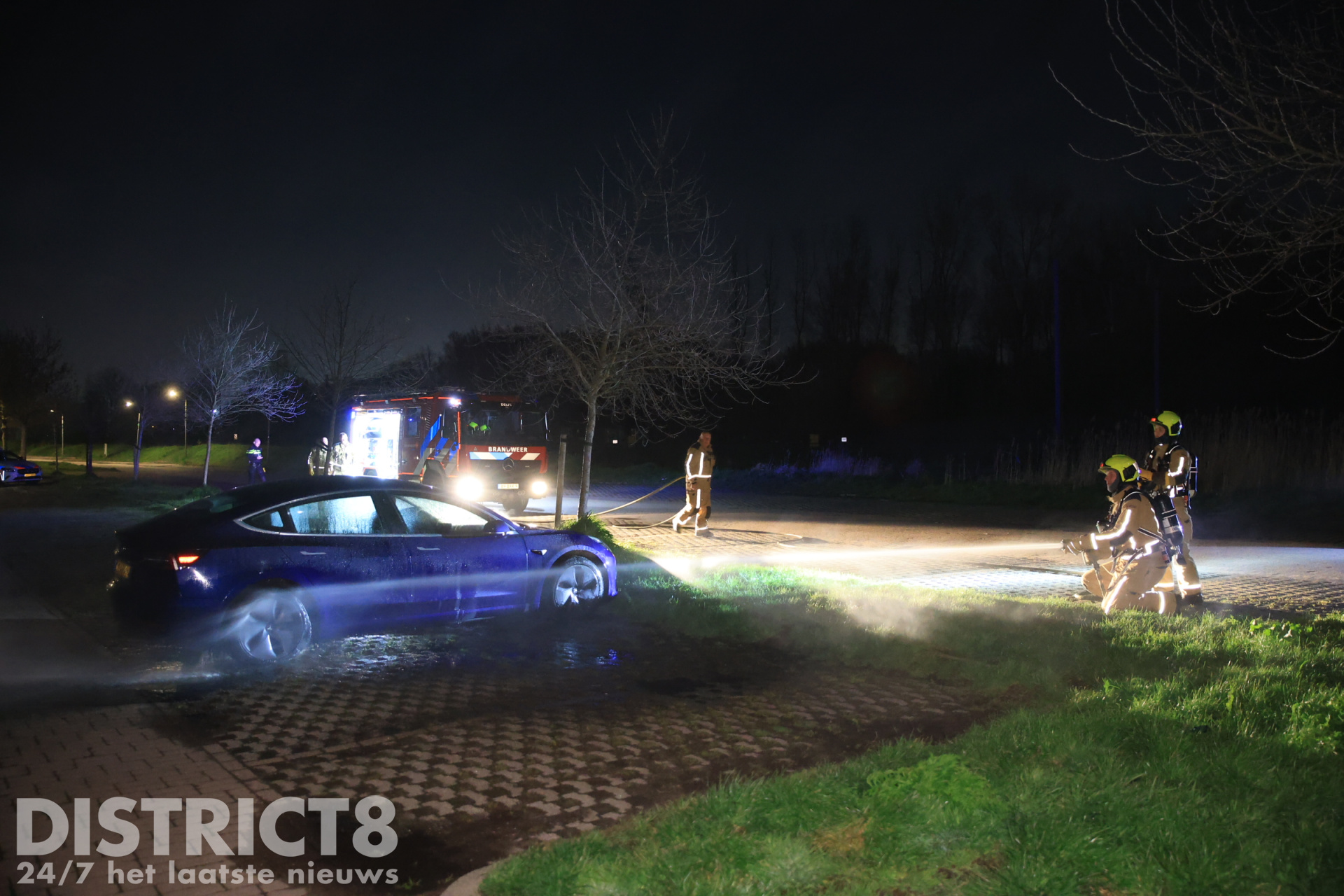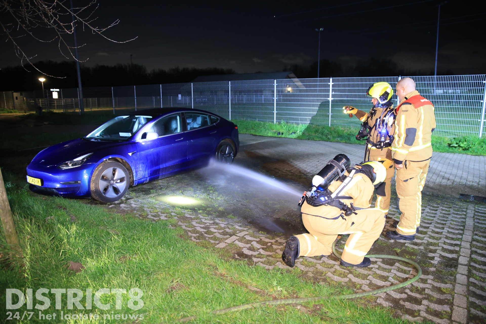 De Tesla stond helemaal achteraan op het parkeerterrein, tegen de voetbalvelden. De eigenaar had zijn auto daar geparkeerd om een rondje te gaan lopen. Bij terugkomst trof hij zijn voertuig in brand aan op meerdere plekken, hierop belde de man snel 112.