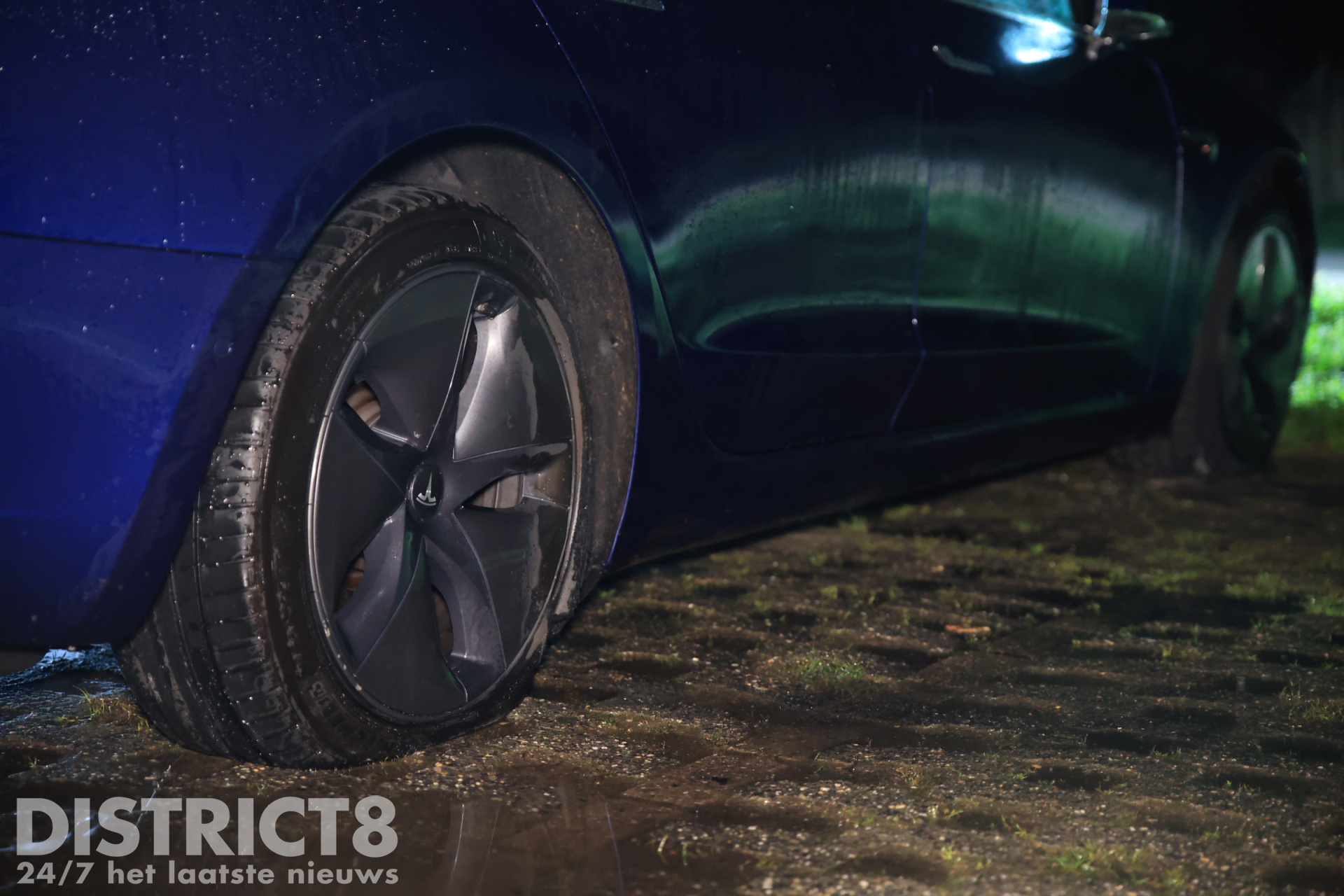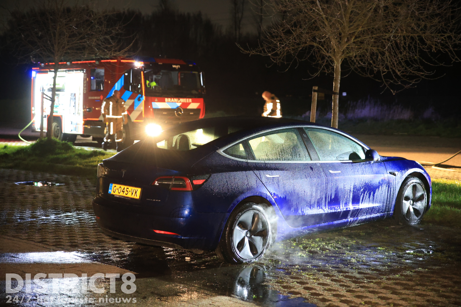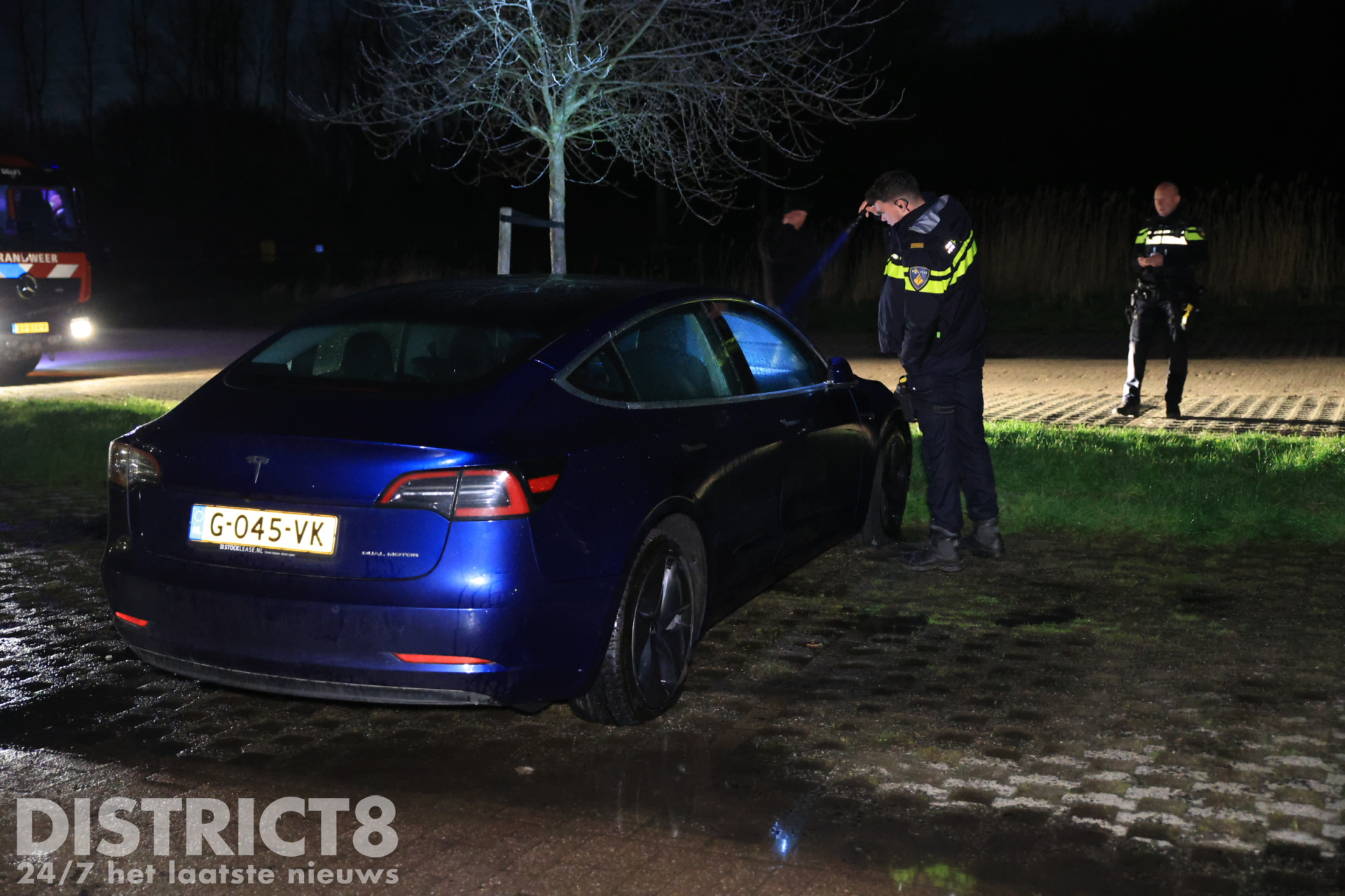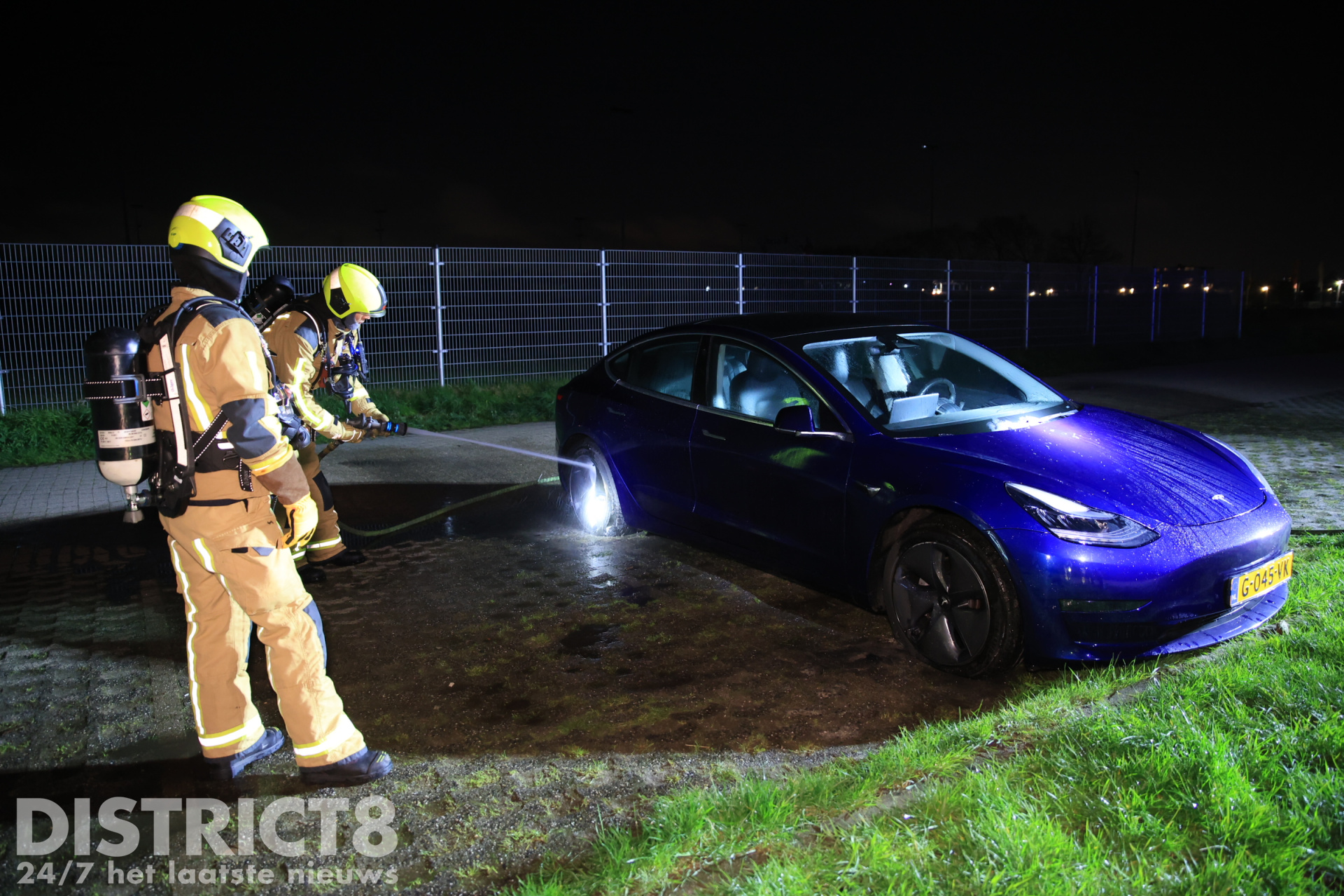 De Tesla stond helemaal achteraan op het parkeerterrein, tegen de voetbalvelden. De eigenaar had zijn auto daar geparkeerd om een rondje te gaan lopen. Bij terugkomst trof hij zijn voertuig in brand aan op meerdere plekken, hierop belde de man snel 112.