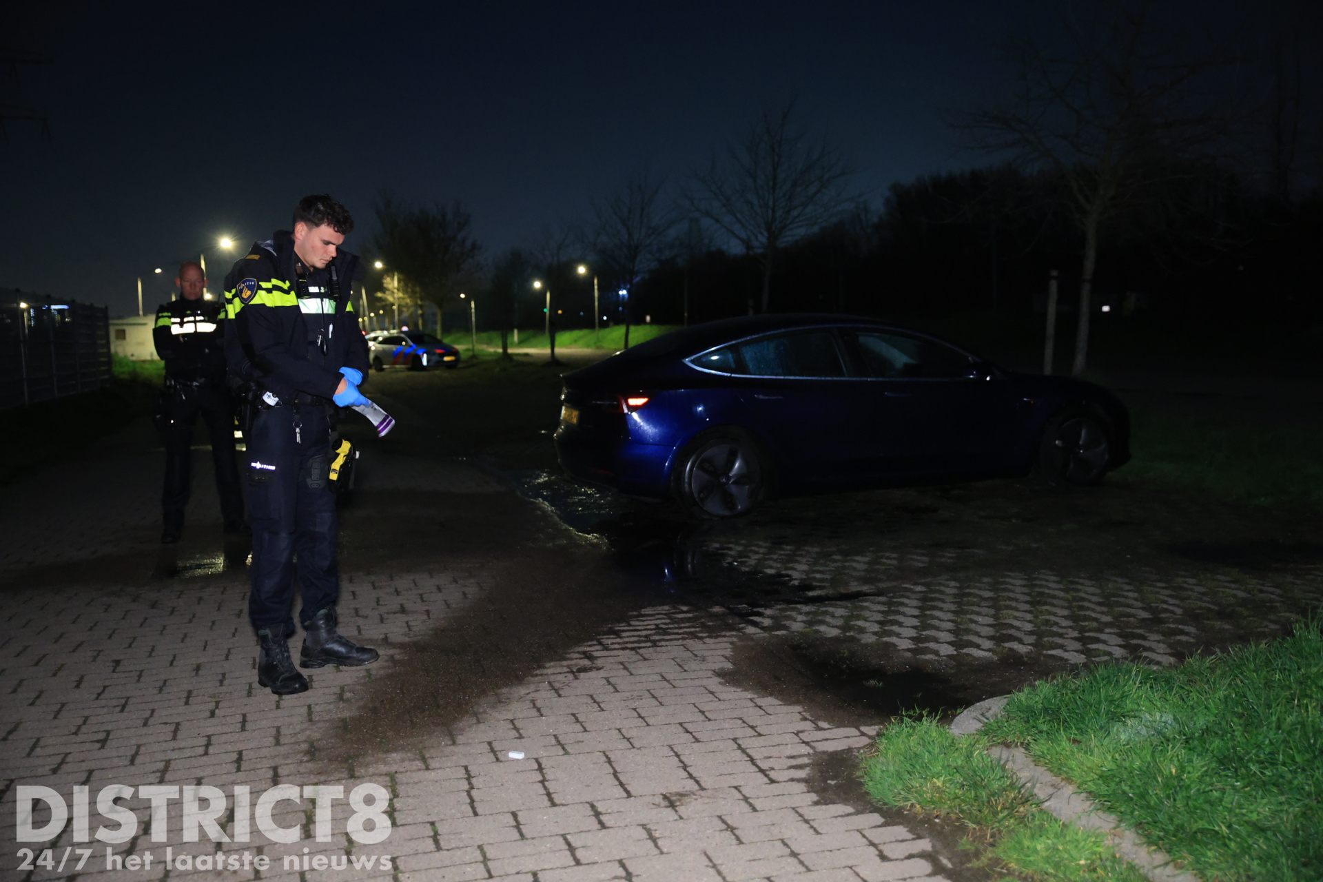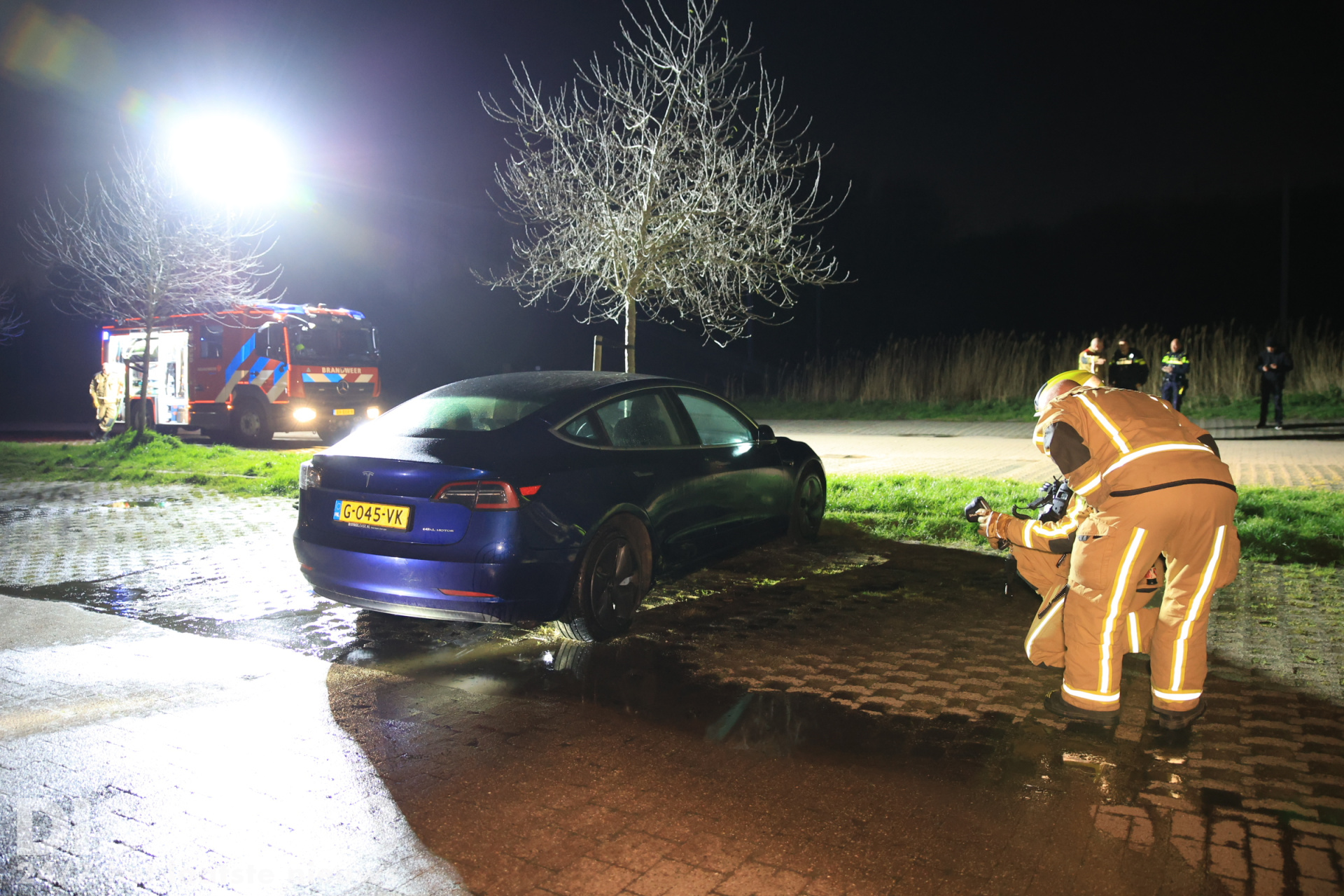 De auto stond bij aankomst wel in brand, maar was nog niet volledig door het vuur verwoest. De brandweer kreeg het vuur snel onder controle. De Tesla raakte daarbij flink beschadigd. Bij de auto zijn aanmaakblokjes aangetroffen, deze zijn door de politie in beslag genomen voor verder onderzoek.