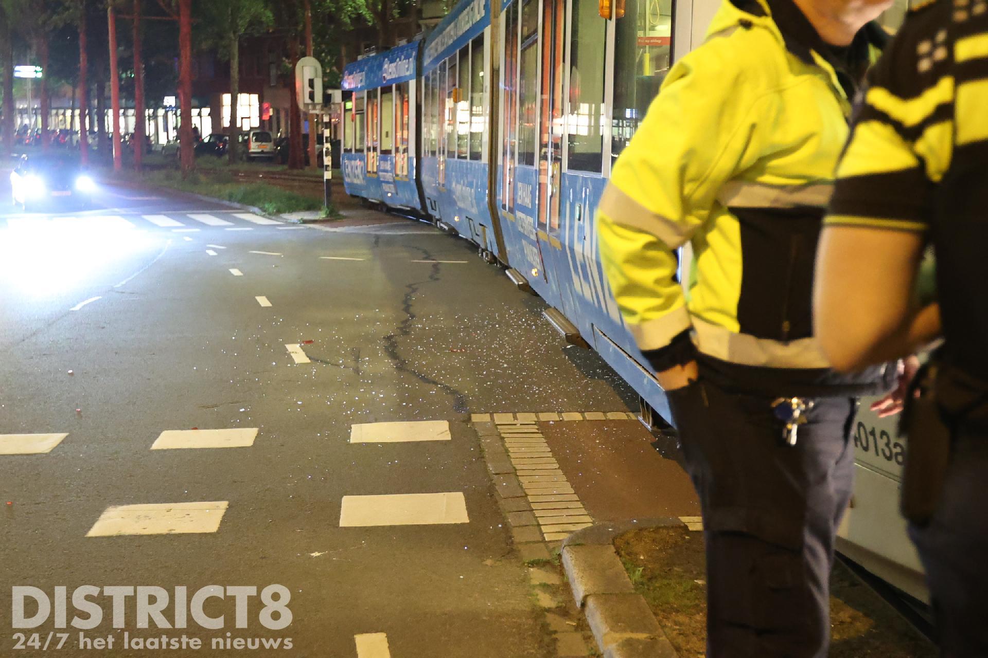 De tram heeft aan de voorzijde flink wat schade opgelopen. De weg ligt bezaaid met glas van de auto.
