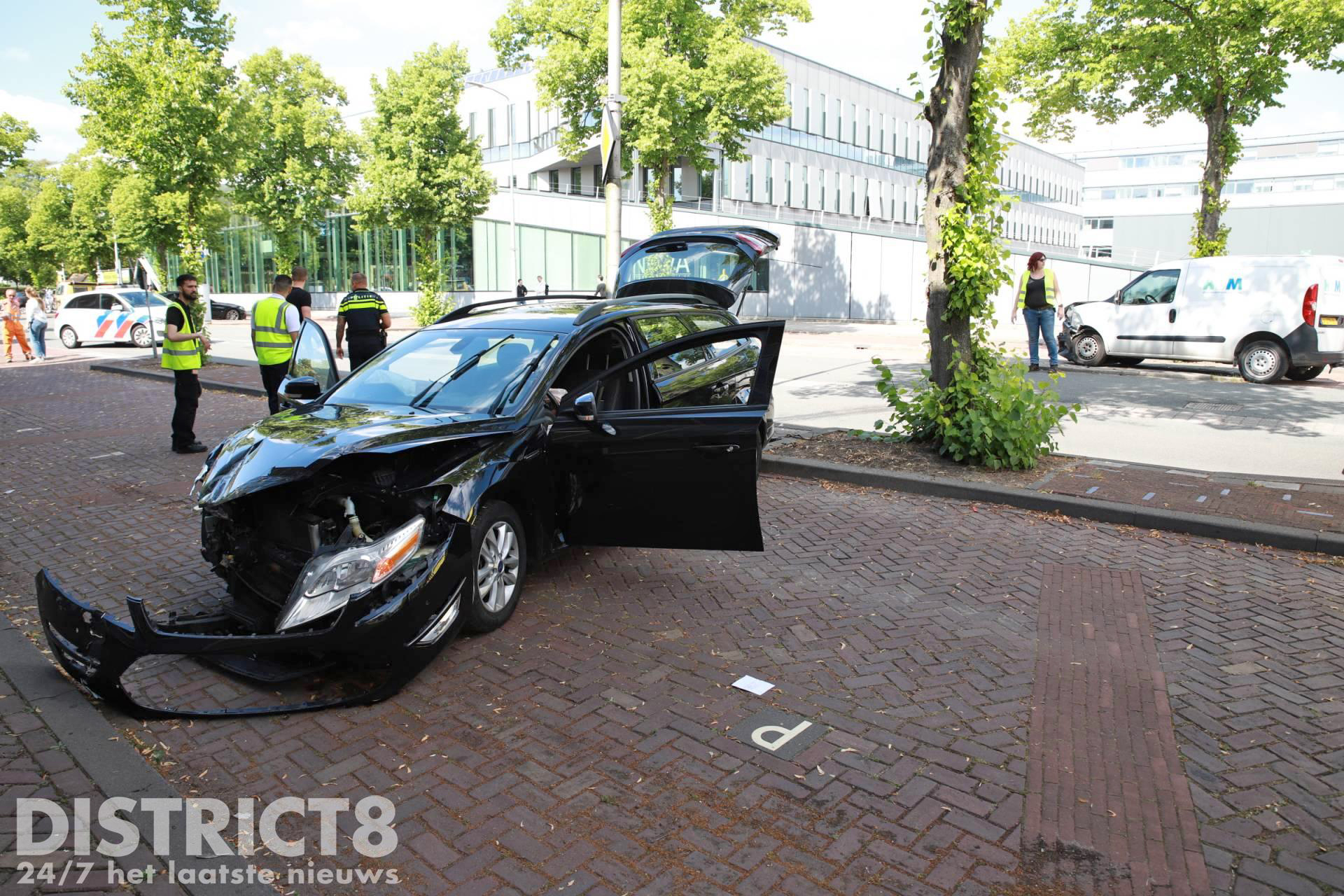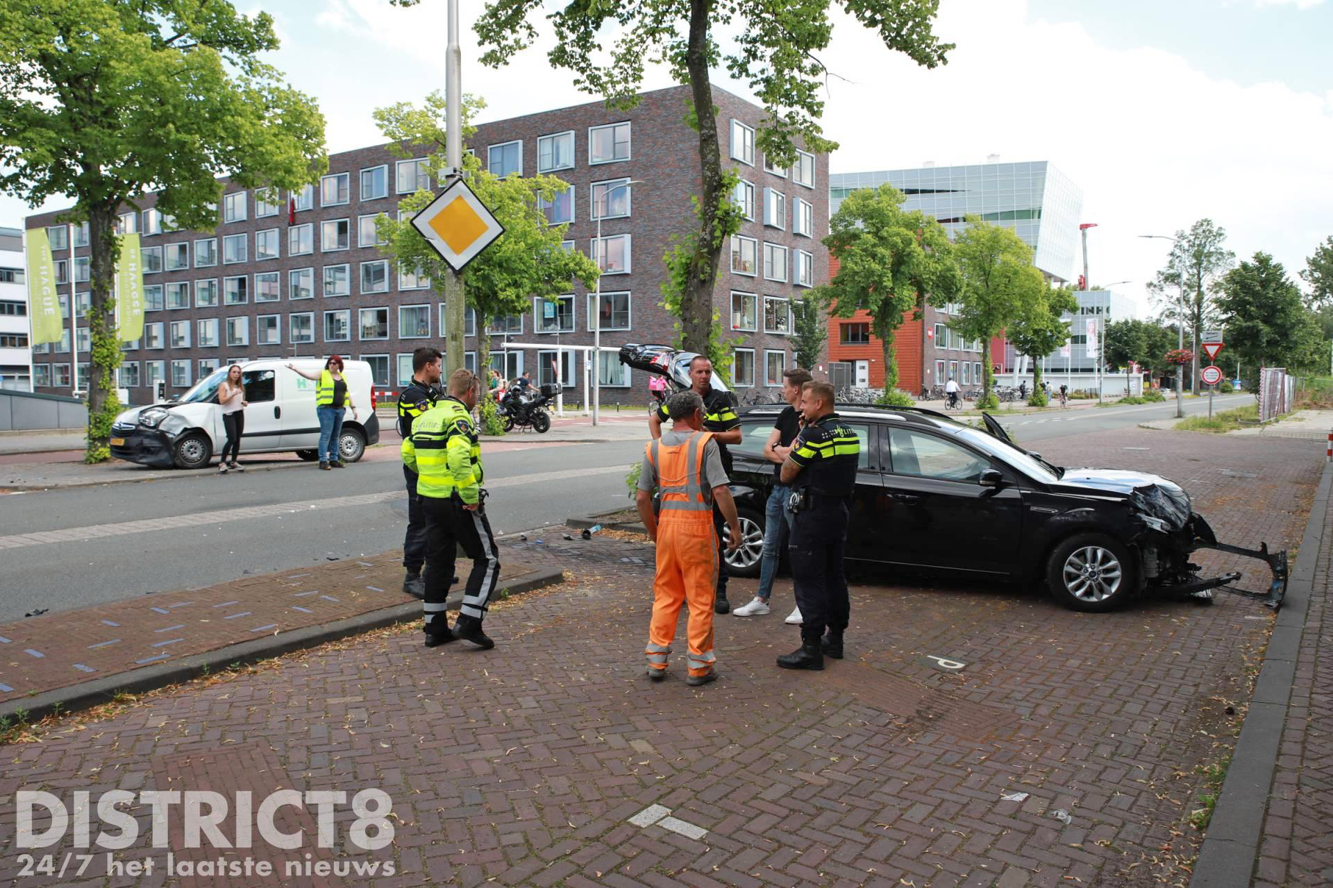 Omstreeks 16:00 ging het mis ter hoogte van de Haagse Hoge School, een bedrijfsbusje klapte daar vol op een auto die een parkeervak in wilde rijden.