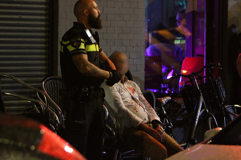 Op het terras werd een man die flink wat bloed op zijn kleding had enige tijd ondervraagd. Toen de man weg mocht werd hij enkele meters verderop in elkaar geslagen. Toen de politie ter plaatse kwam ging de verdachte er vandoor.