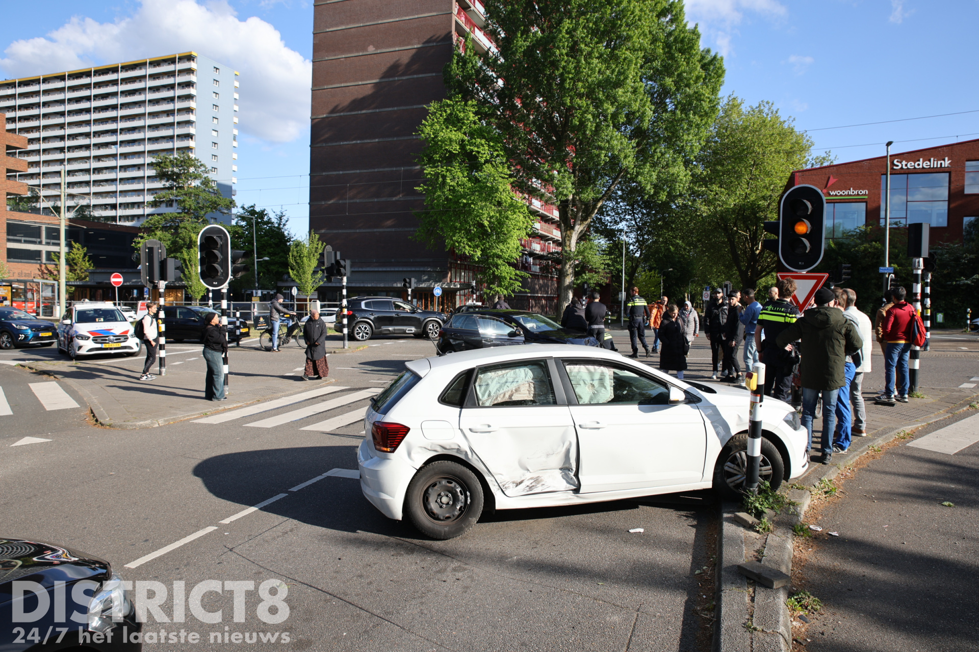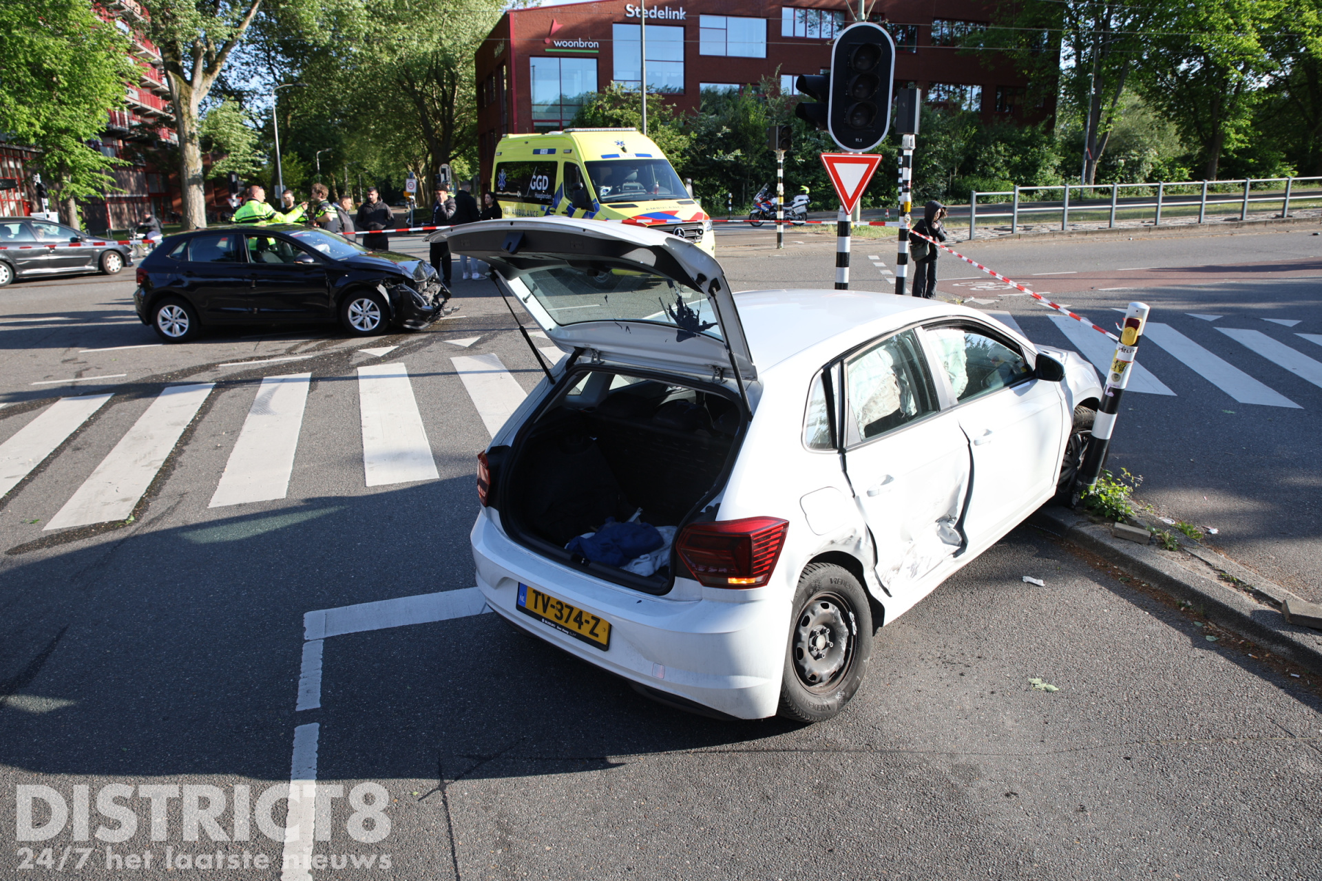 Delft – Op de kruising van de Pierre van Hauwelaan met de Aart van der Leeuwlaan in Delft heeft maandagavond 5 mei een flinke aanrijding plaatsgevonden. Omstreeks 18:15 uur kwamen op de kruising de twee auto’s in botsing met elkaar.