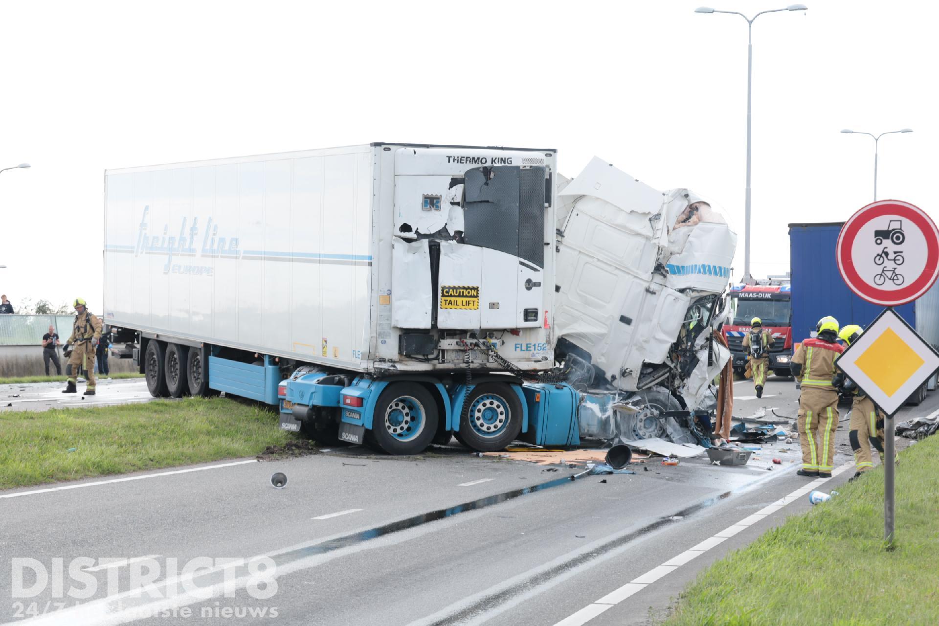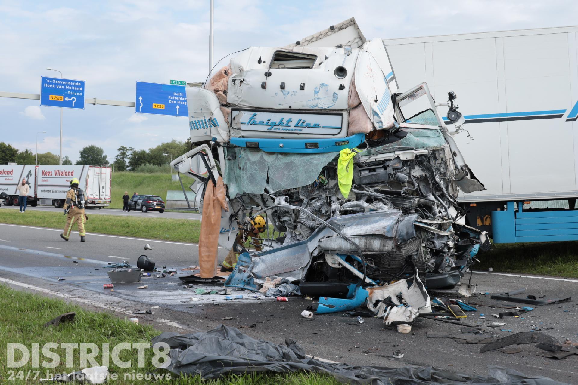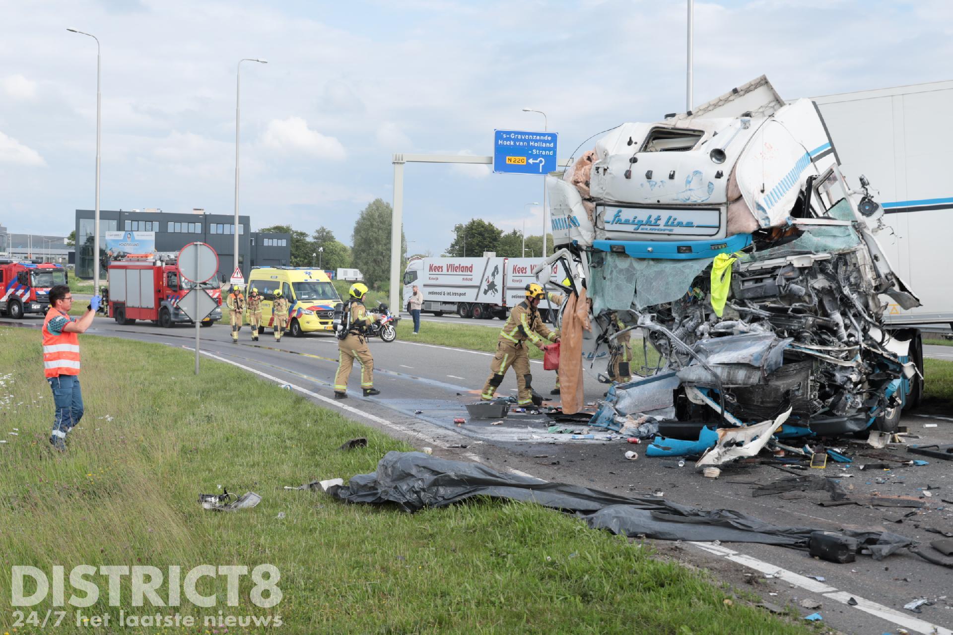 Gigantische ravage na aanrijding met drie vrachtwagens Hoeksebaan Maasdijk