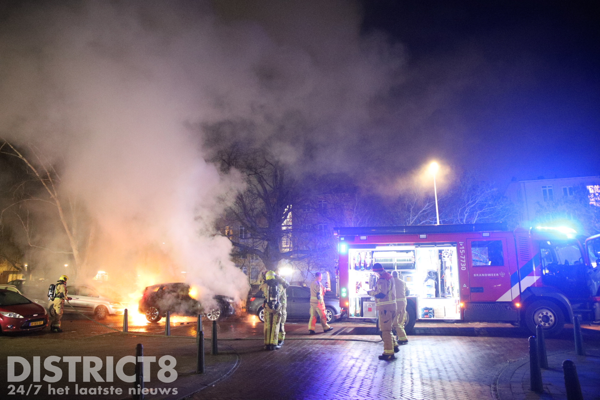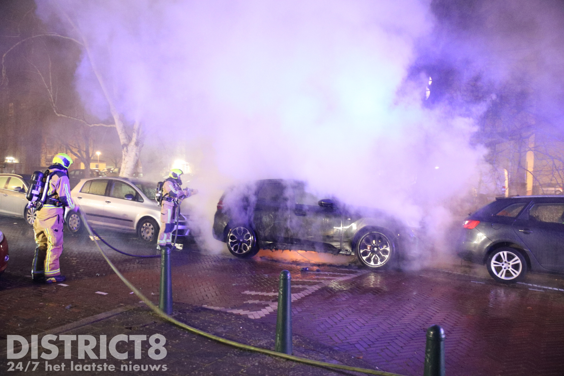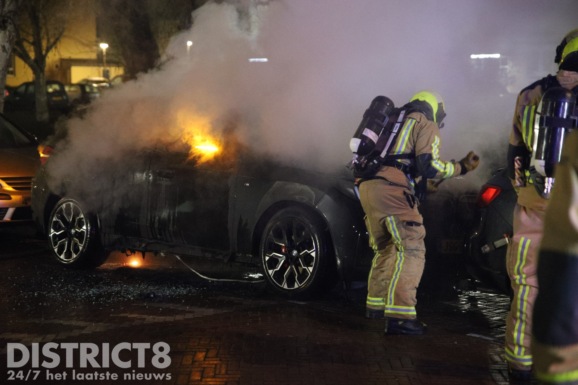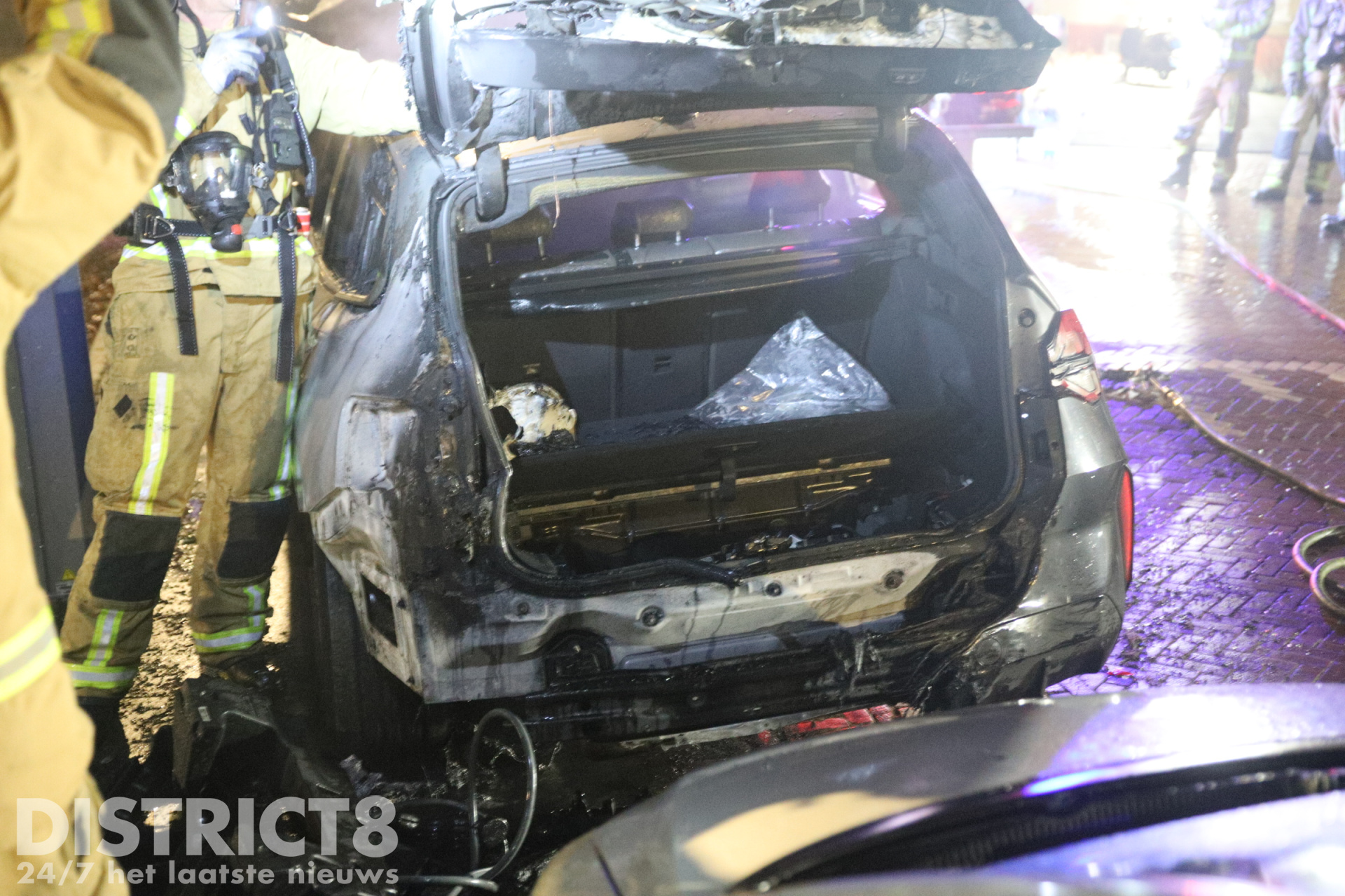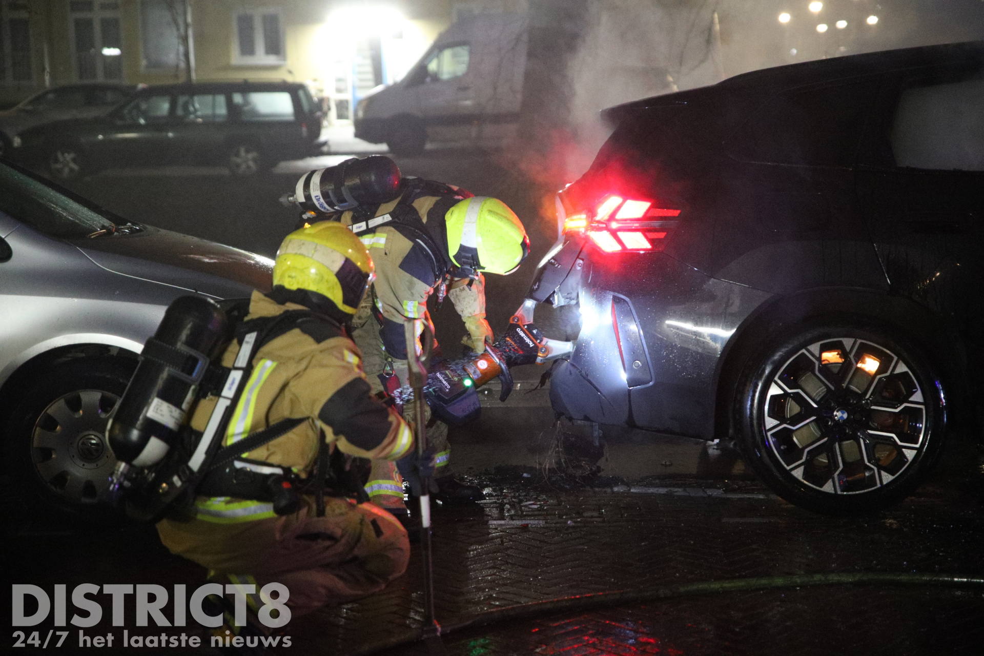 De brandweer was snel ter plaatse en wist het vuur snel te blussen. Om de brand volledig te doven en de accu los te kunnen maken, moesten brandweerlieden de motorkap en de achterklep van de auto openbreken met een spreider.